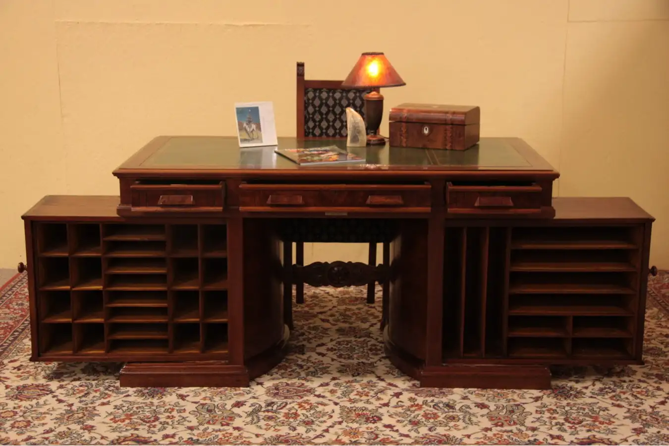This famous American antique furniture is signed with an engraved nickel plate on the front from one of America's most fabled desk makers, Wooton of Indiana.