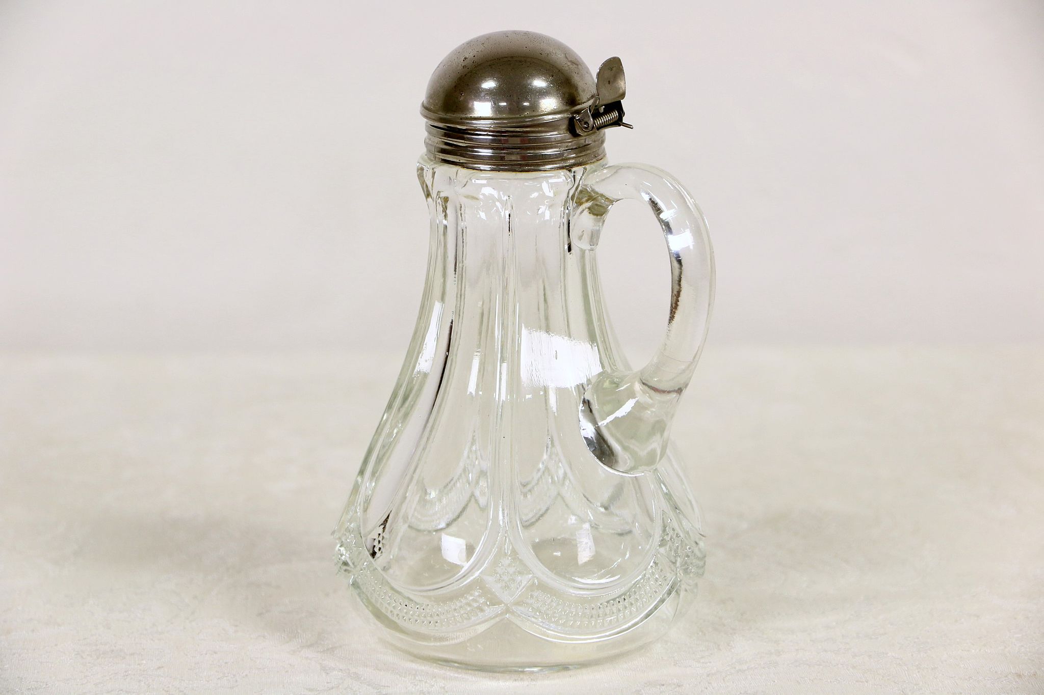 From the 1880's, a Victorian mold blown glass syrup pitcher has nickel mounts. The lid spring is loose but works well on this antique American made pattern glass.