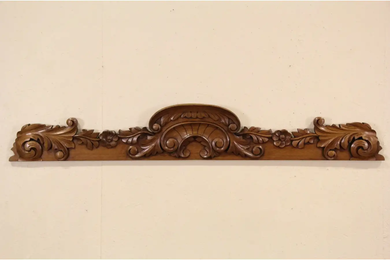 An architectural salvage crest was deeply carved in the 1880's during the Victorian period. Solid walnut, the light toned finish is in excellent condition.