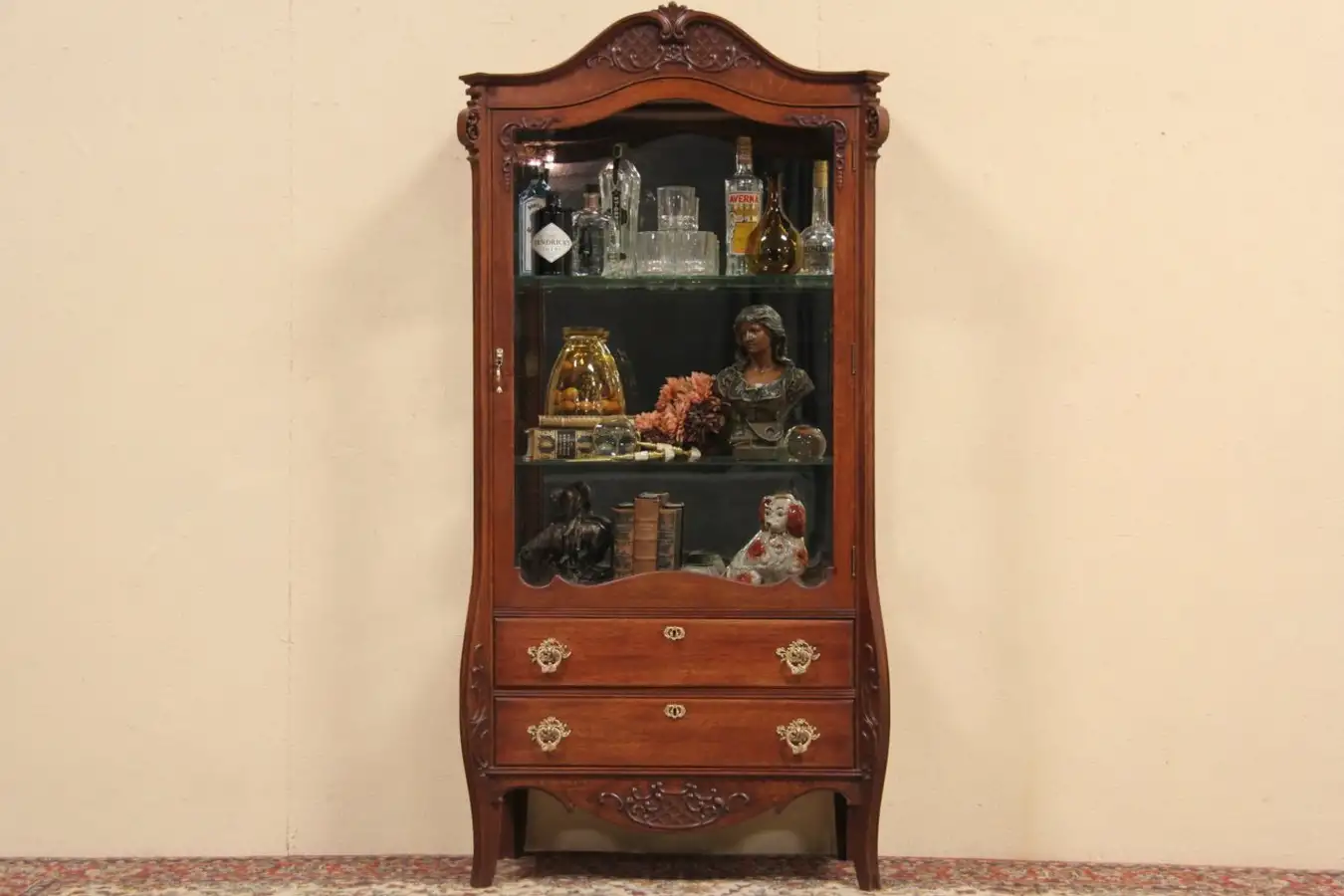 Detailed carving is subtle and artistic on this American made furniture. The old finish is very well preserved with very little wear. Only an occasional wipe with a soft dry cloth is needed to maintain its warm luster. There is a loss to the right front foot. Drawers have dovetail joints, the door lock and key still work. Inside are two plate glass shelves that adjust on metal pegs.