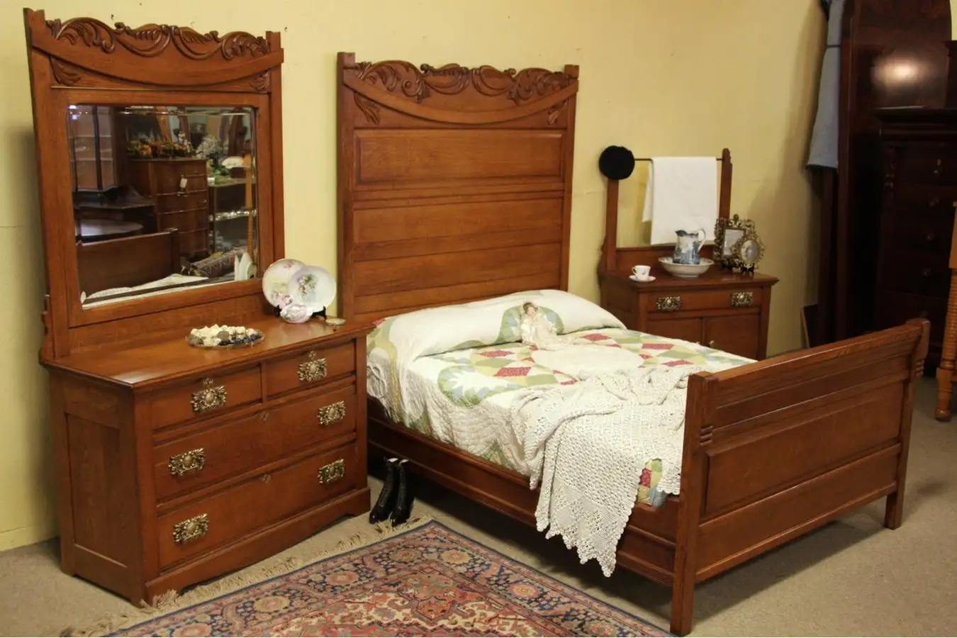 Beautifully crafted of solid quarter-sawn oak about 1895, this lovely Victorian bedroom set includes a full or double size bed, dresser with beveled mirror, and a washstand or commode with towel bar.