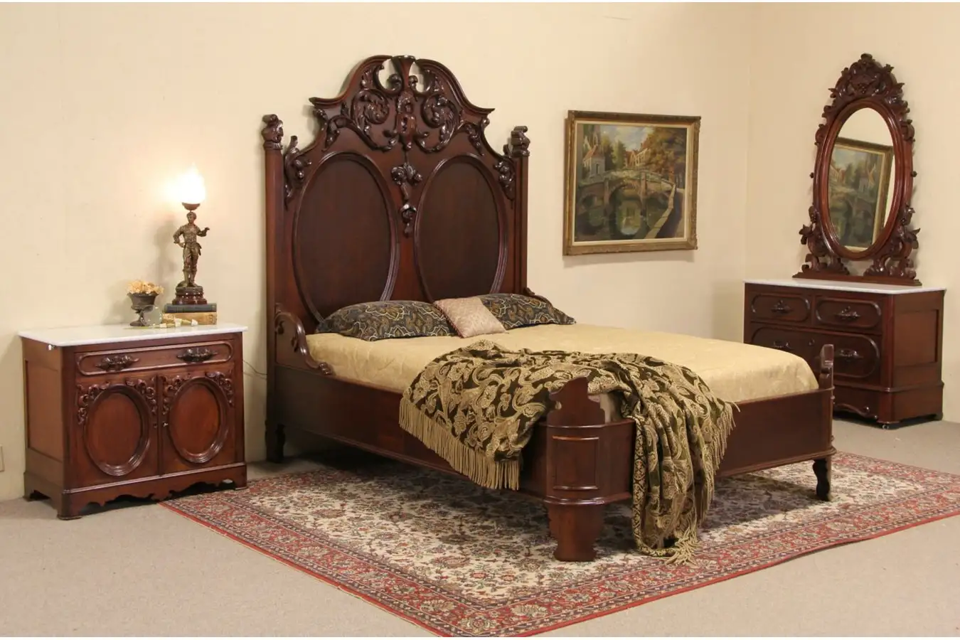 A magnificently carved three piece bedroom set from the 1860's has grapevine, rose and bird motifs, all artistically hand sculpted in high relief.