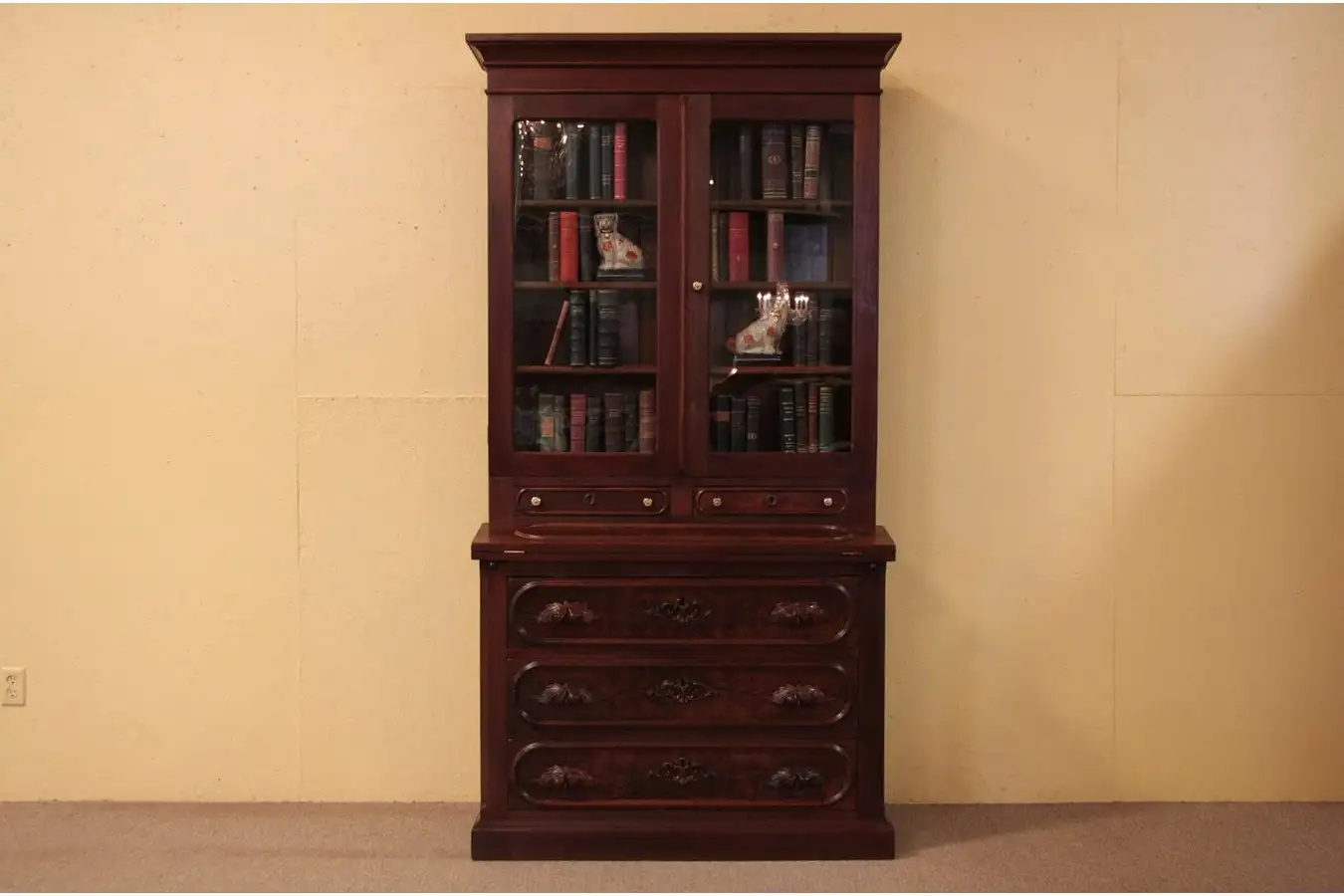 A stately Victorian secretary desk has a bookcase top. Hand carved of solid walnut with book matched burl panels, this exquisite secretary also has fruit and leaf pulls and keyhole escutcheons.