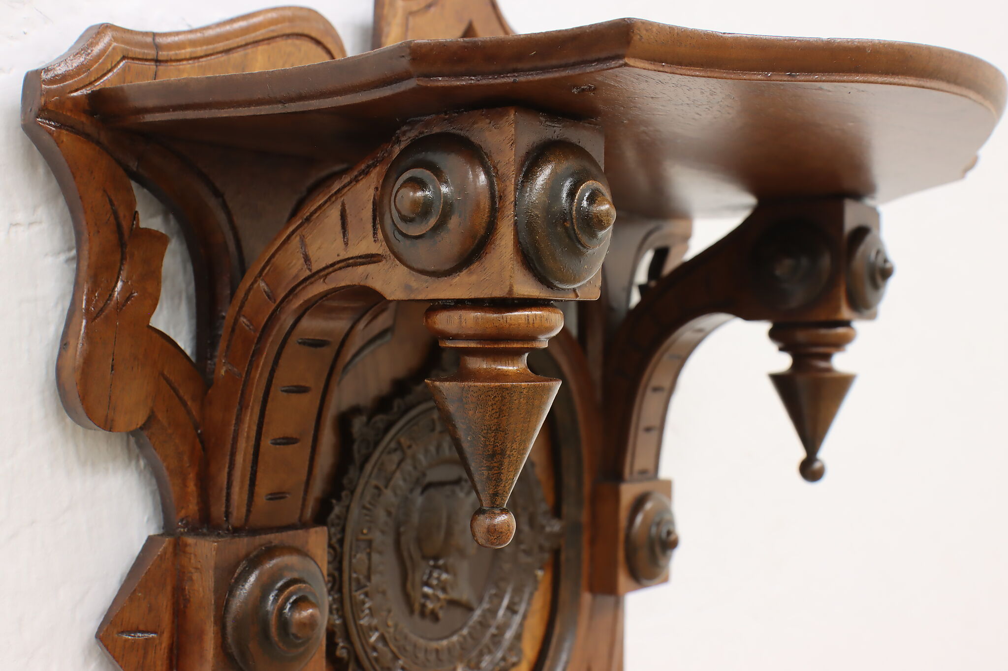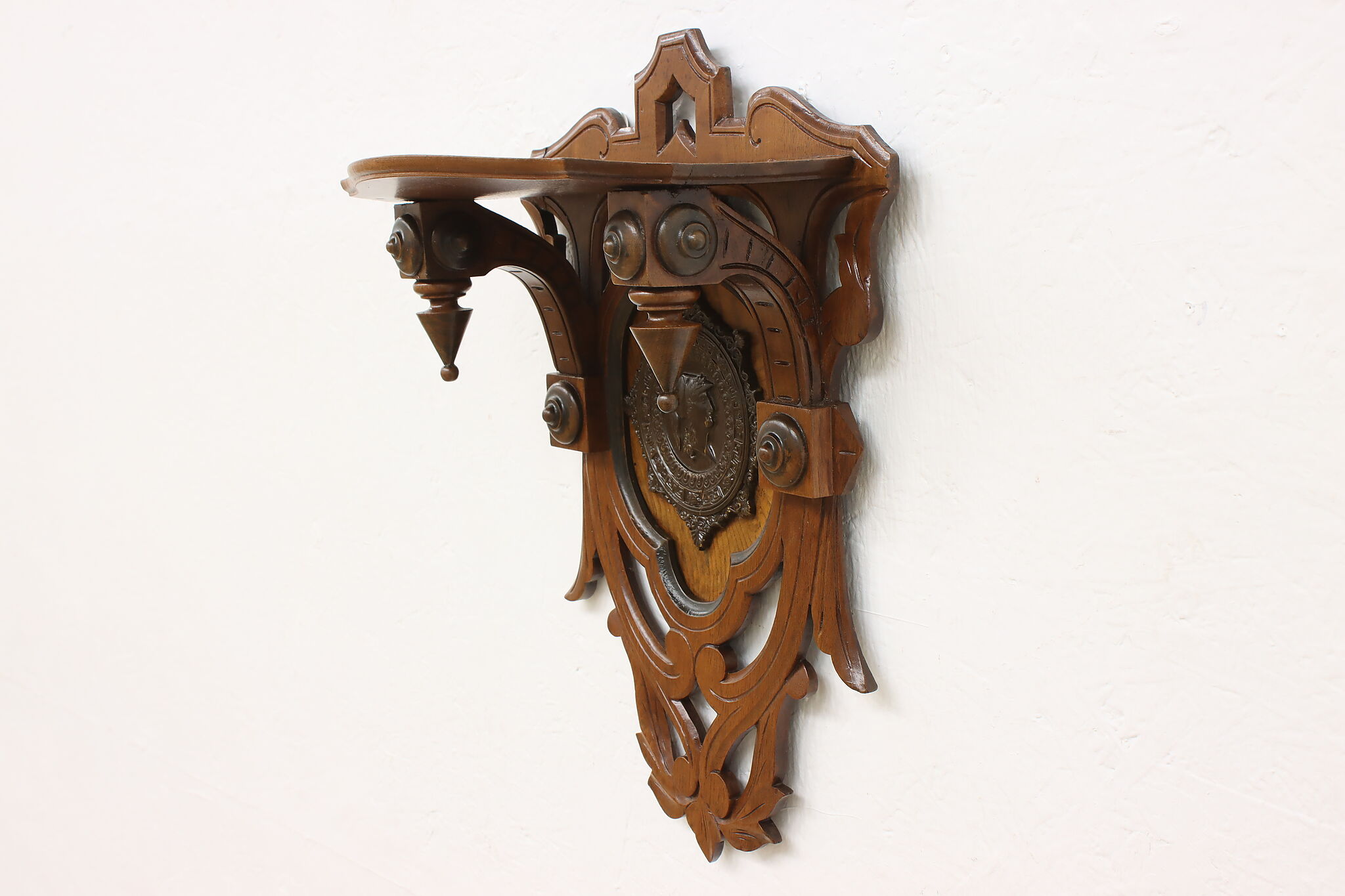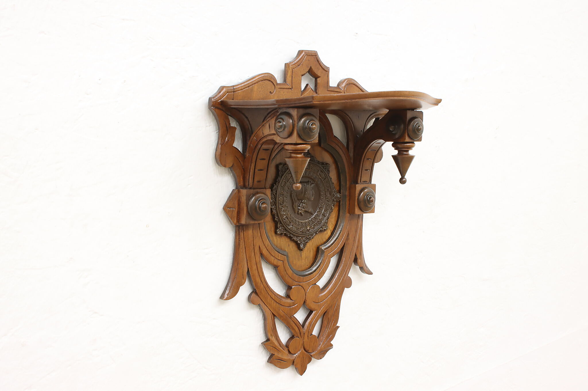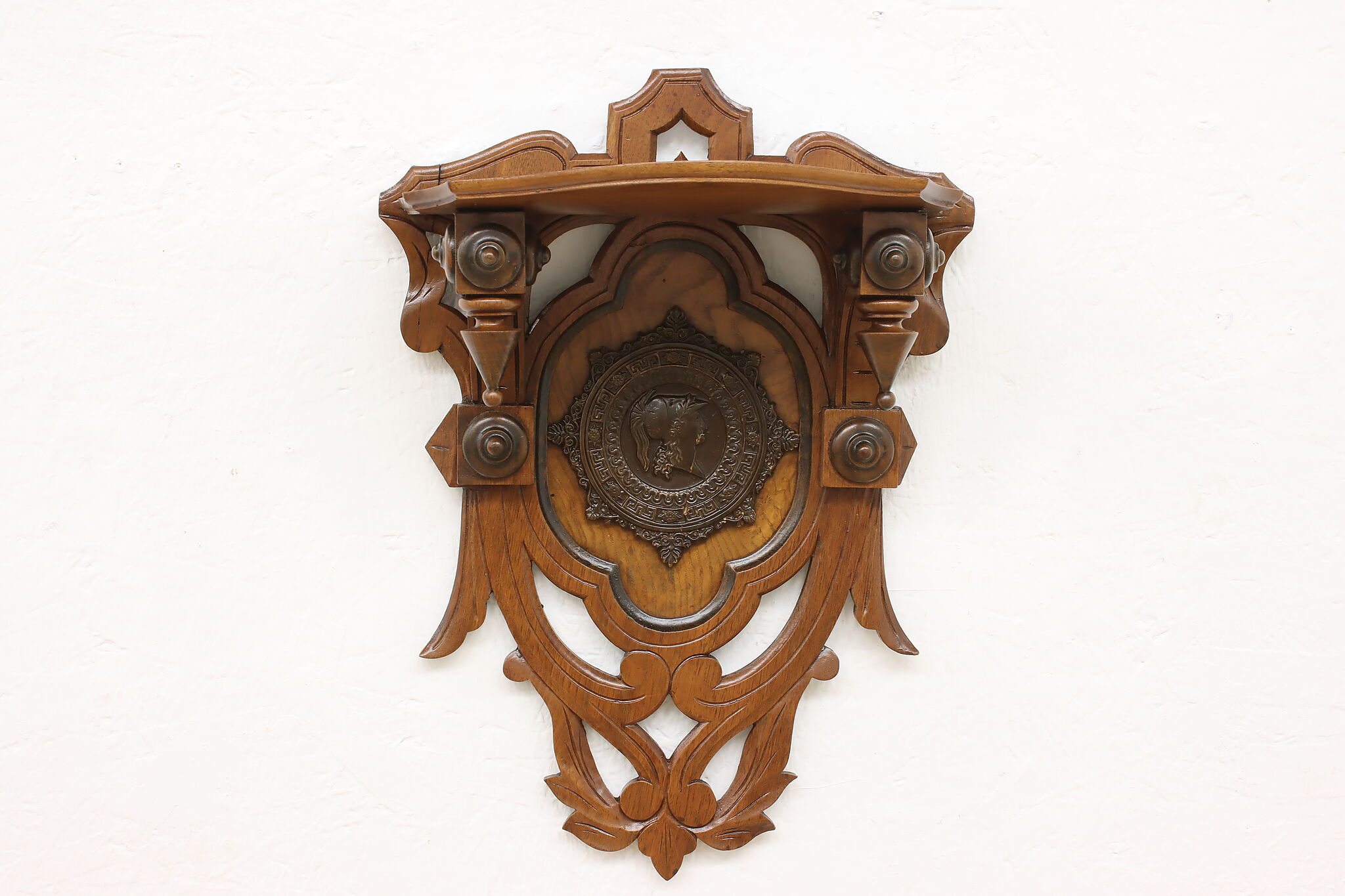 This Victorian period wall shelf has a beautiful composite medallion of a classical woman.