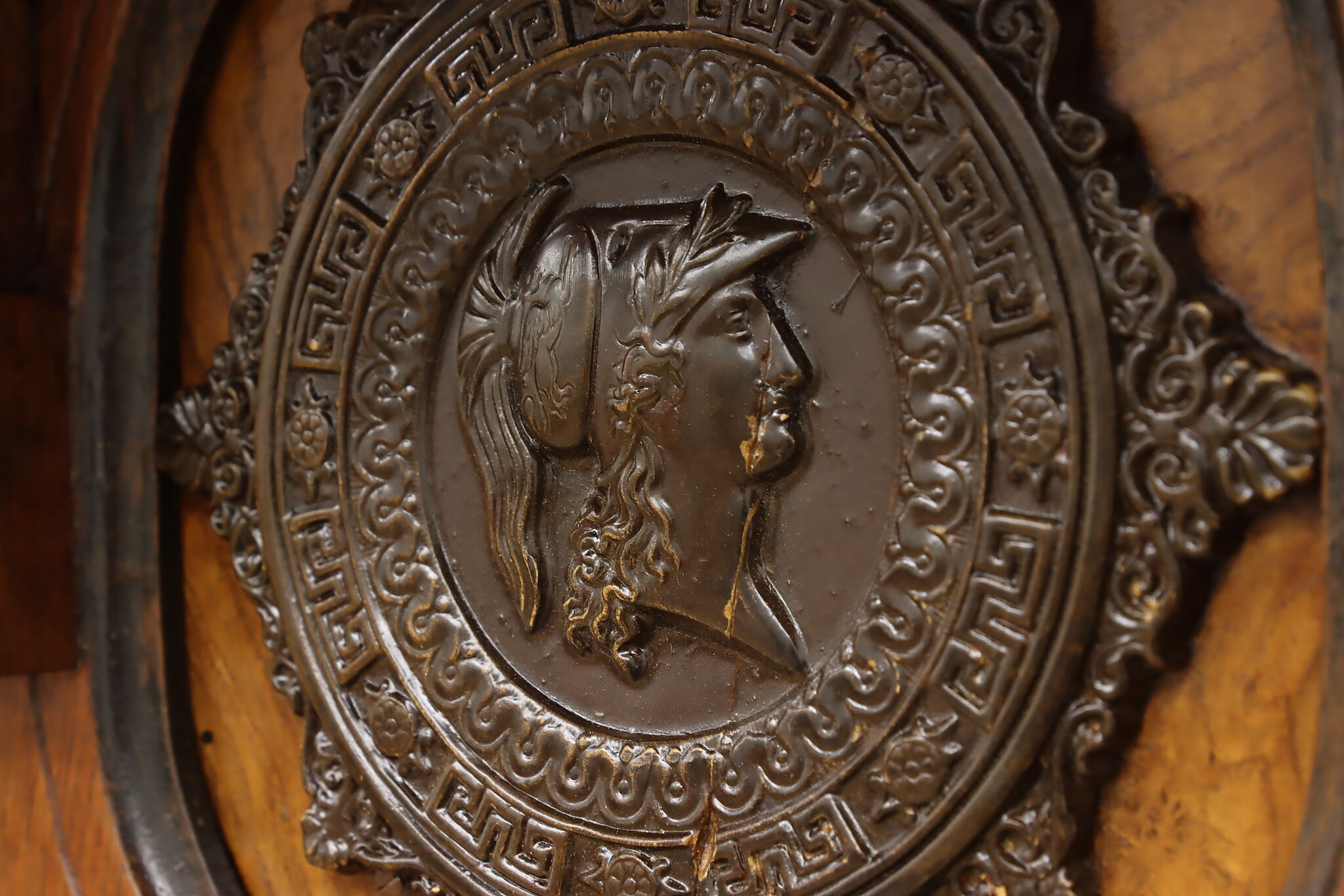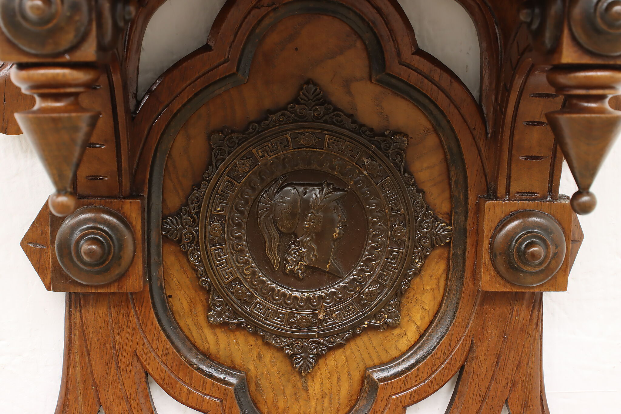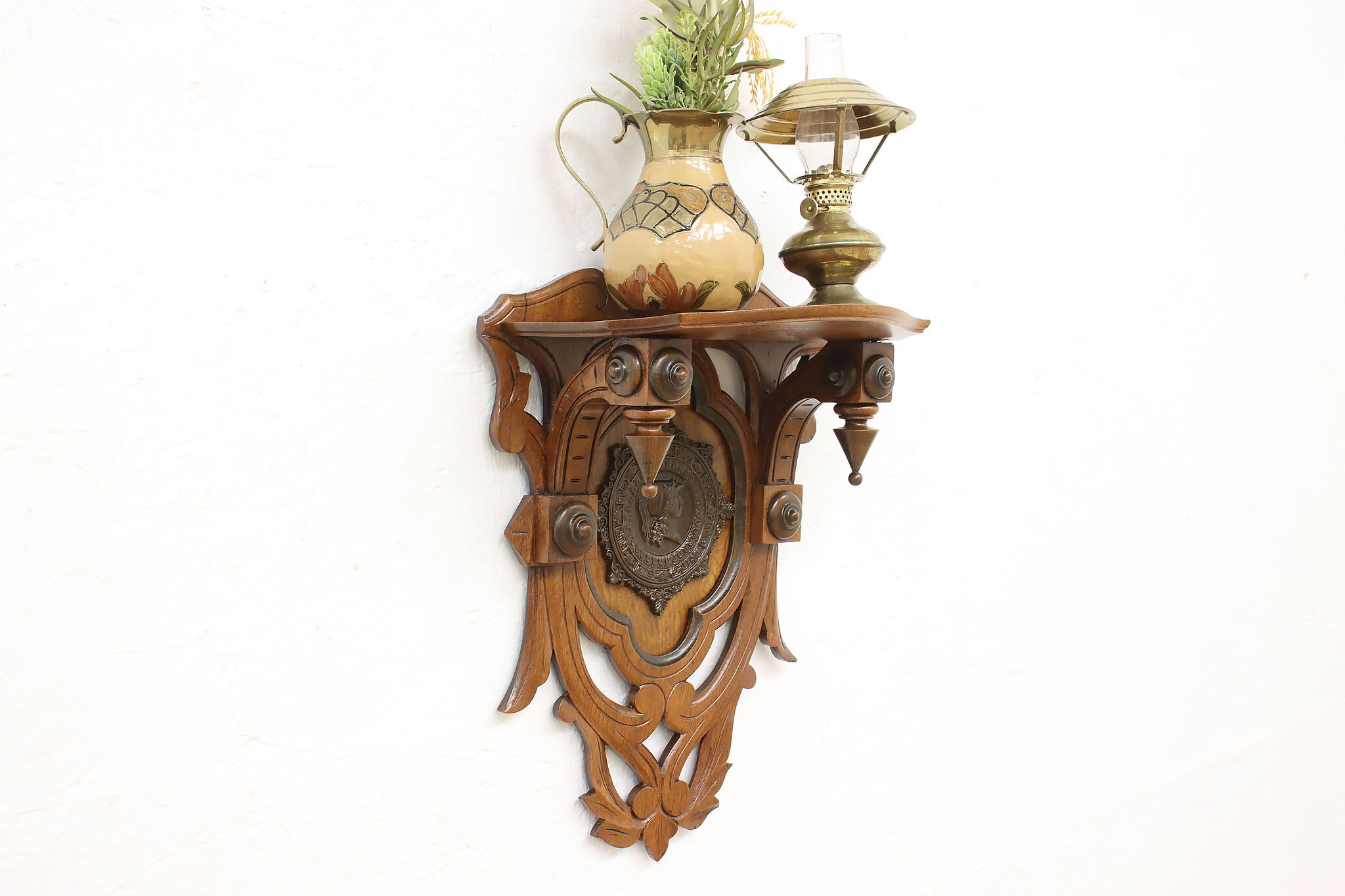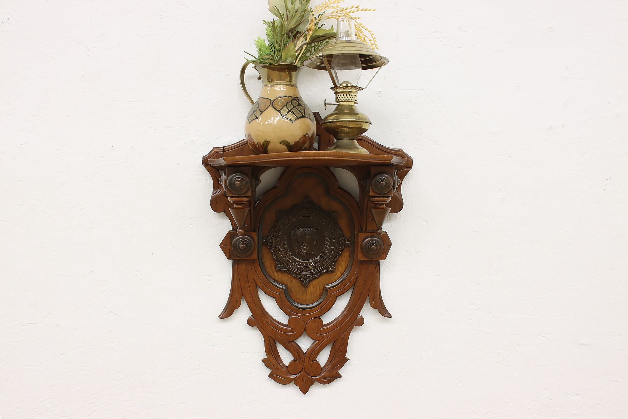 This Victorian period wall shelf has a beautiful composite medallion of a classical woman.