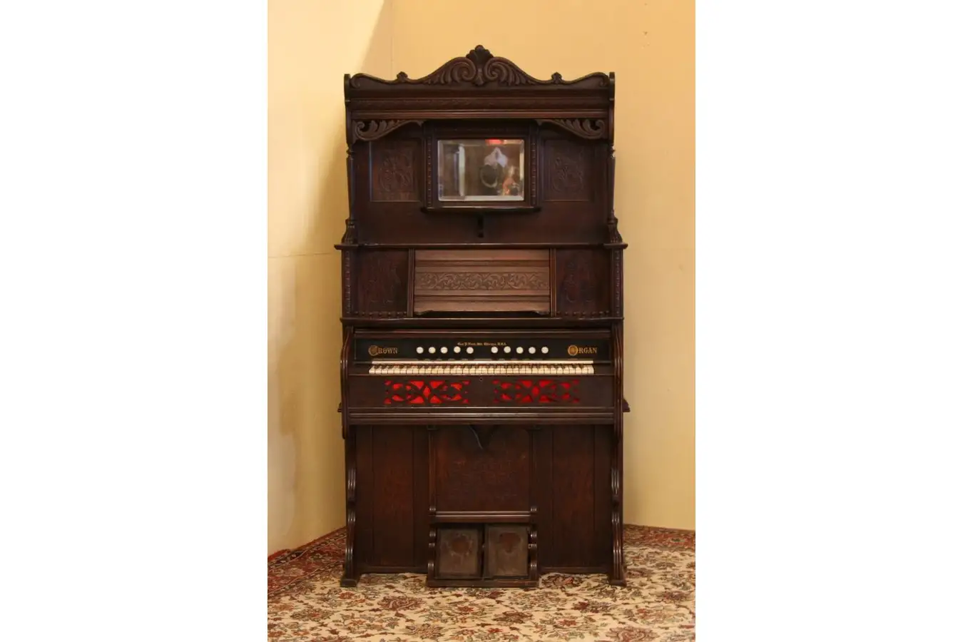 This lavishly carved solid oak antique is signed "West of Chicago," and has not been restored. The beveled mirror and the upper gallery are removable for shipping. On the backside is the 10 year warantee, which has elapsed. Part of the cast iron frame on the right foot pedal is missing, see photos. There is music storage behind the music rest right and left are two shelves for lamps.