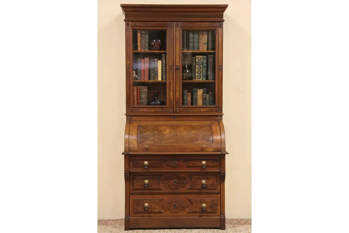 Authentic Victorian period furniture from about 1875, this cylinder or barrel roll top desk has a bookcase top. It is solid walnut accented with burl panels, the finish is in excellent condition with a few mars at the edges for character.