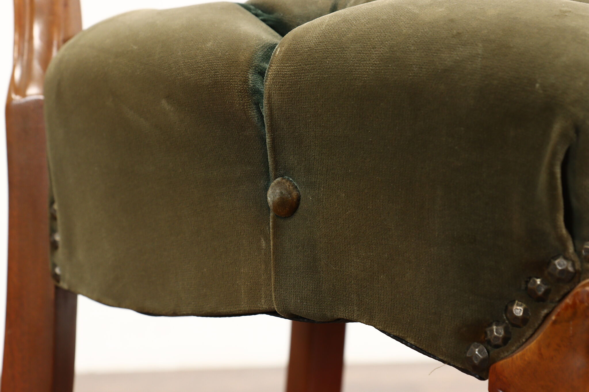 A Victorian 1850s design side chair has a beautifully carved rose motif crest and dates from about 1940.