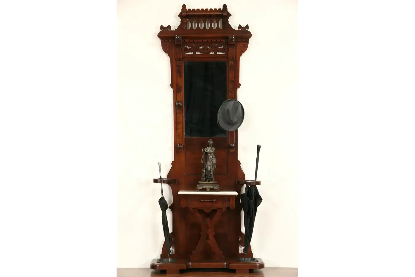 From the late Victorian or Eastlake period about 1875, this foyer or hall stand would also be functional in a bath or dressing area. It has everything - a mirror, umbrella and cane stands, marble top and original mirror.