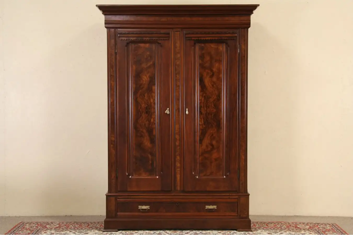 From the late Victorian or Eastlake period around 1880, this splendid armoire or wardrobe is solid walnut with matched burl panels.