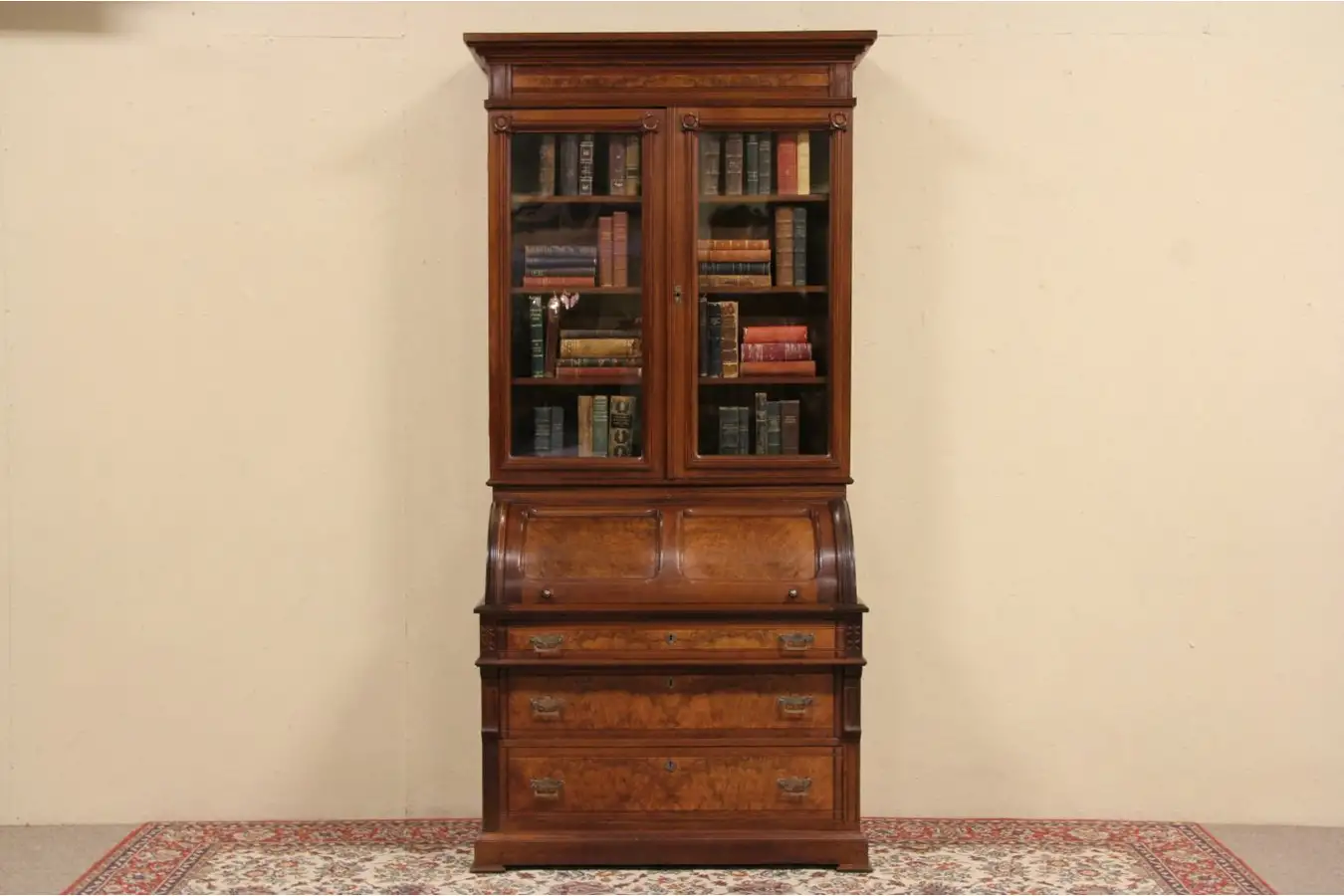 A marvelous example of late Victorian or Eastlake furniture from about 1885, a secretary desk with a barrel or cylinder roll top has a bookcase above.