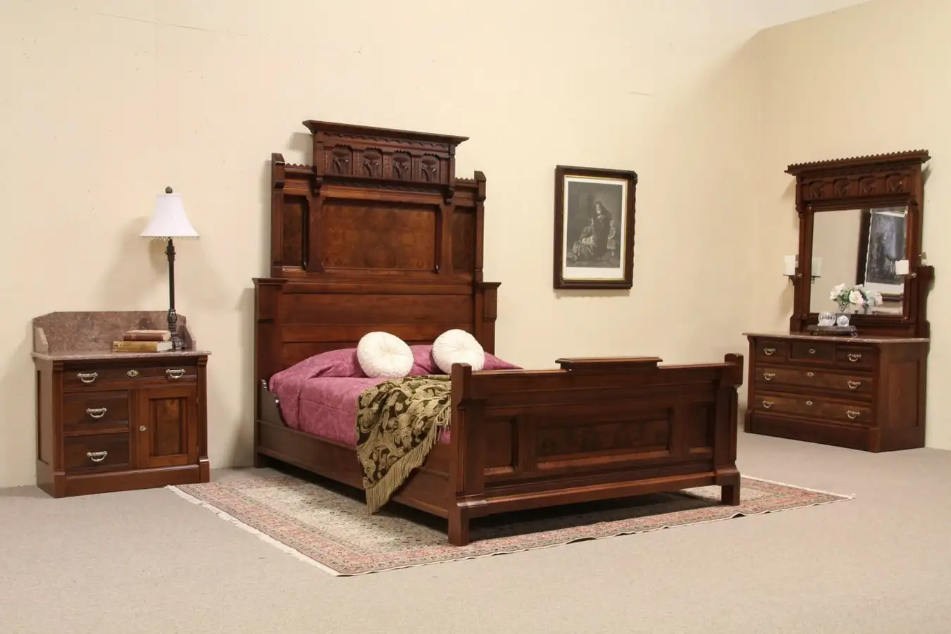 A spectacular late Victorian or Eastlake 1880 period three piece bedroom set includes a queen size bed.
