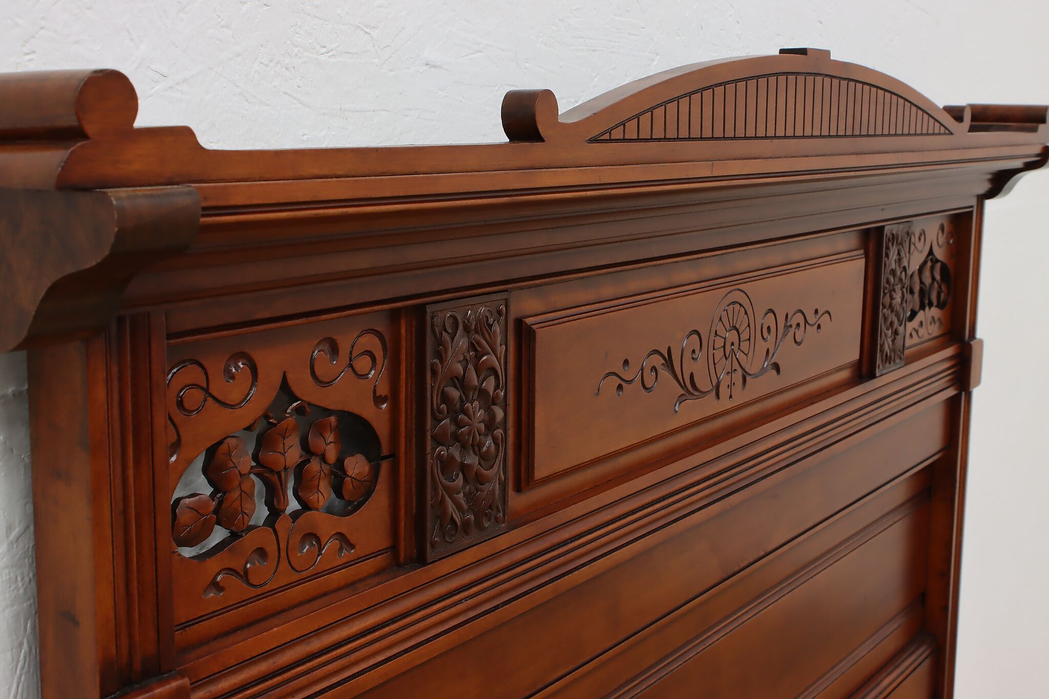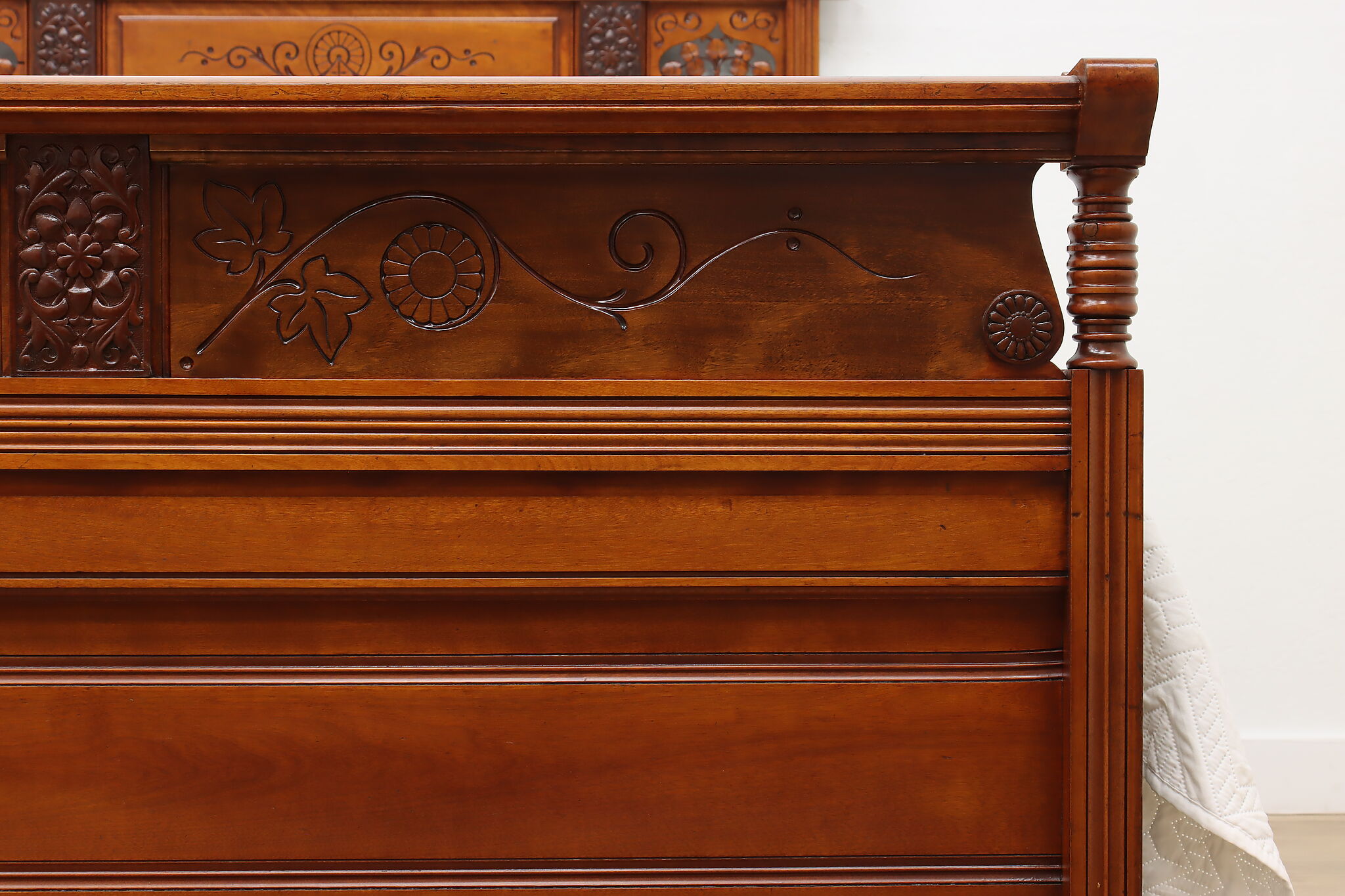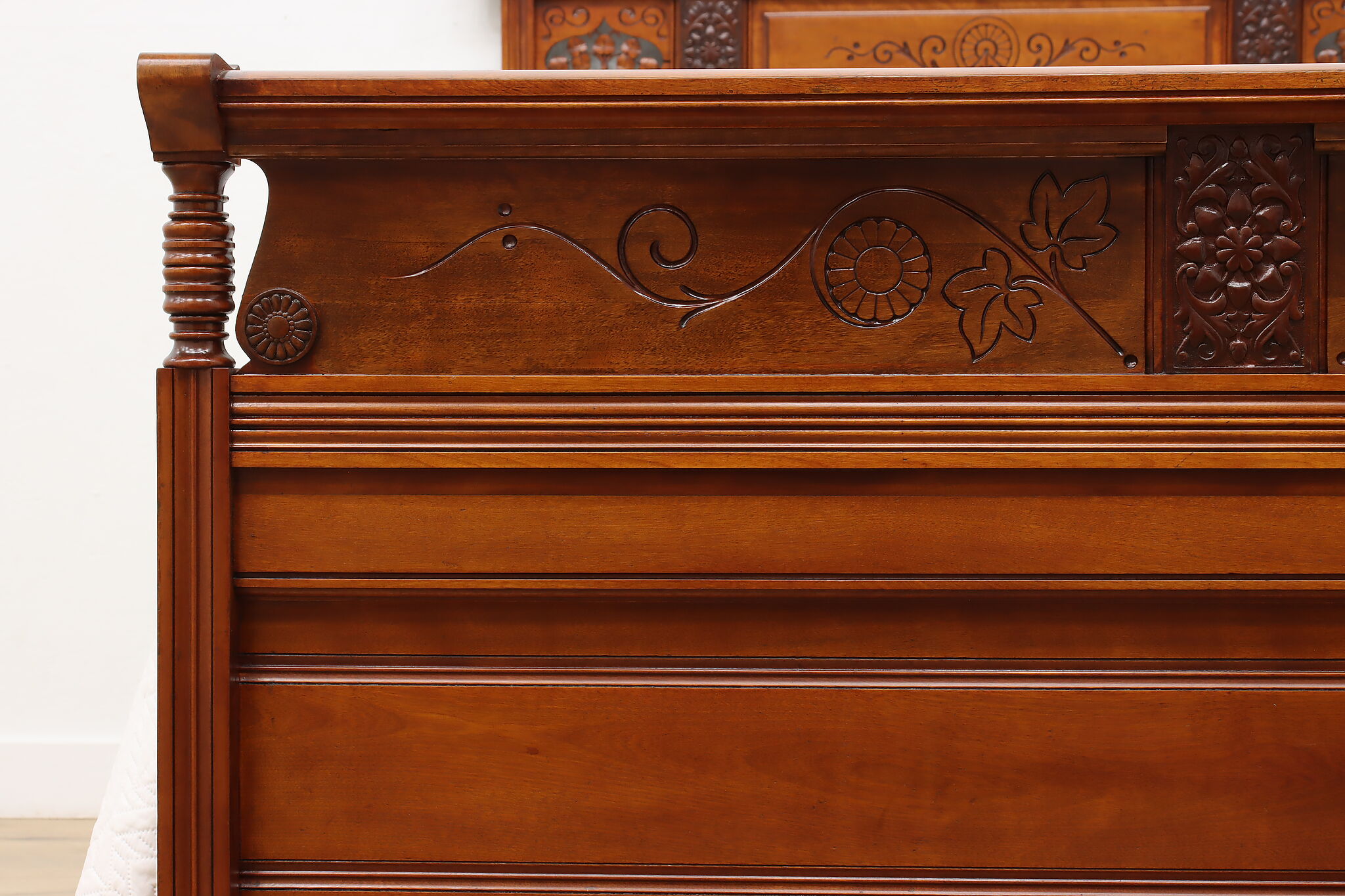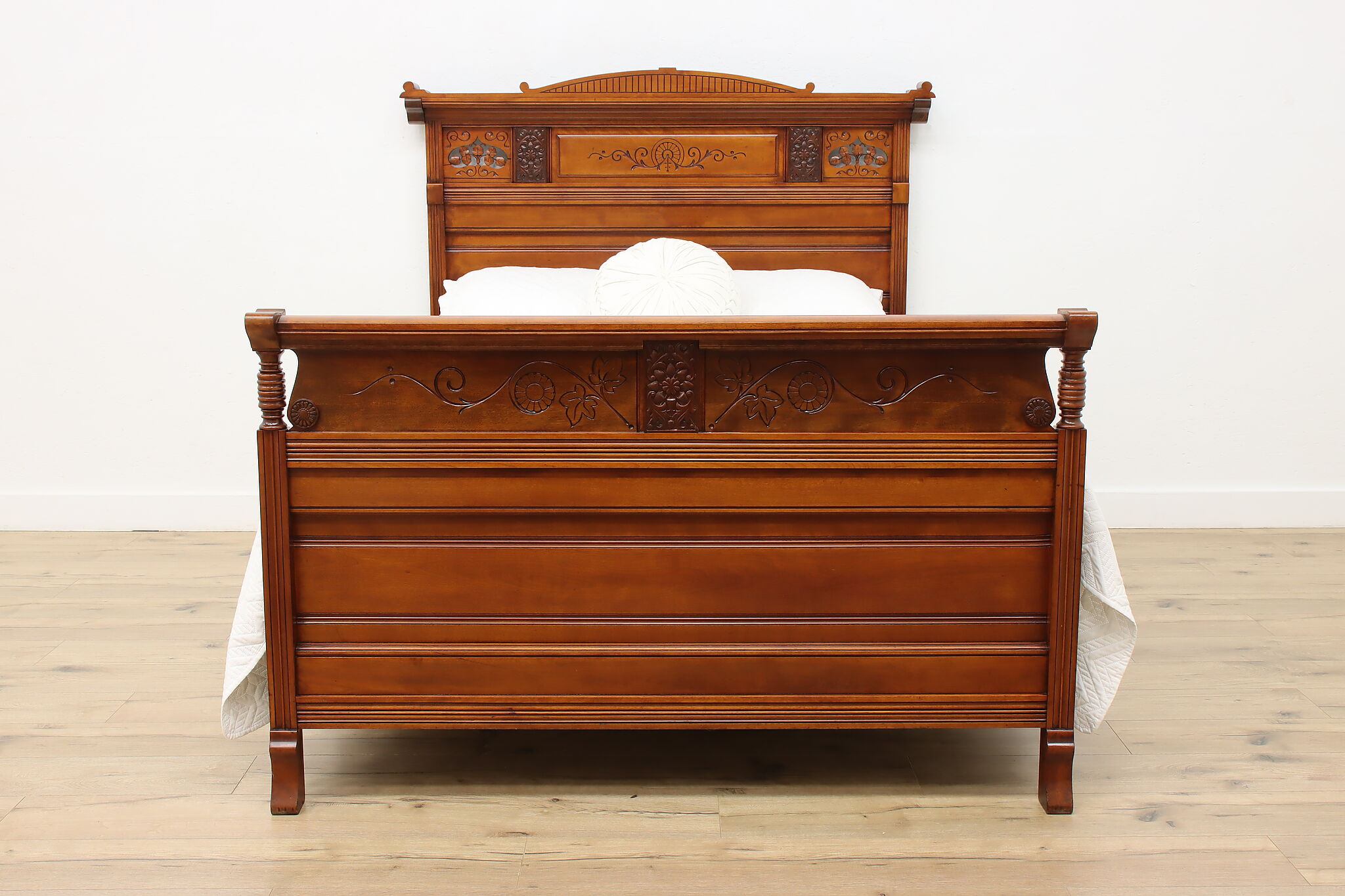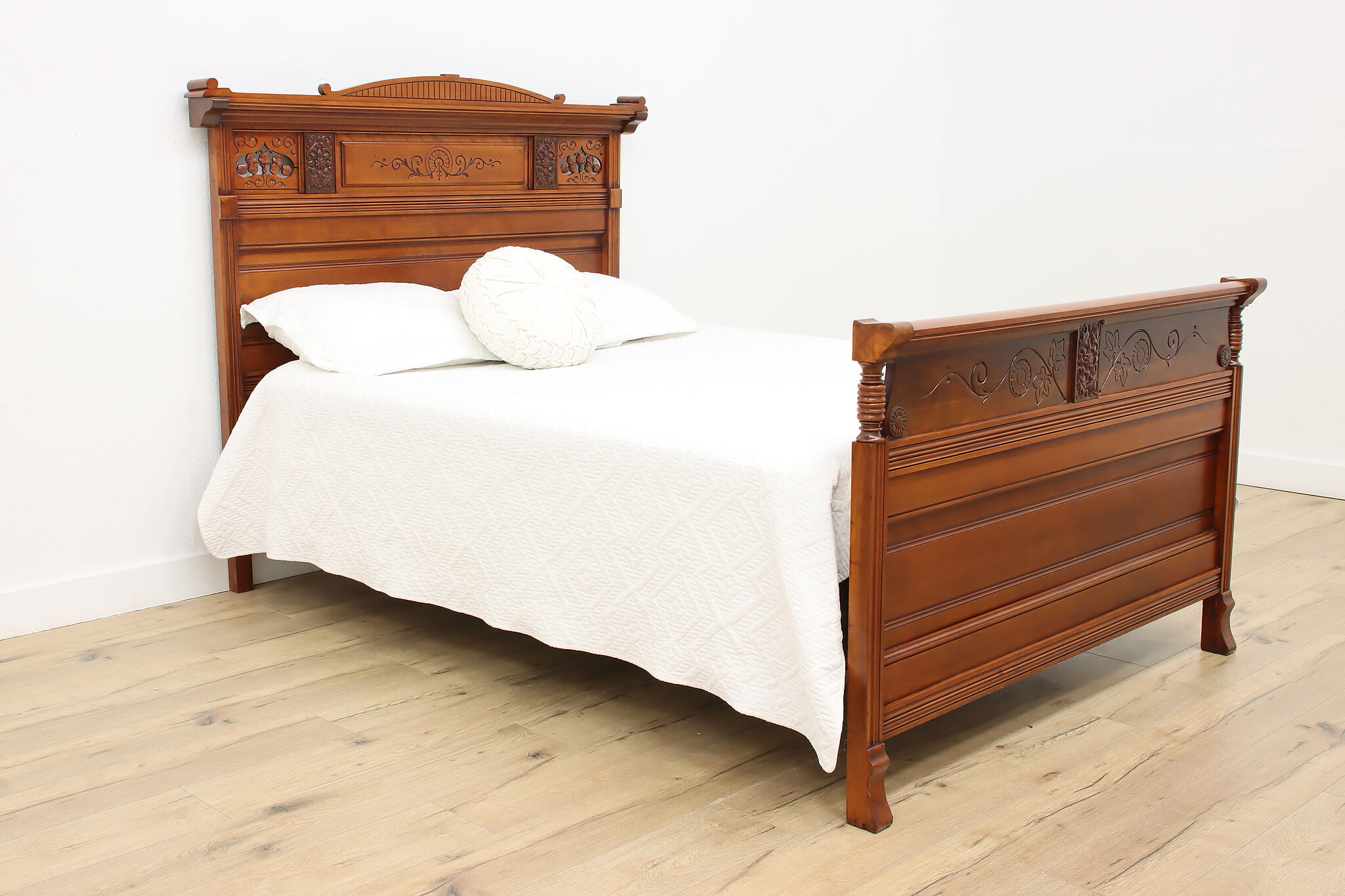 This three piece Victorian Eastlake bedroom set includes a queen size bed, dresser with mirror, and an armoire.