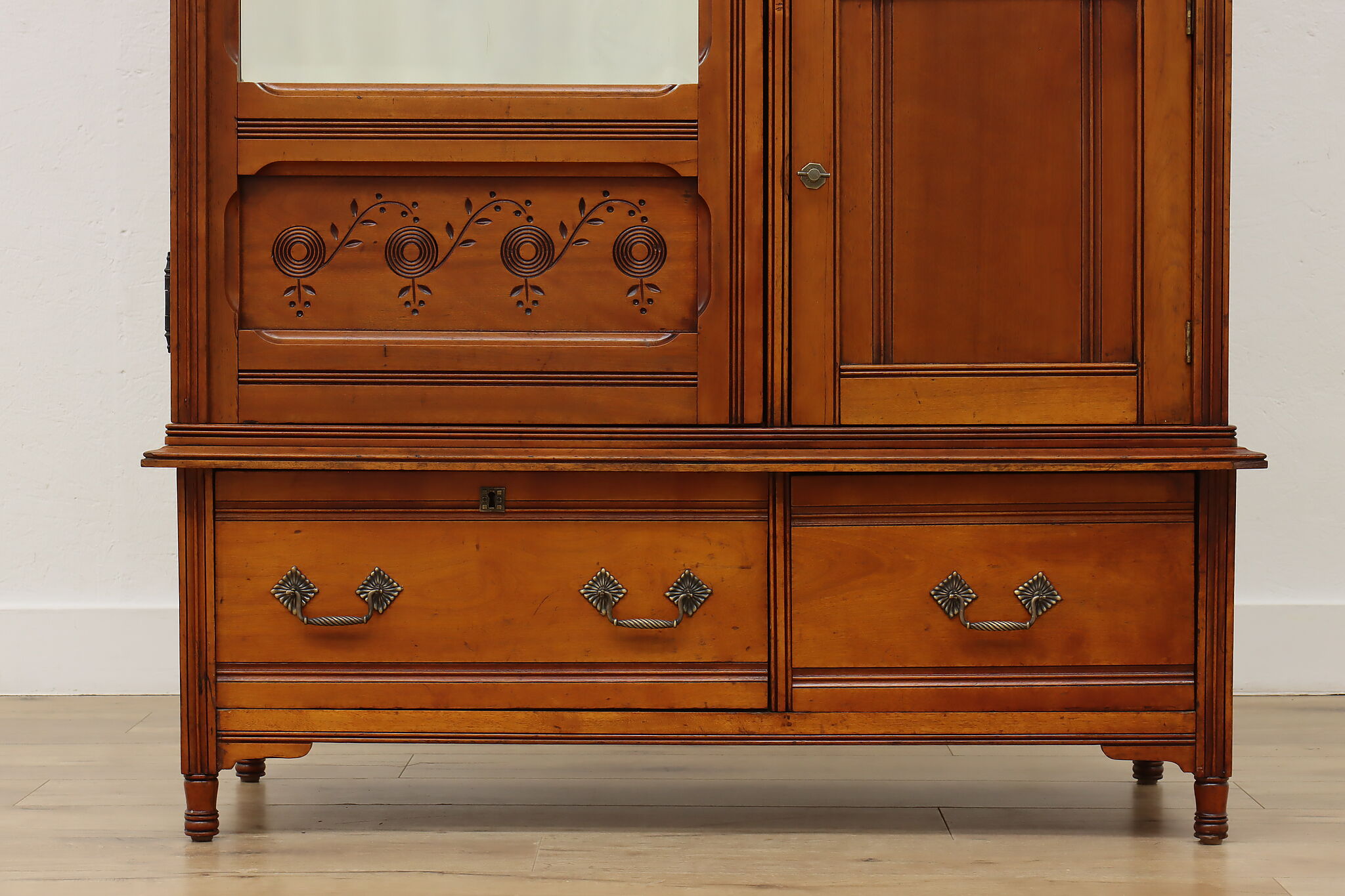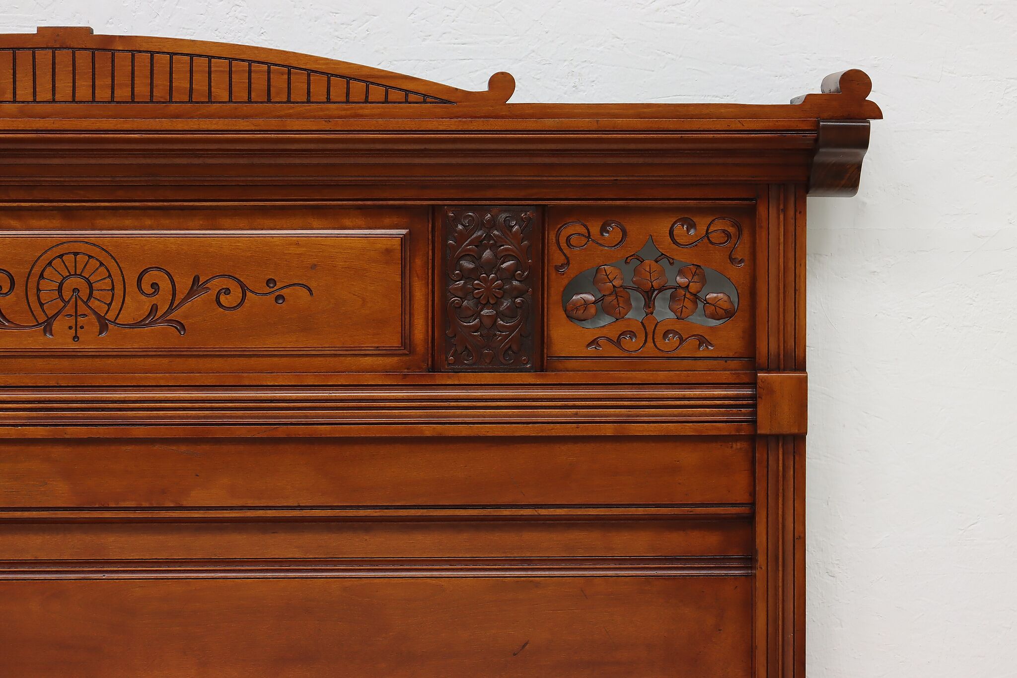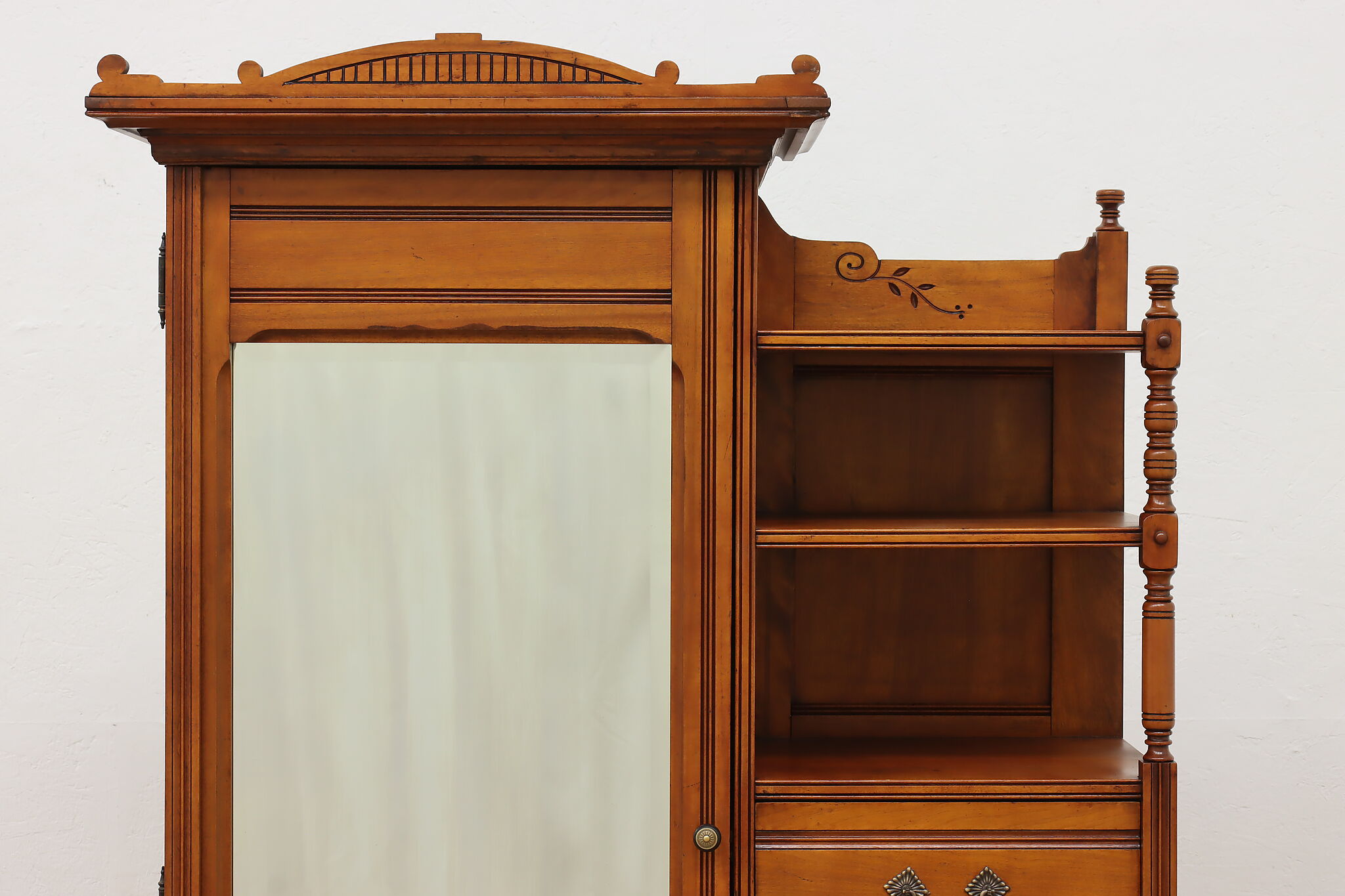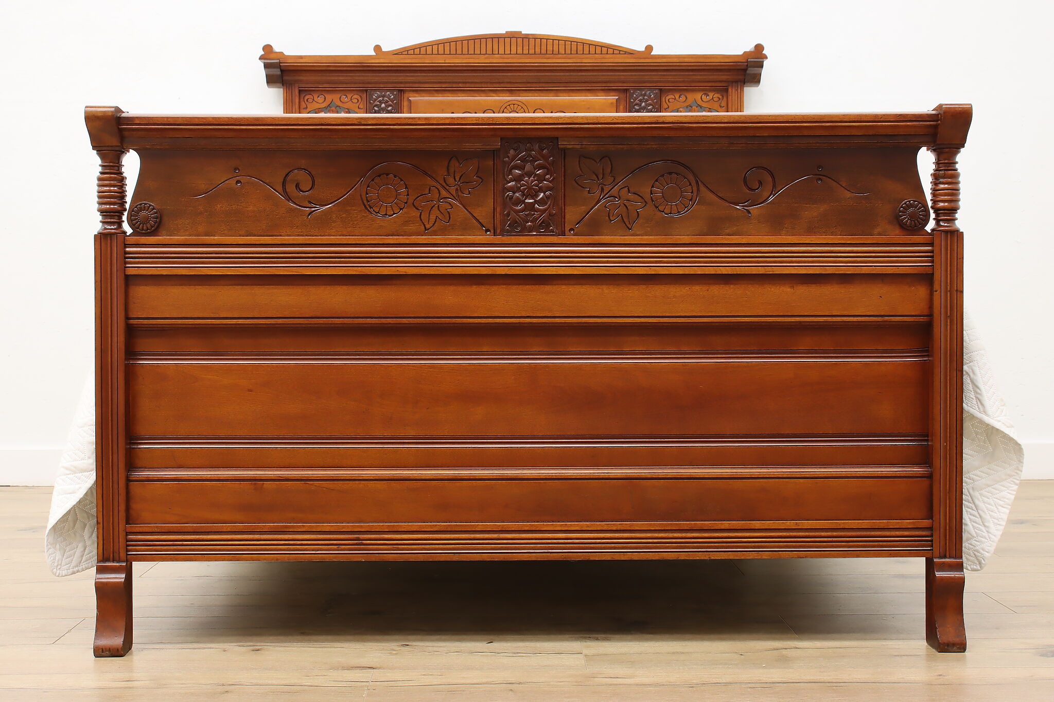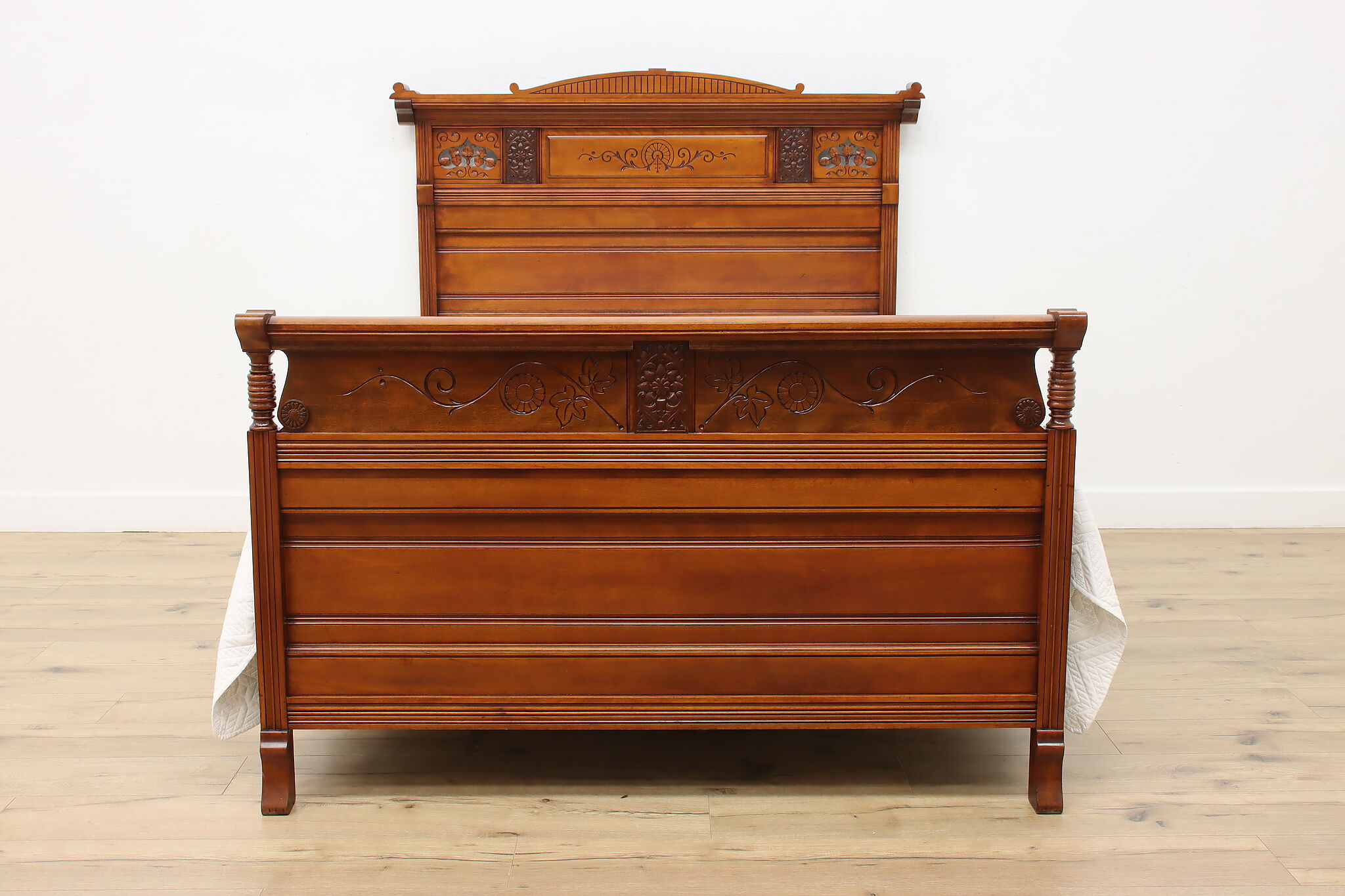 This three piece Victorian Eastlake bedroom set includes a queen size bed, dresser with mirror, and an armoire.