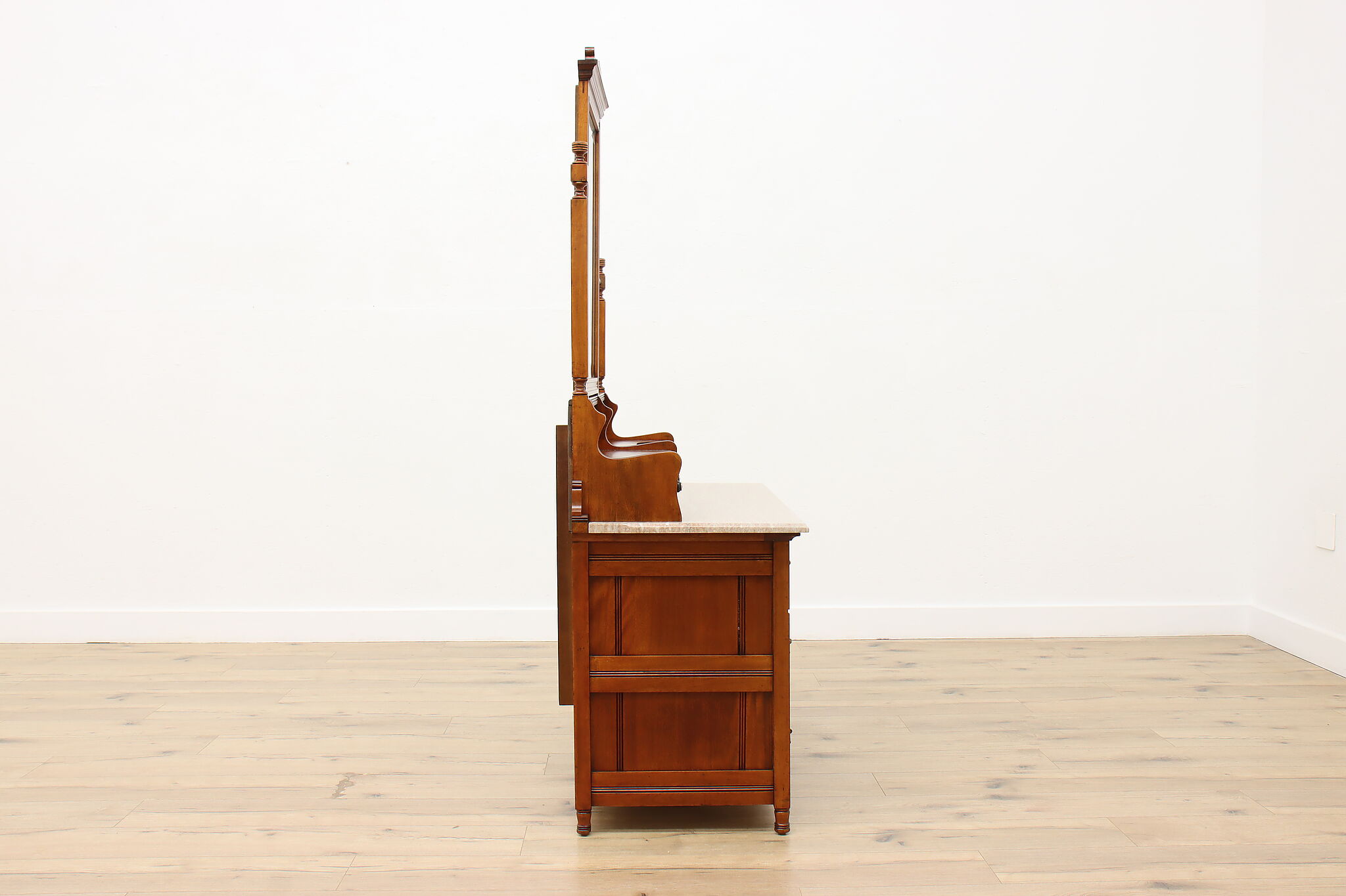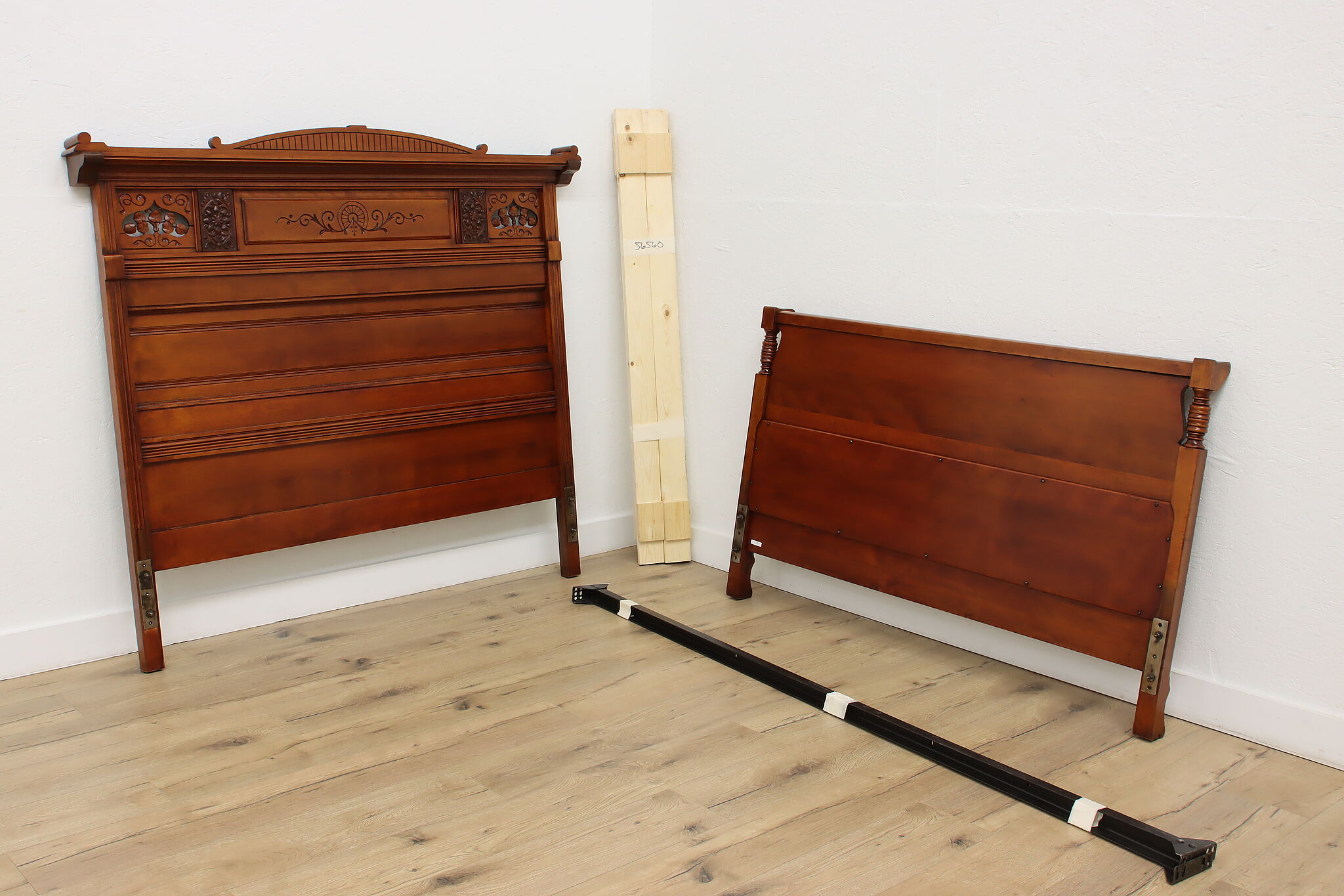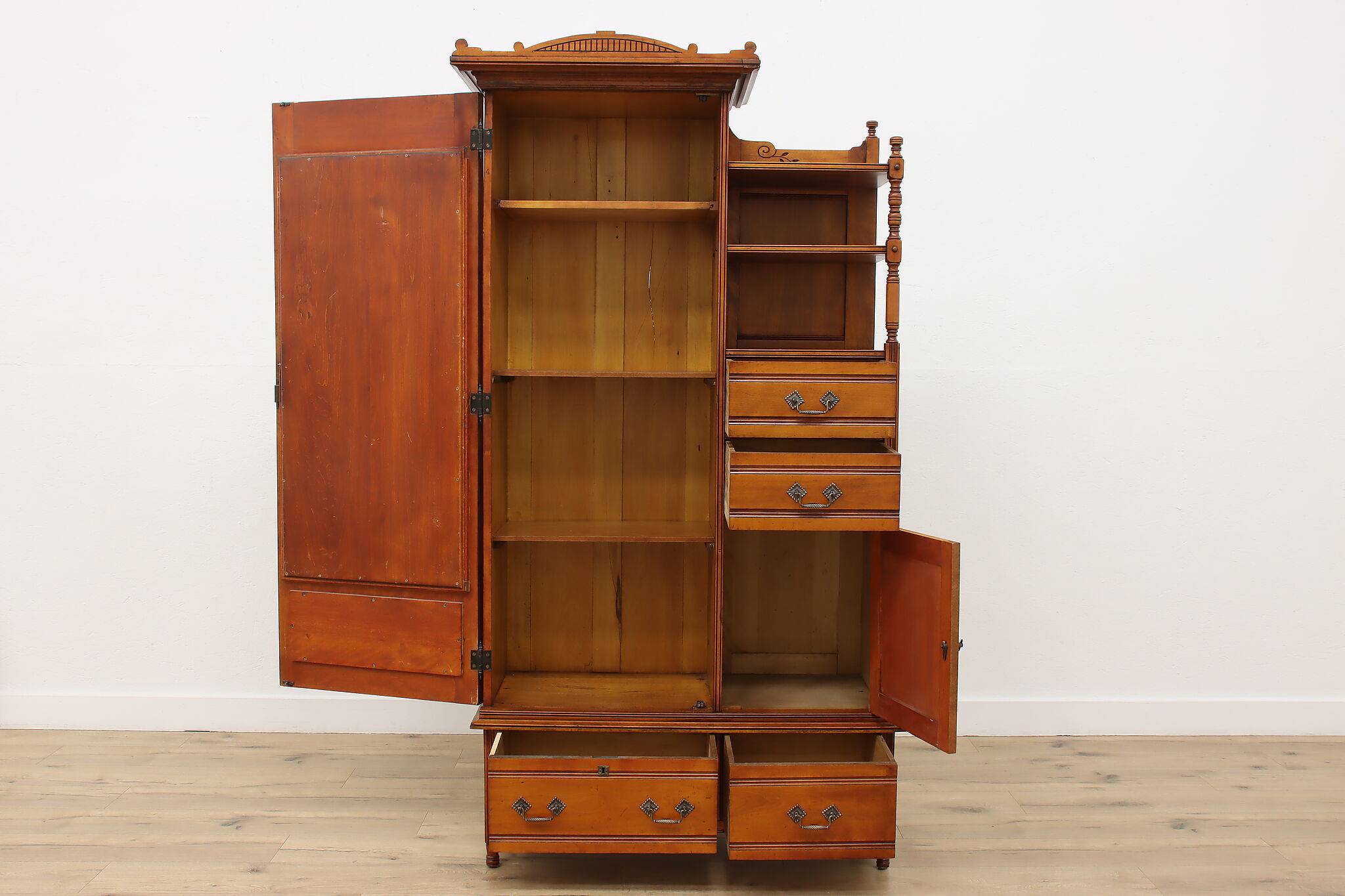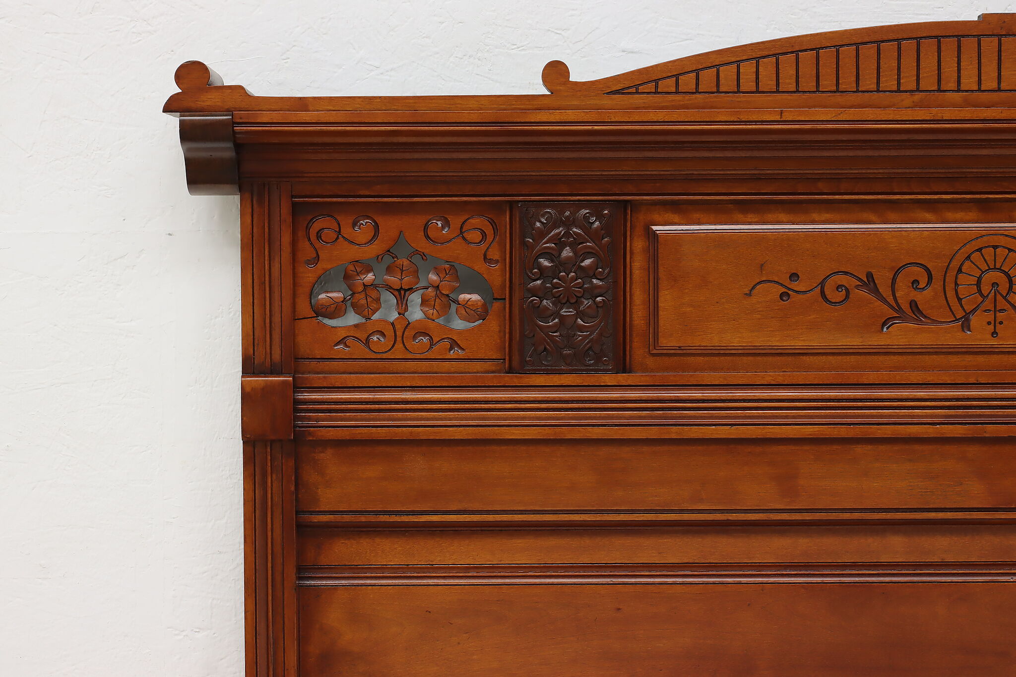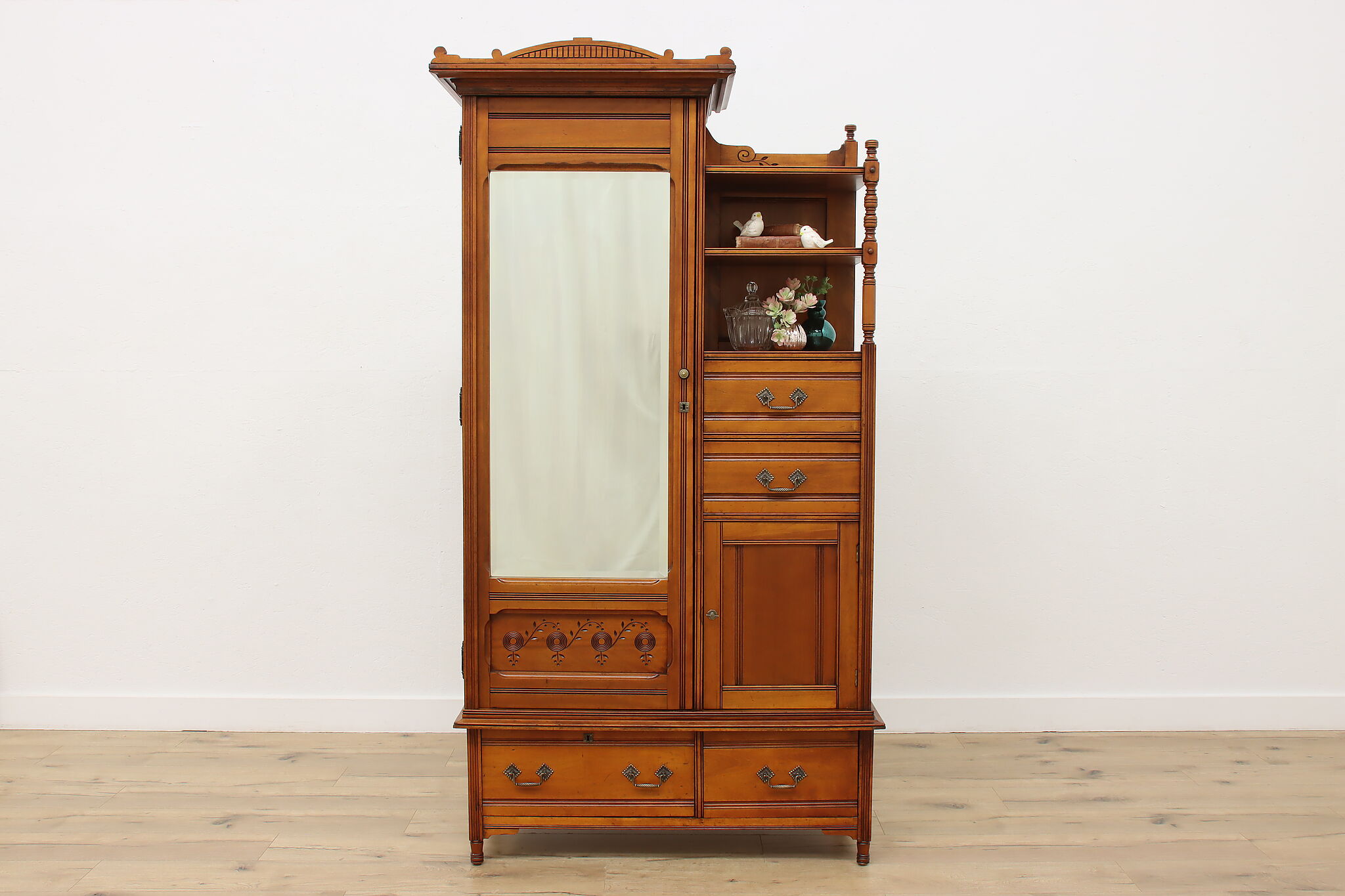 This three piece Victorian Eastlake bedroom set includes a queen size bed, dresser with mirror, and an armoire.