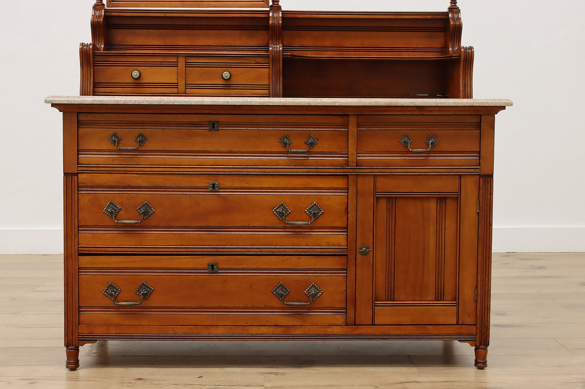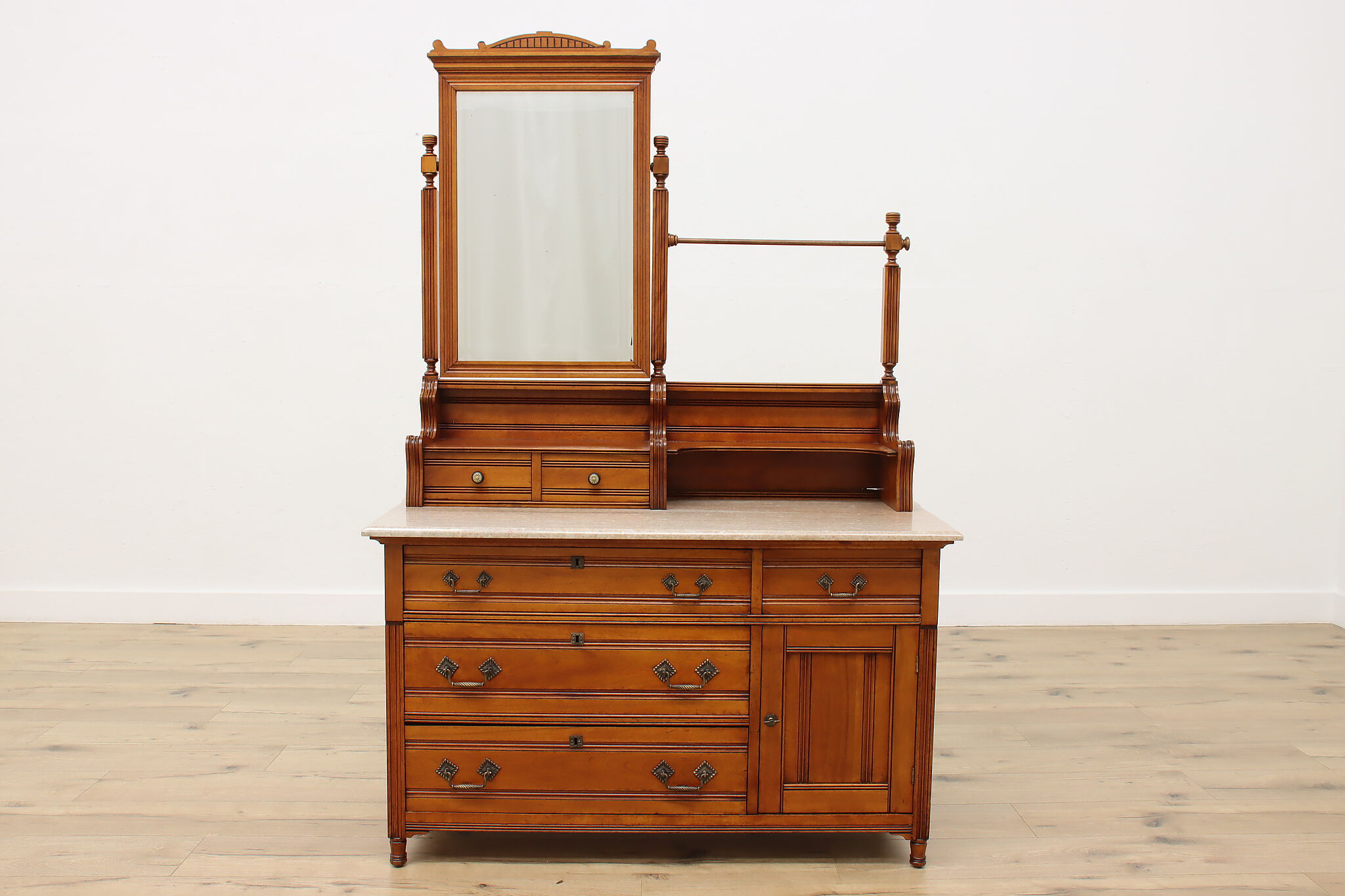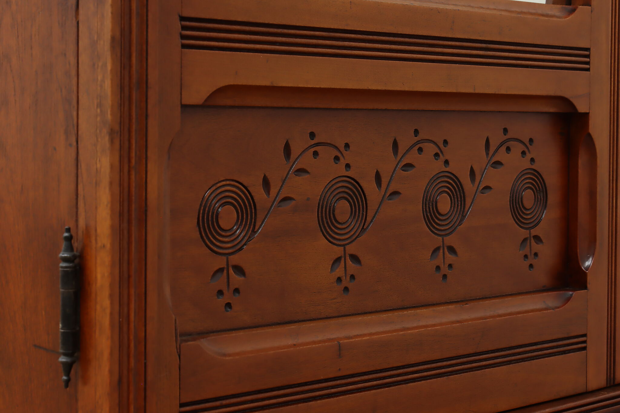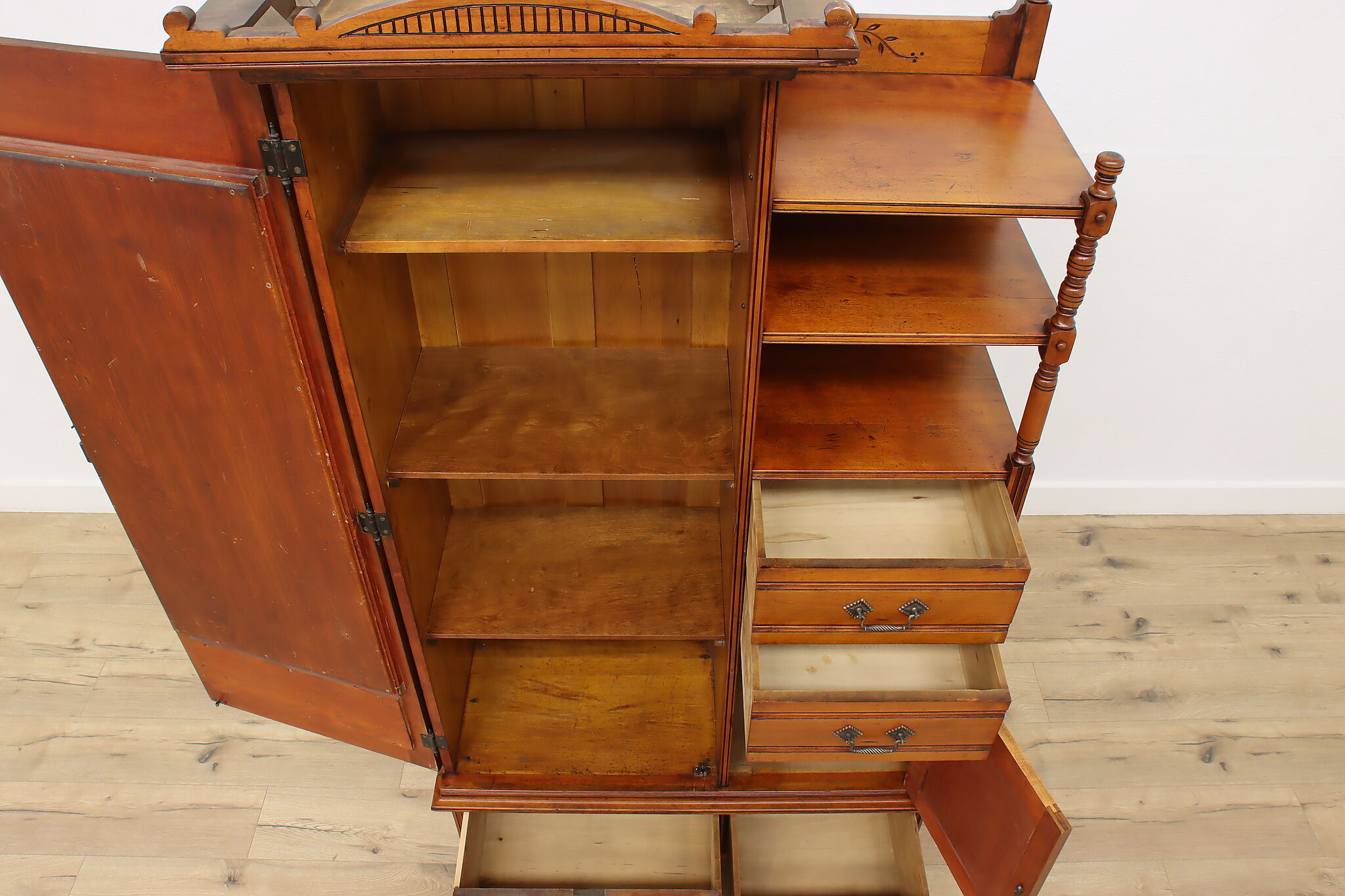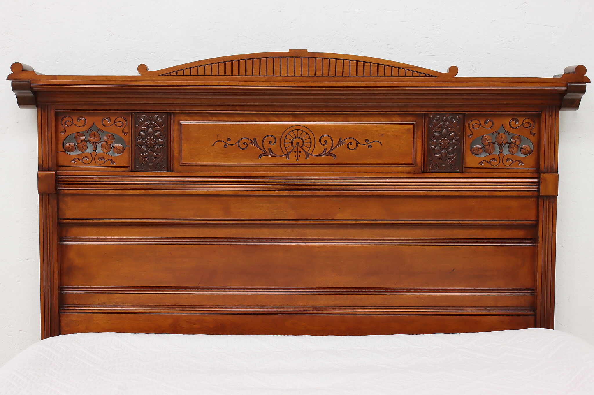 This three piece Victorian Eastlake bedroom set includes a queen size bed, dresser with mirror, and an armoire.