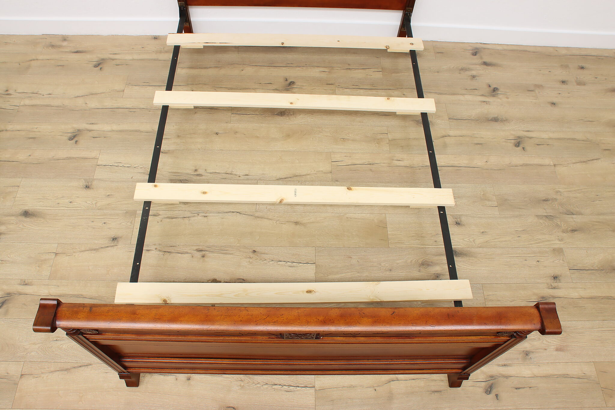 Bed size is 87.5" long and 62.5" wide. Headboard is 56.5" tall and the footboard is 36" tall. Slats sit 10" from ground and the demonstrator mattress is 16" thick. Interior length of the bed frame is 82.”