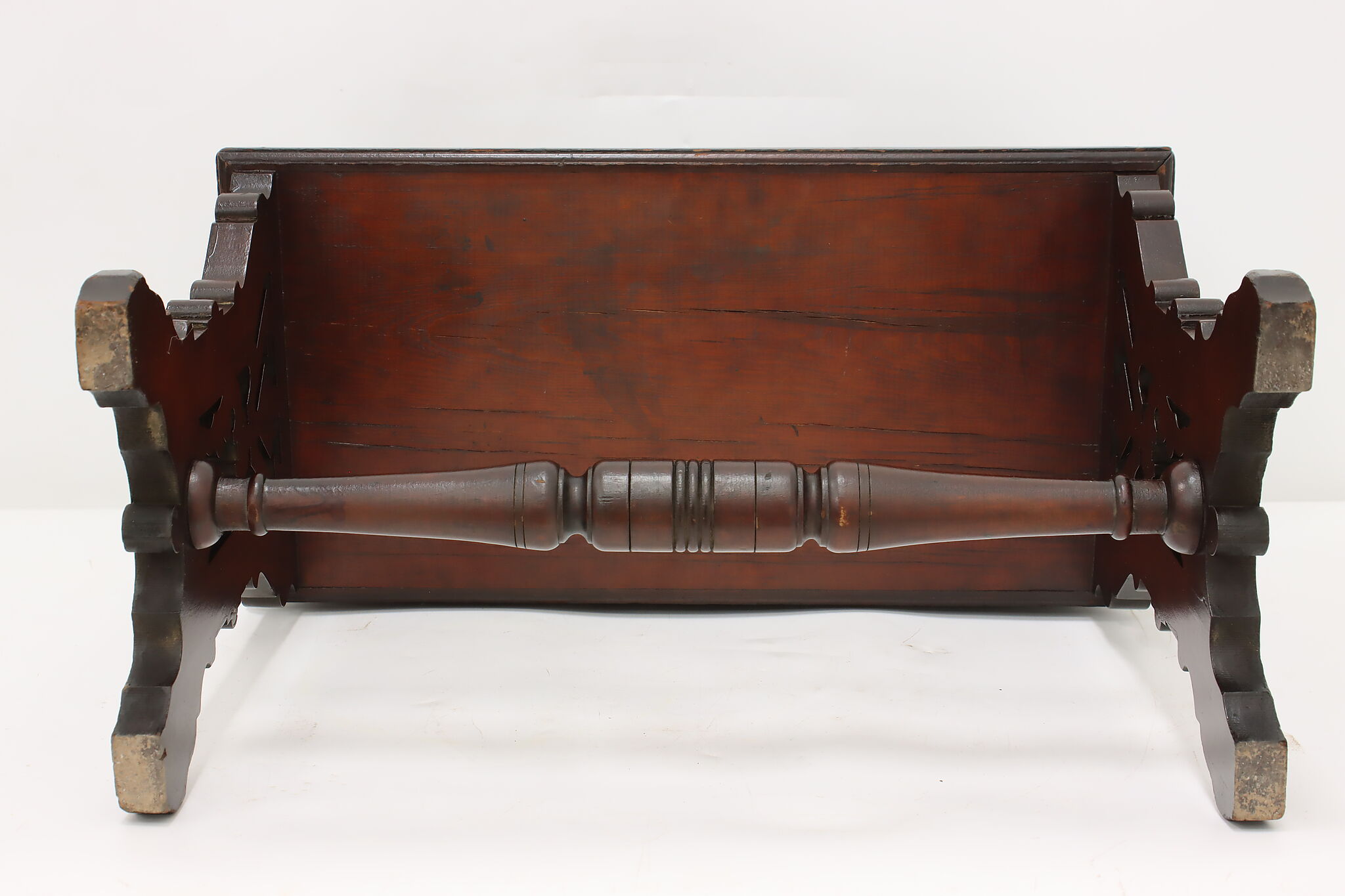 A Victorian Eastlake period "slipper bench" or footstool has convenient storage for slippers or other small items.