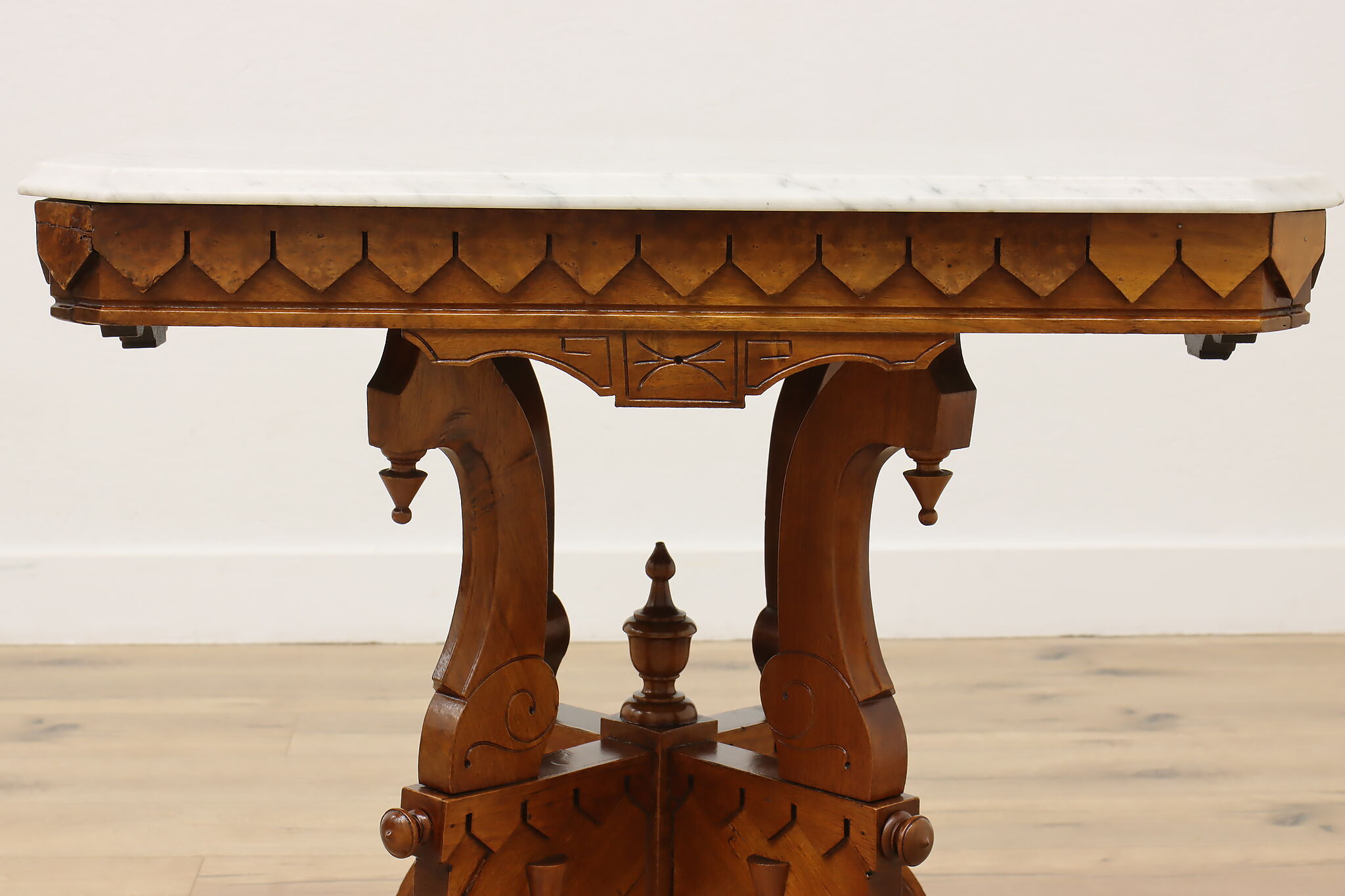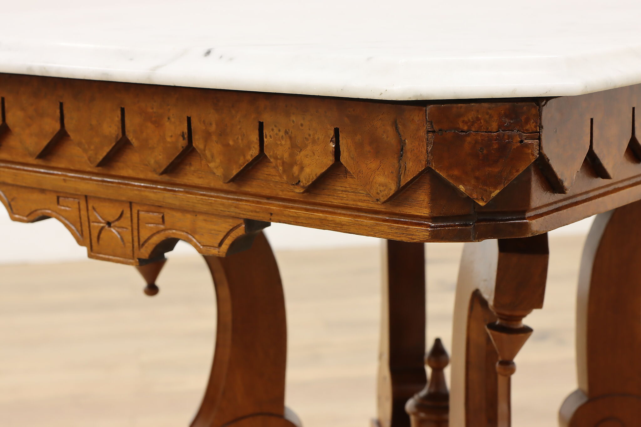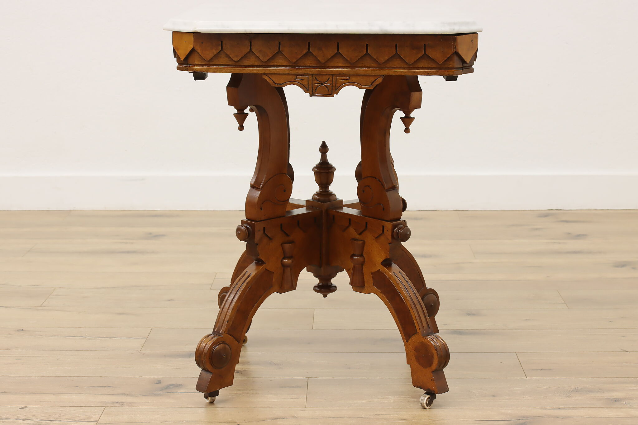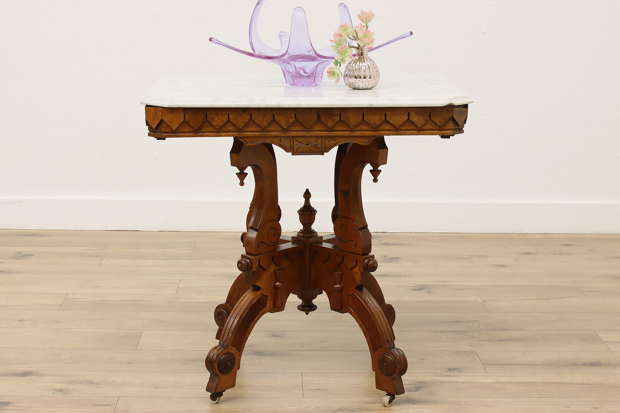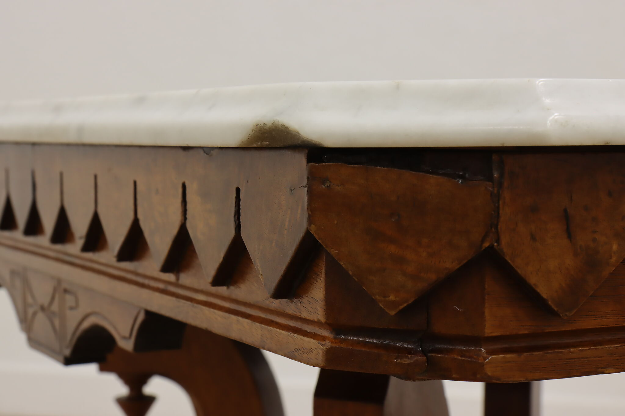 The gorgeous carved base on this hall table or entry console is beautifully complimented by the marble top.