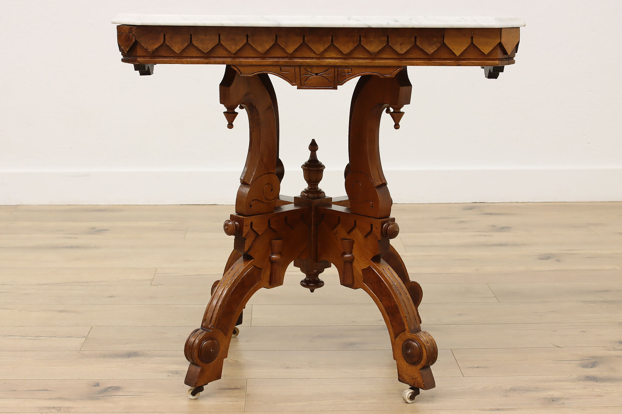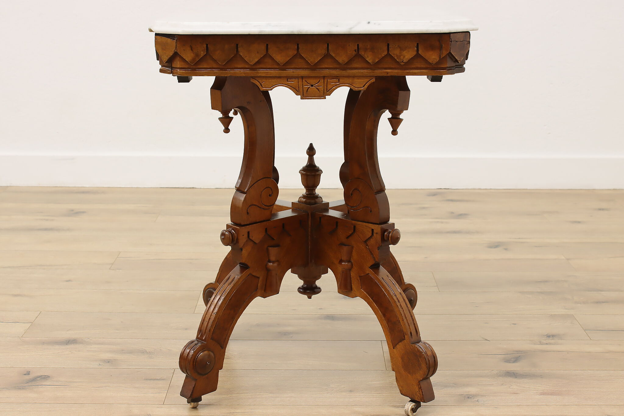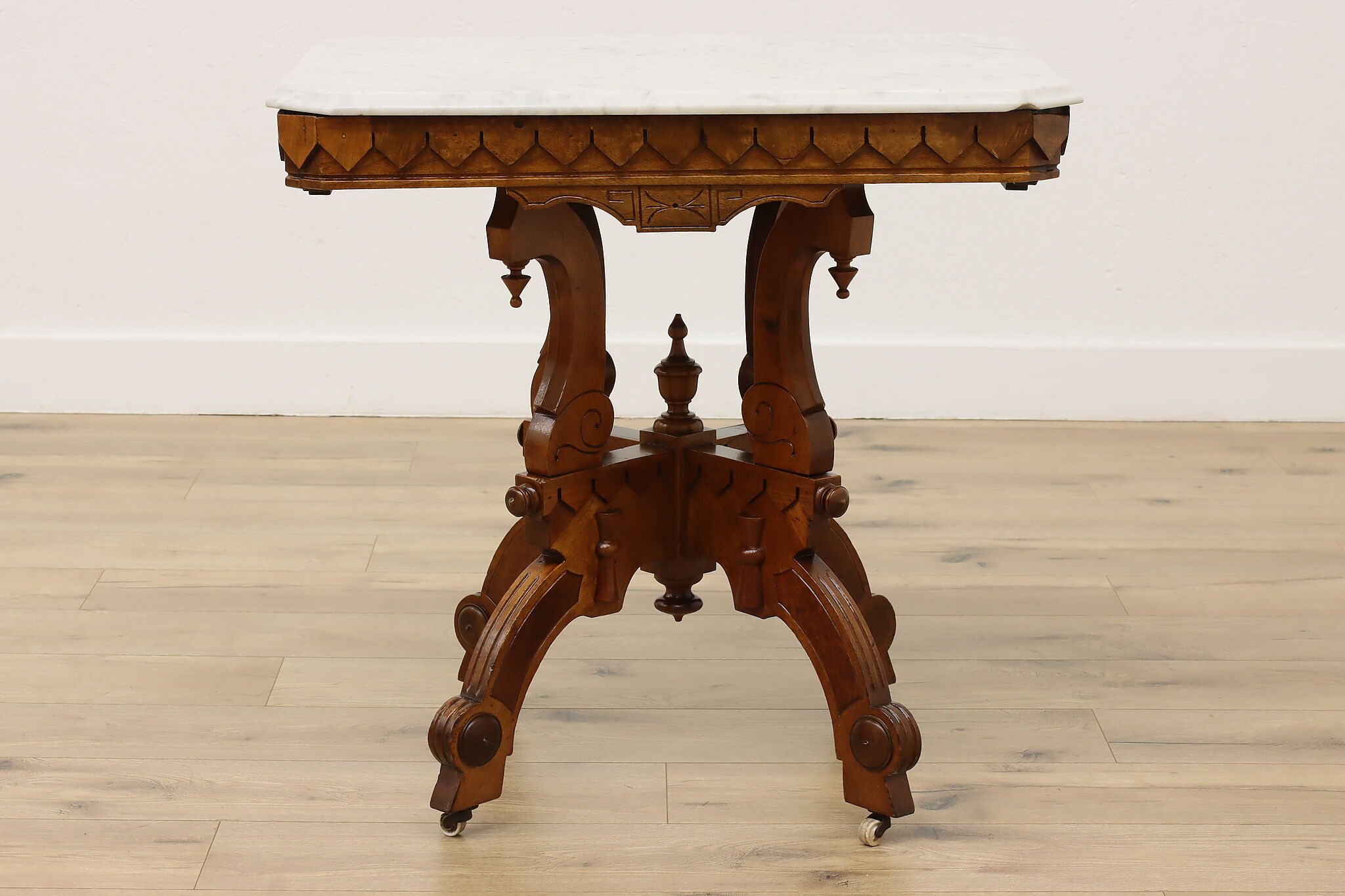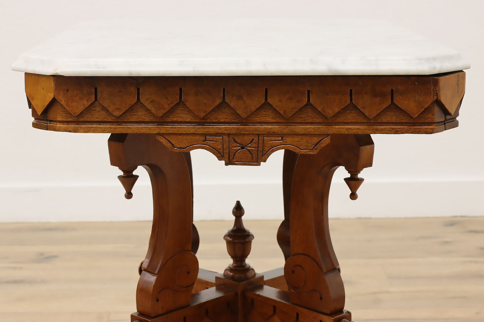 The gorgeous carved base on this hall table or entry console is beautifully complimented by the marble top.