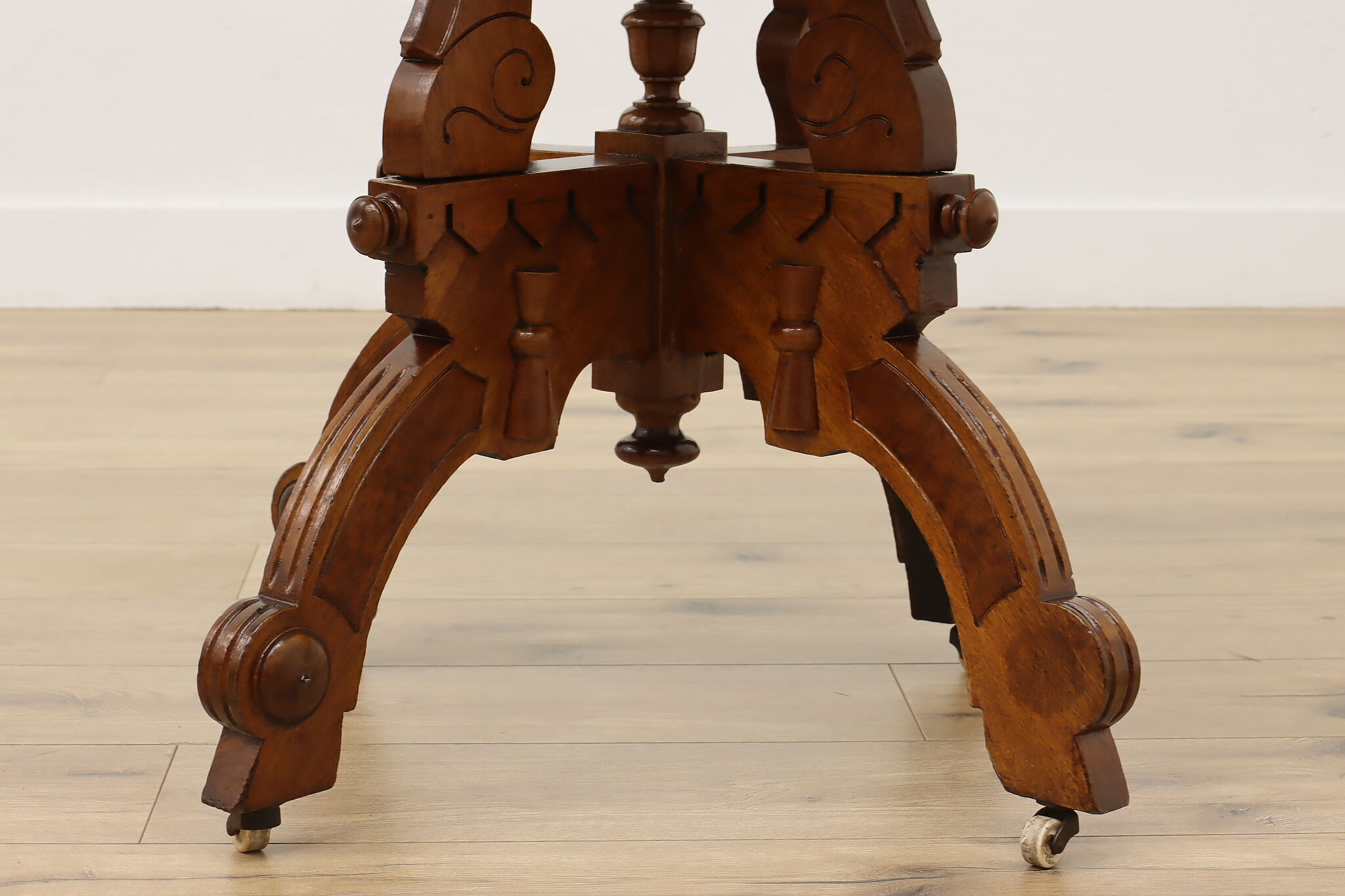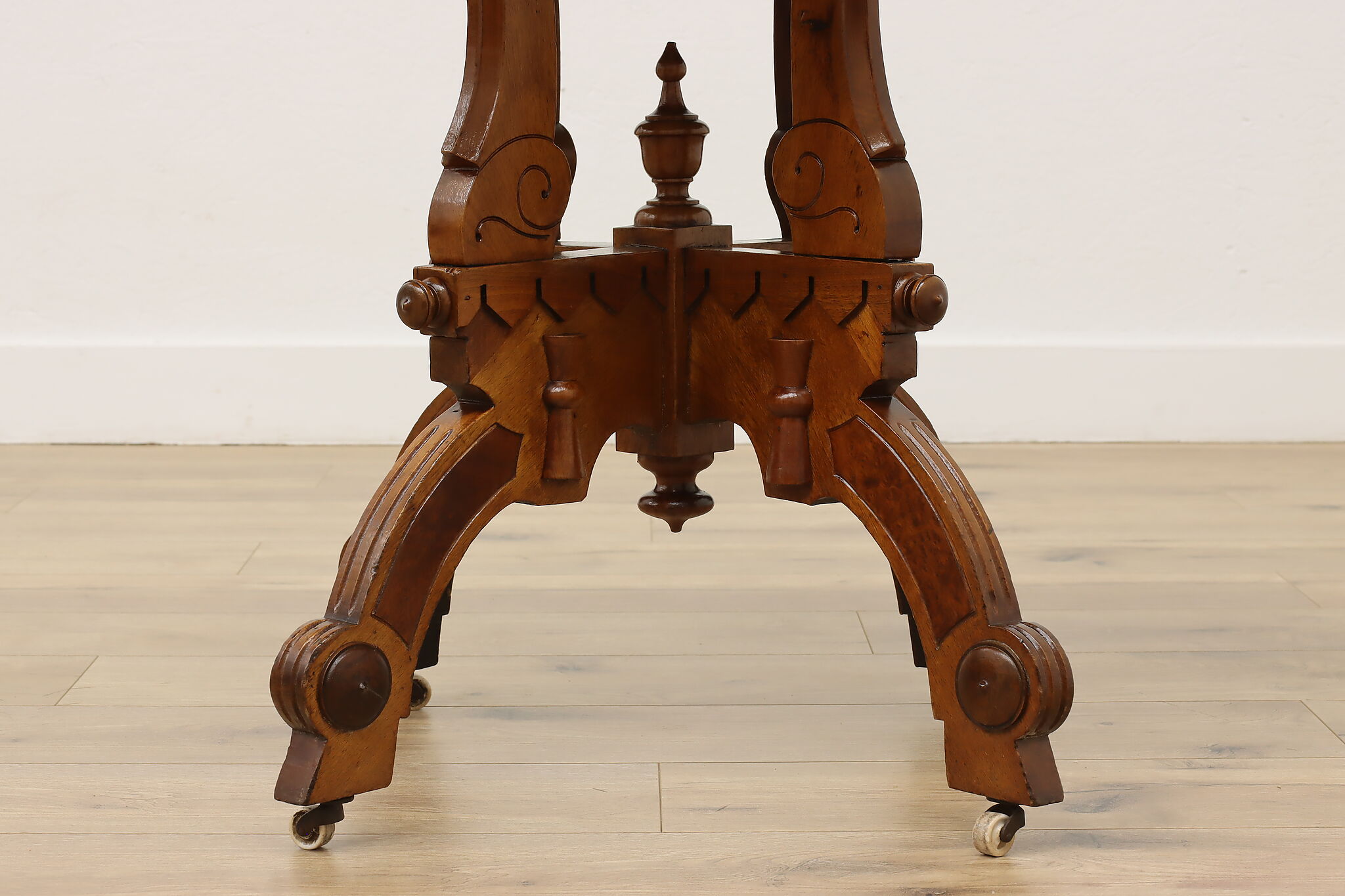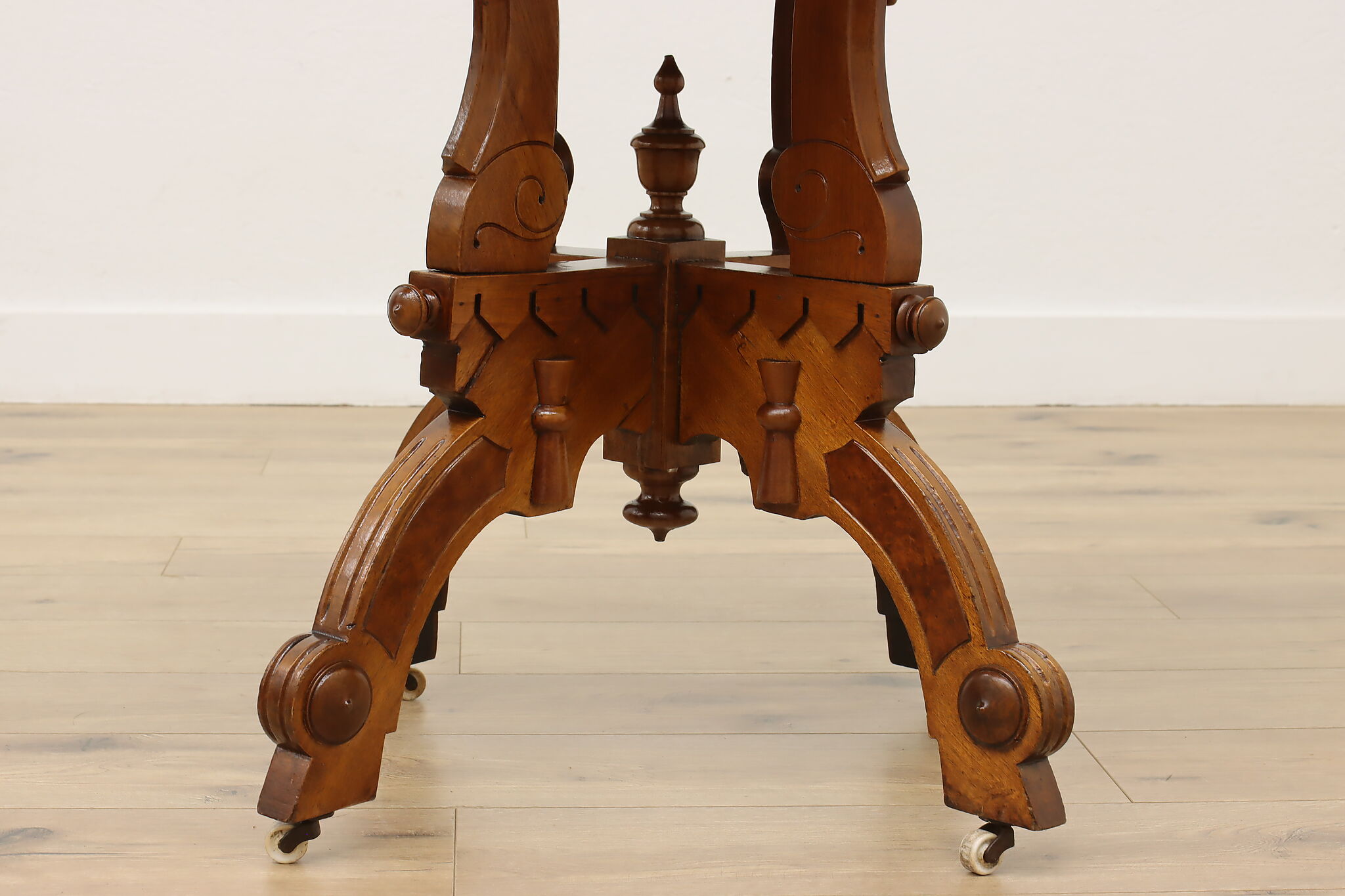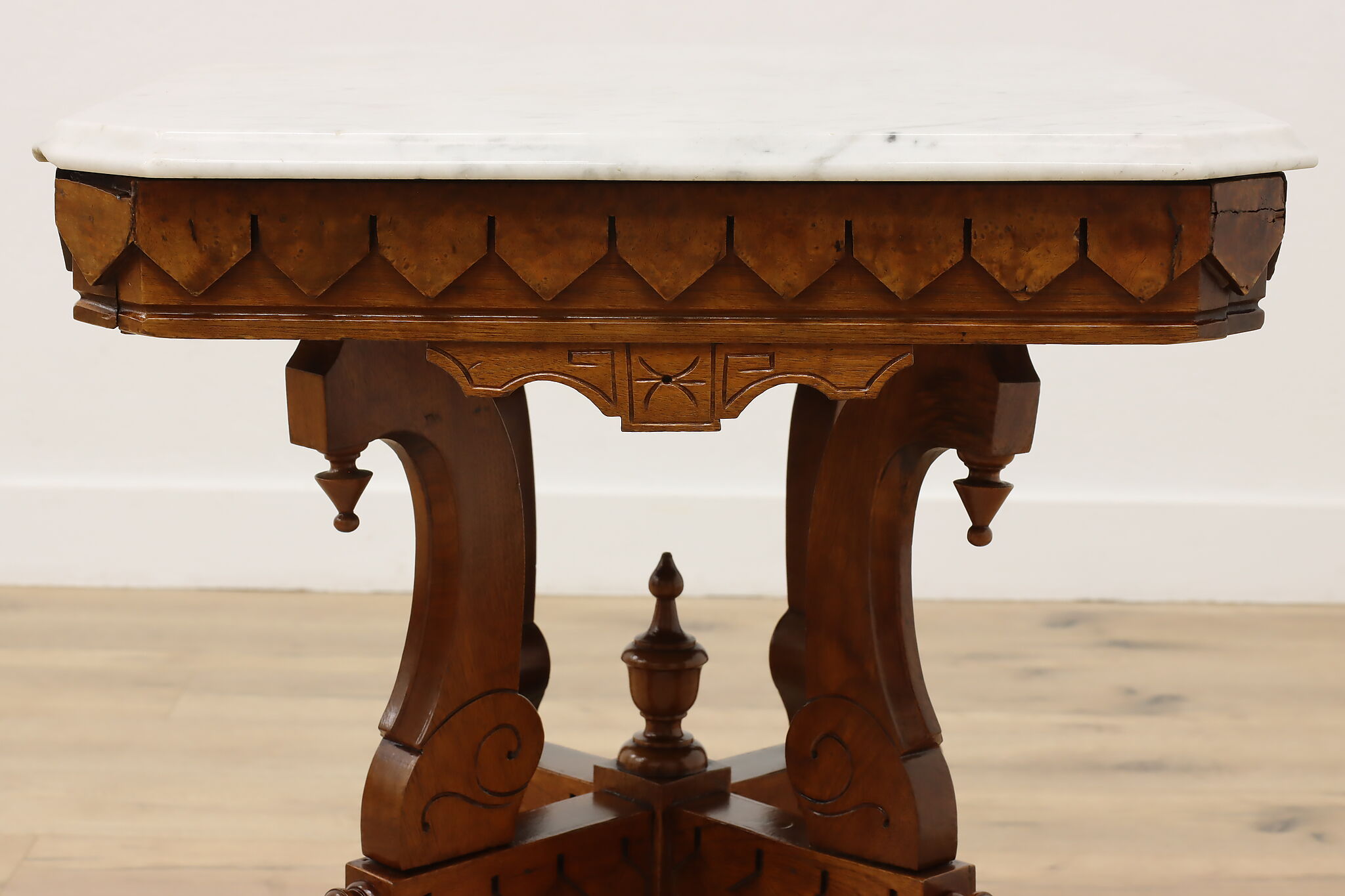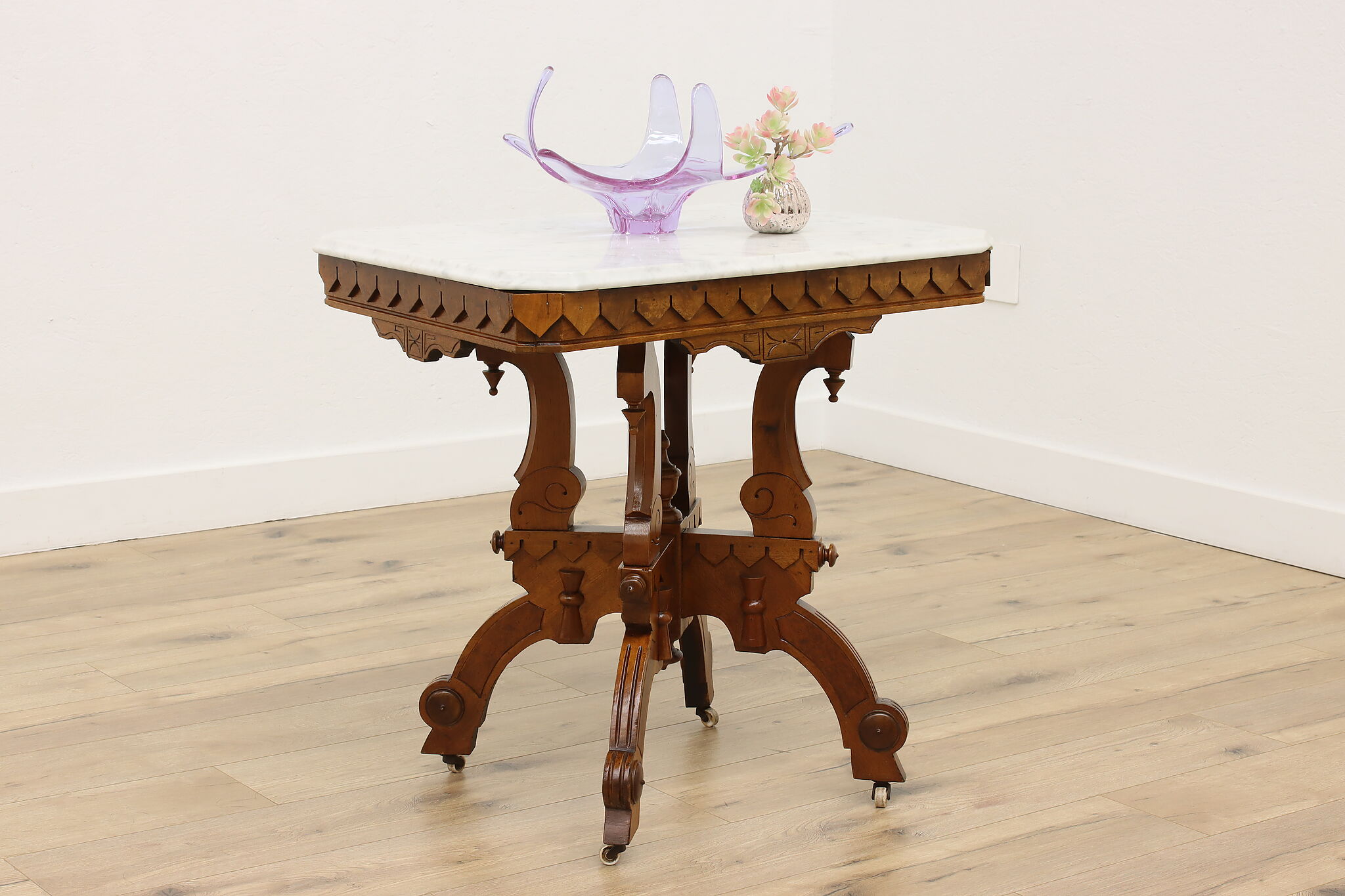 The gorgeous carved base on this hall table or entry console is beautifully complimented by the marble top.