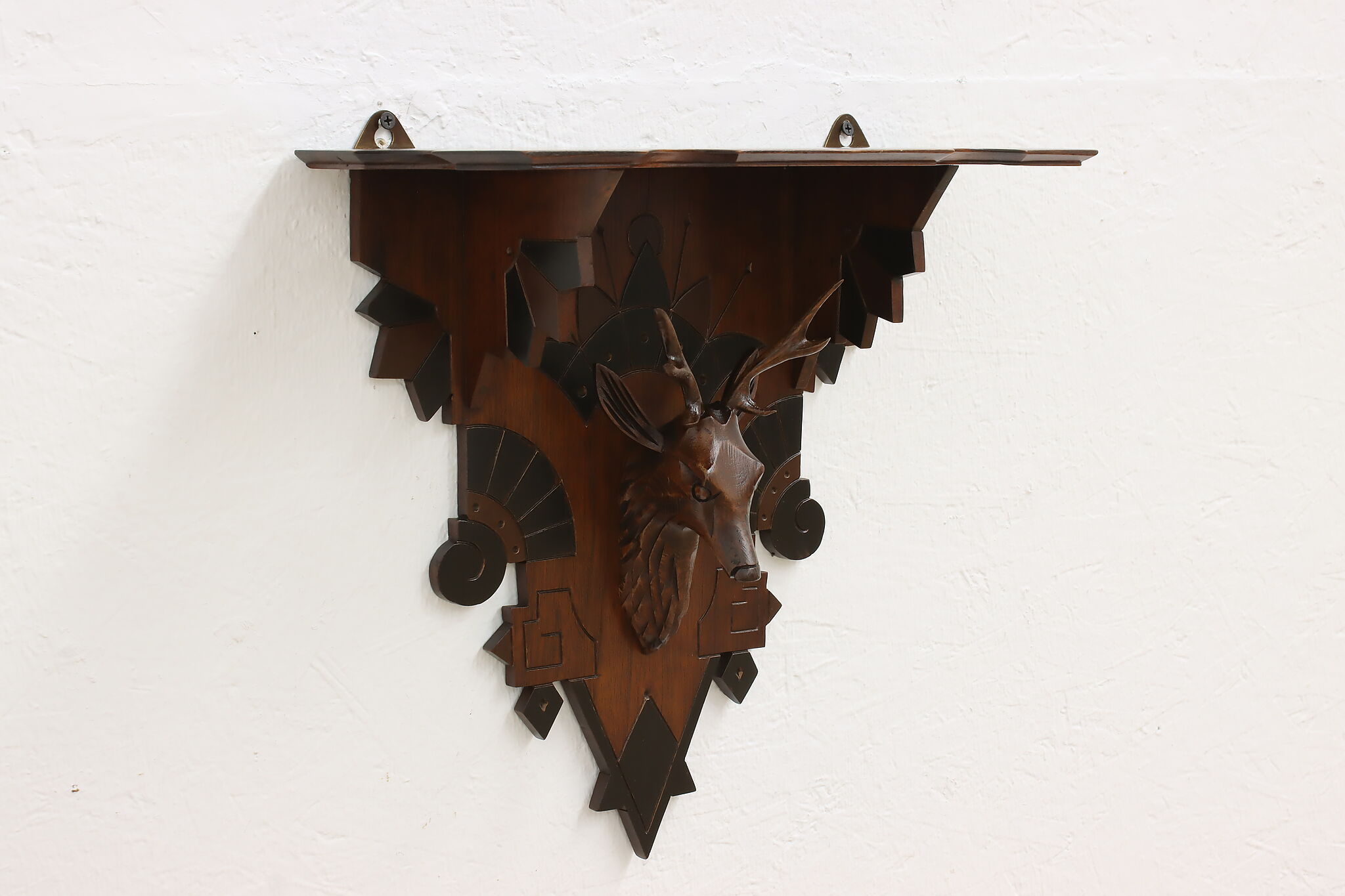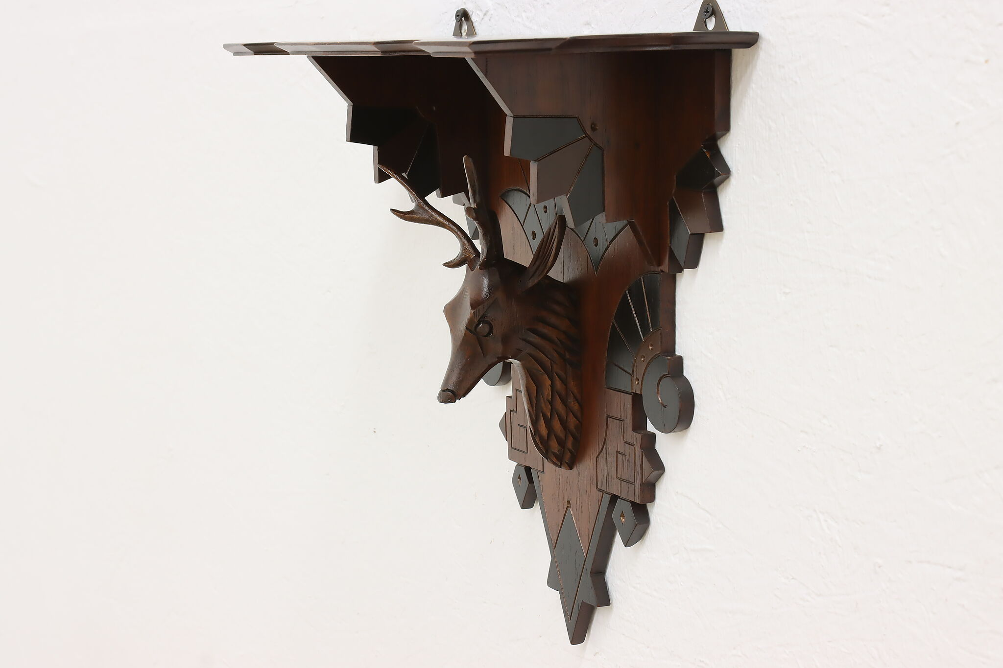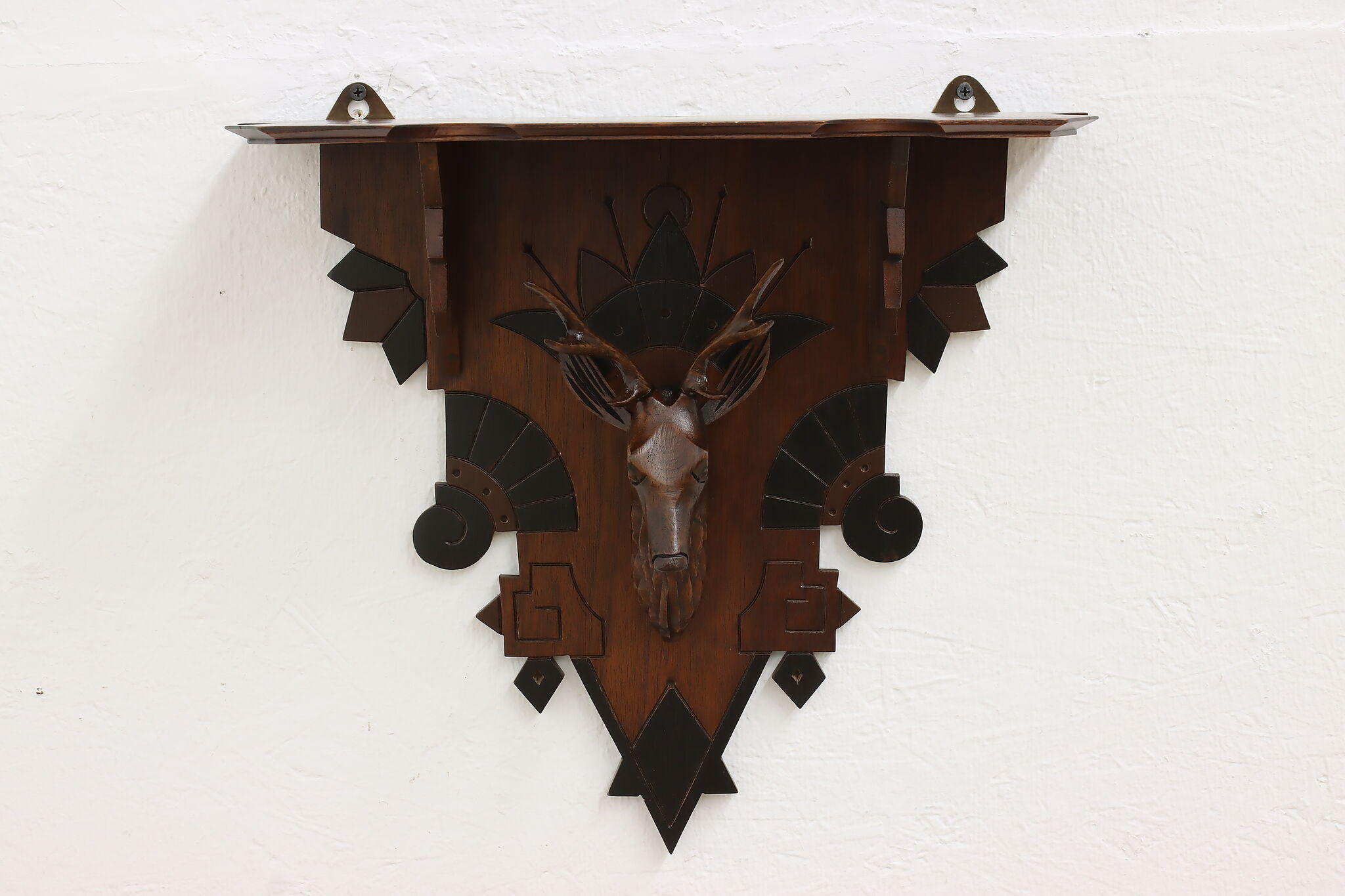 Placed in a cabin or hunting lodge, this wall shelf and its carved deer head is sure to bring luck for the yearly hunt!
