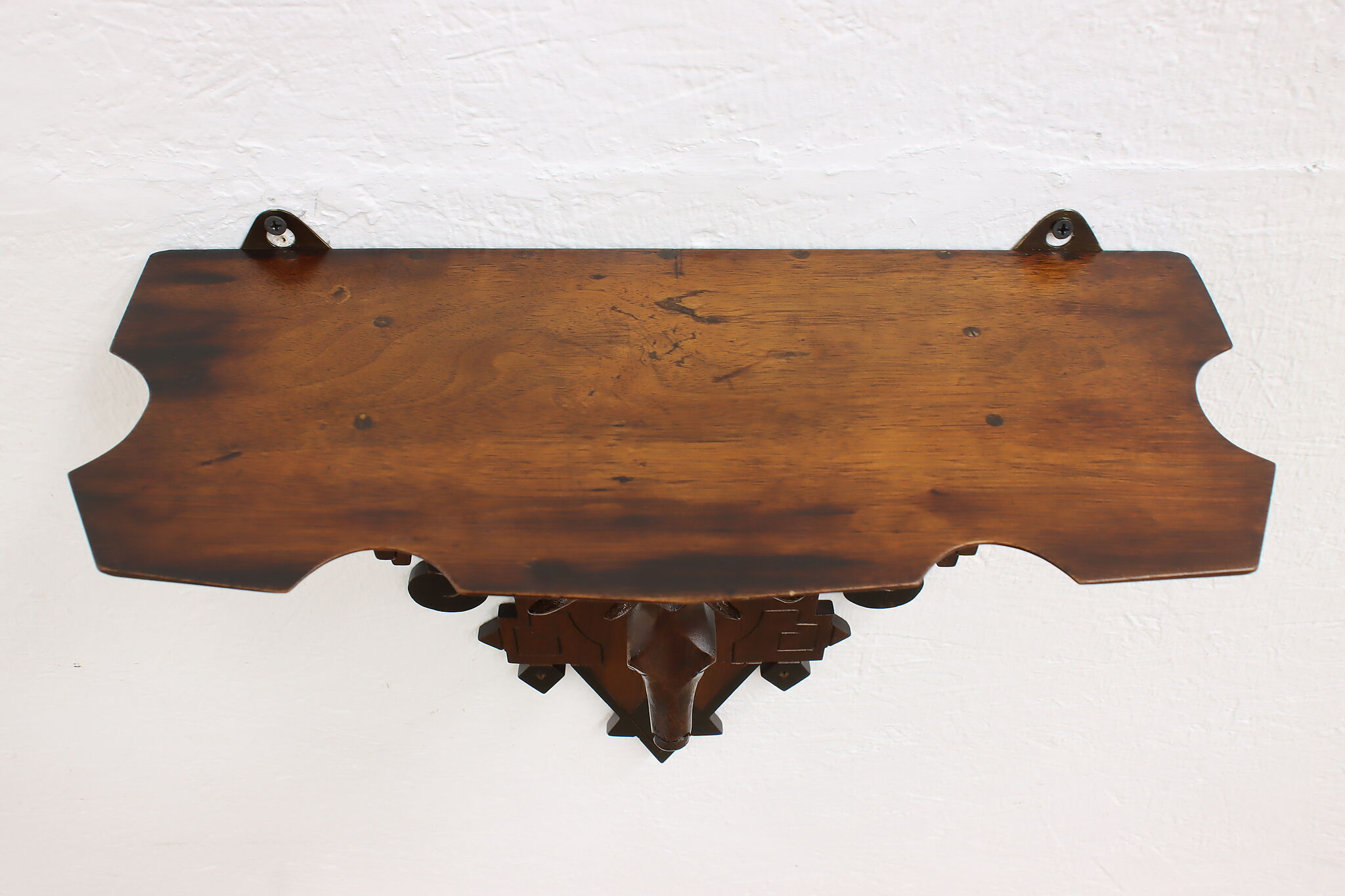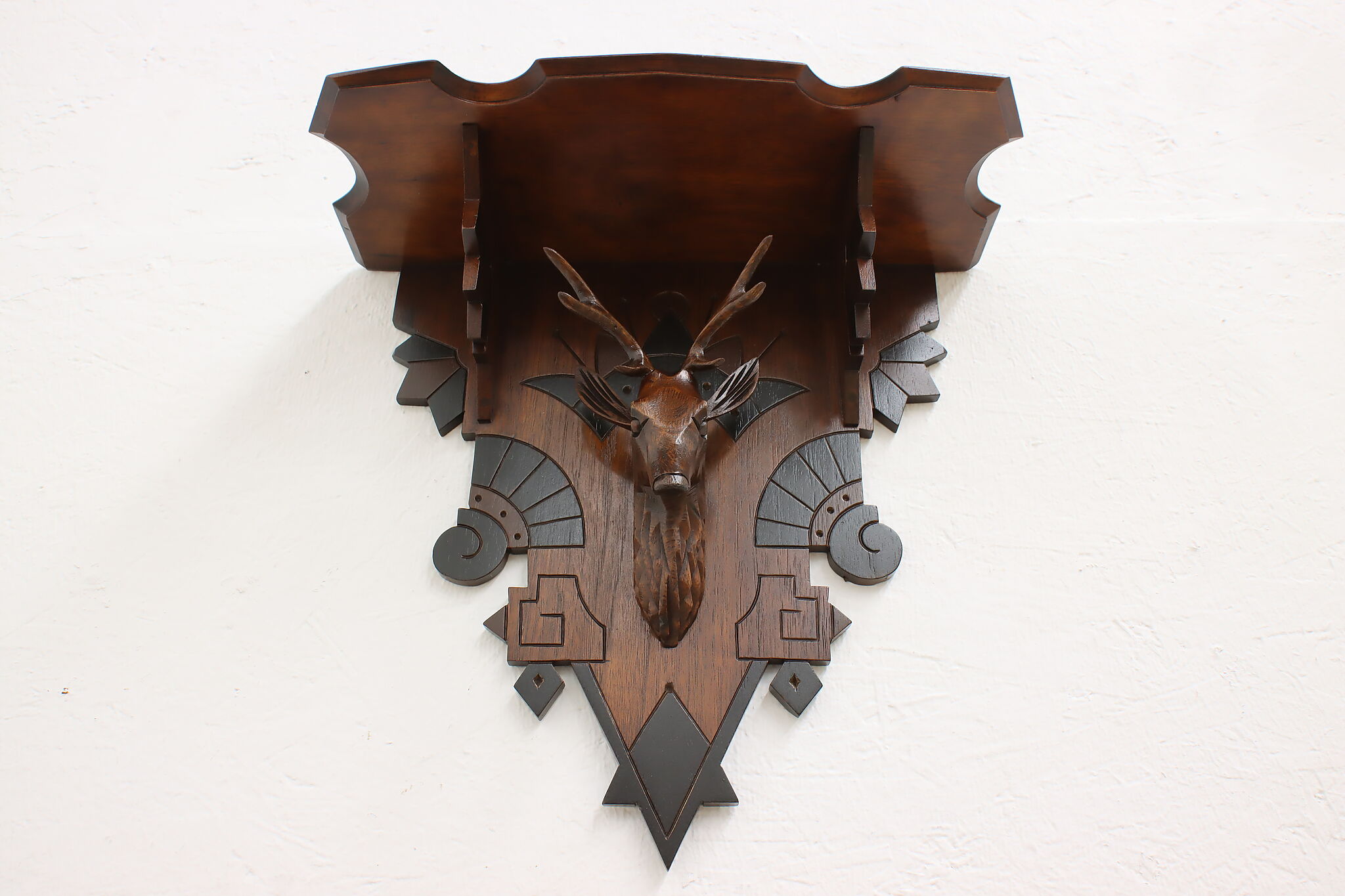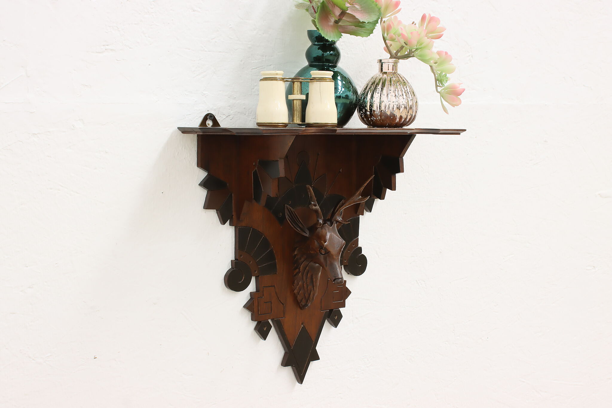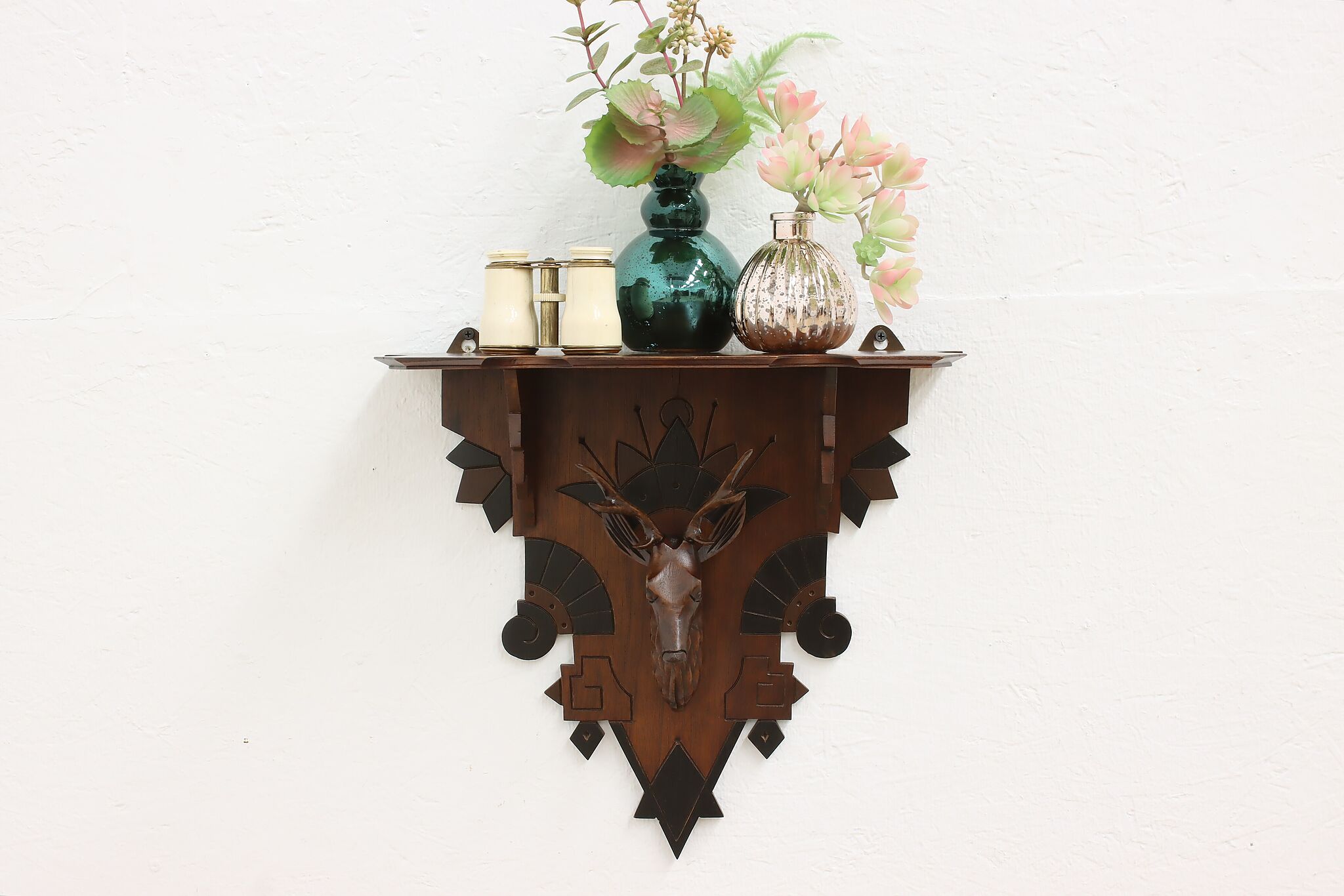 Placed in a cabin or hunting lodge, this wall shelf and its carved deer head is sure to bring luck for the yearly hunt!