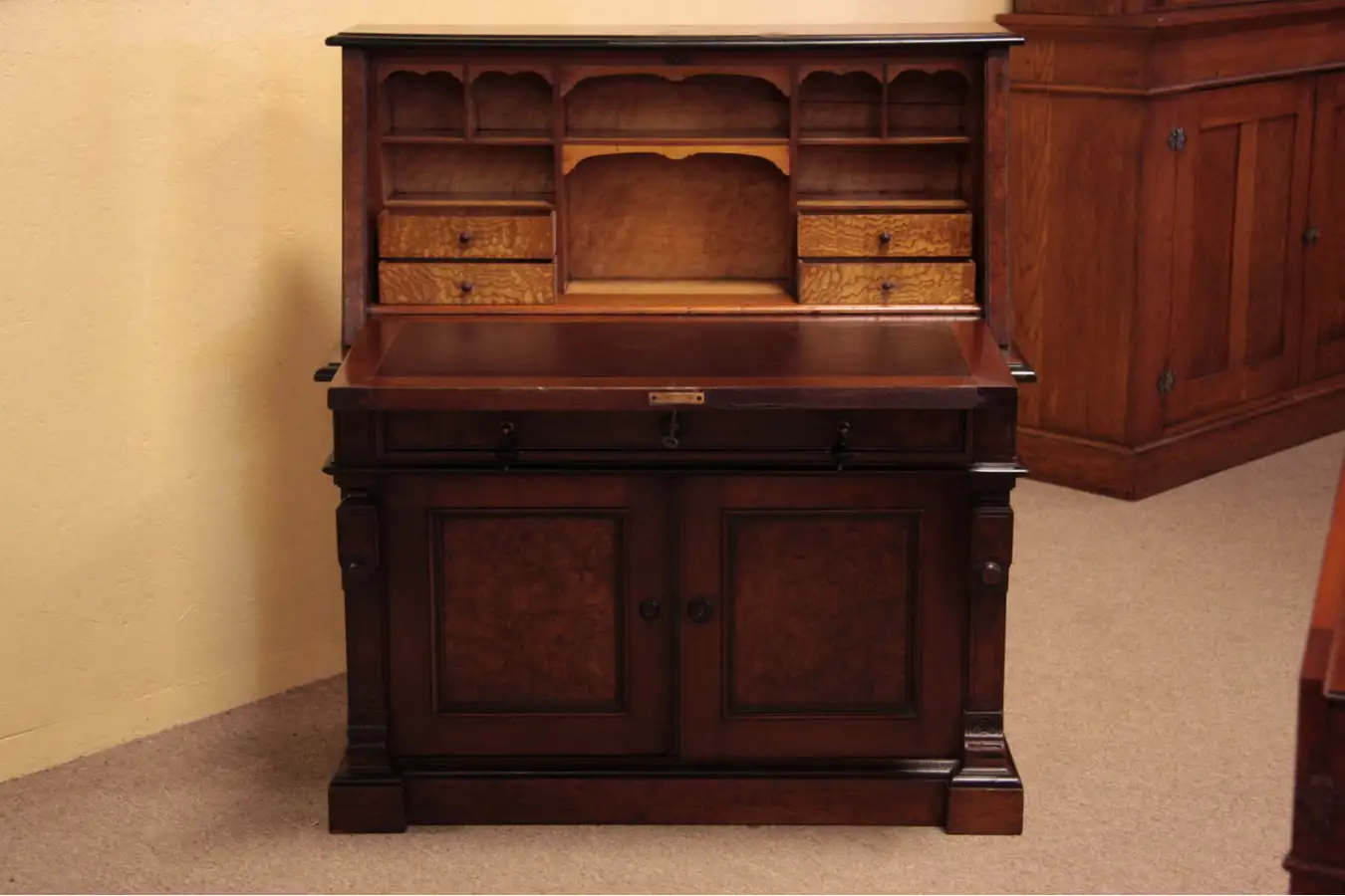 All drawers have exquisite hand-cut dovetail joints and there are visible square nails. The drop-down leather writing surface is sturdy and usable, and the golden interior has glowing and shimmering natural grain.