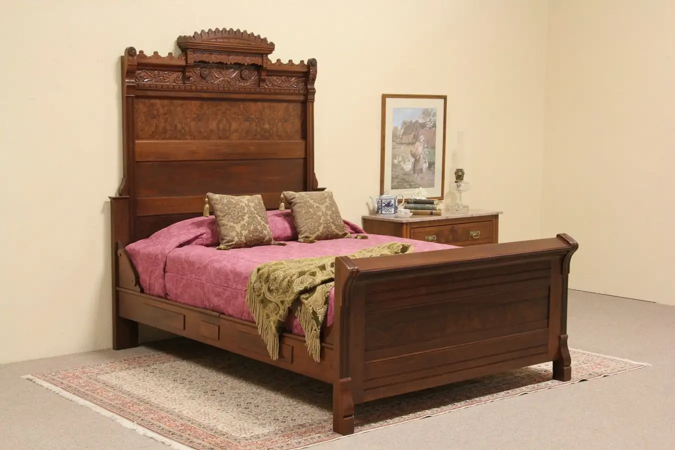 A spectacular Eastlake queen size bed was carved of solid walnut about 1880 at the end of the Victorian period. Richly detailed with incised "spoon" or chip carving, there are matched burl panels and geometric fluting.