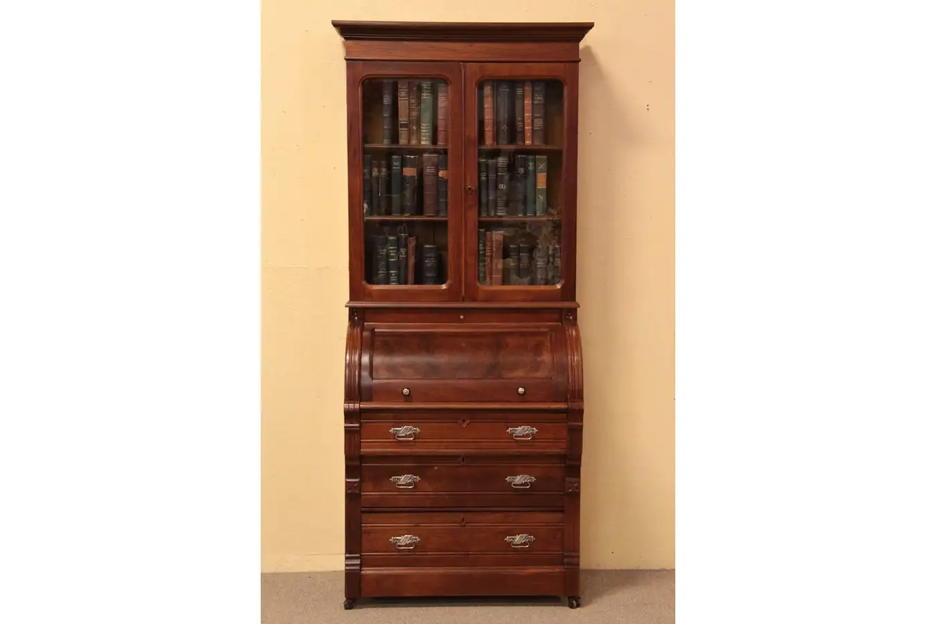 This classic Eastlake or late Victorian secretary desk has a barrel or cylinder roll top. Carved of solid walnut with burl panels about 1880, the warm finish is superb with wonderful golden patina and very little wear. Embossed nickel hardware is original.