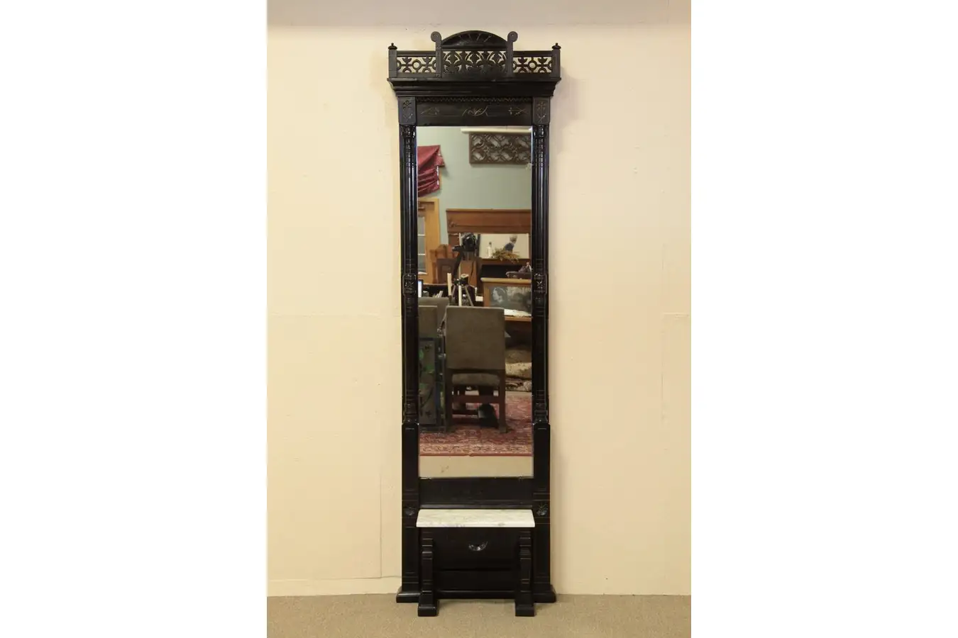 This hall or "pier" mirror has a marble shelf and the original ebony finish. It was crafted in the late Victorian or Eastlake period about 1875. Solid cherry, the original ebony finish is accented with subtle gold in the incised grooves and chip or "spoon" carving. There are small mars at the edges, but the finish is remarkable for its age. The marble shelf is also in very good condition on this American antique furniture.