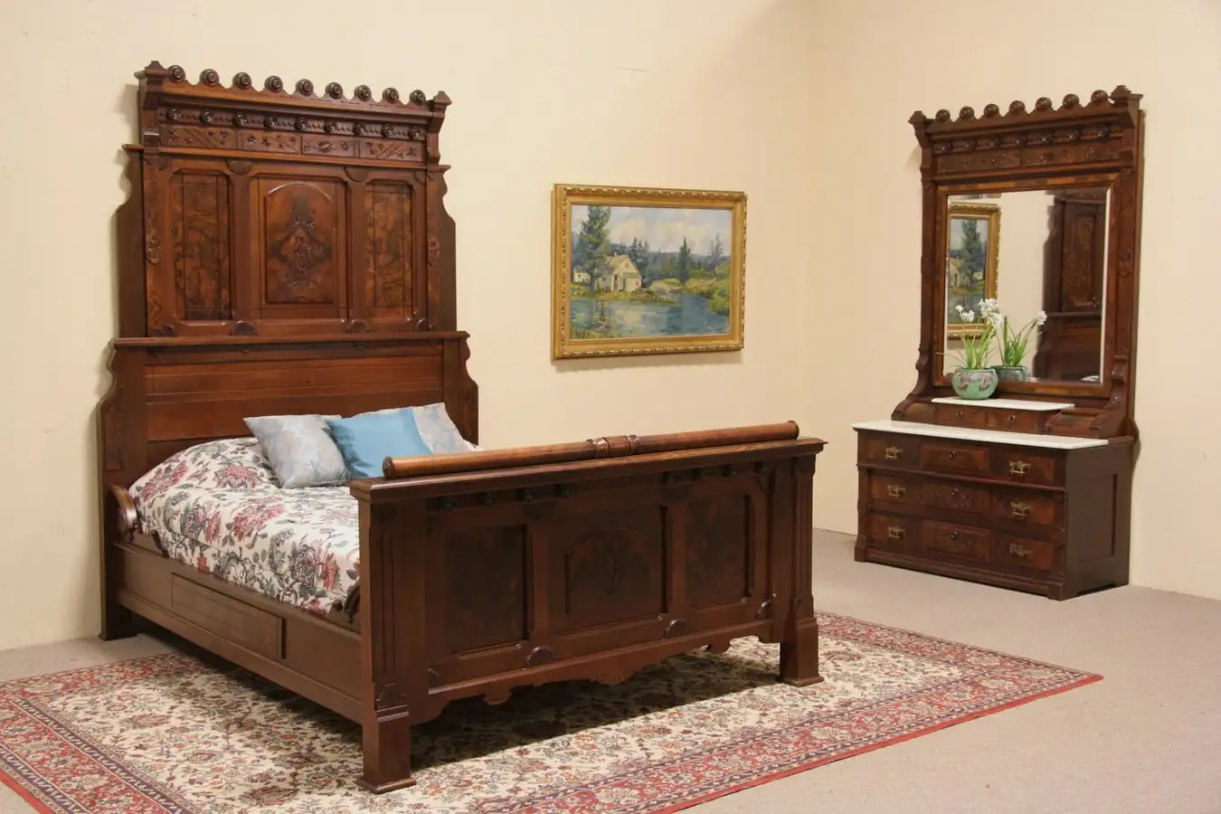 A spectacular late Victorian or Eastlake period bedroom set from about 1875 includes a tall carved bed that fits a queen size mattress as shown, and a marble top chest or dresser with swivel mirror.