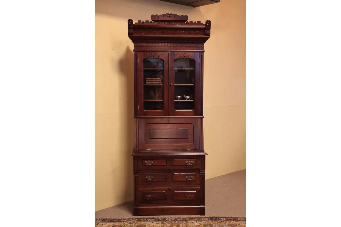 This distinctive late Victorian or Eastlake period secretary desk has a bookcase top. Made of solid walnut and dating from about 1885, there is incised "spoon" or chip carving, characteristic of the era. The gleaming finish is superb, and the drop front opens to tiny cubicles and a drawer. There are a few ink stains inside. The removable upper bookcase has adjustable wooden shelves and original wavy glass in the doors. Below are dovetailed drawers, and square nails are visible on the backside.