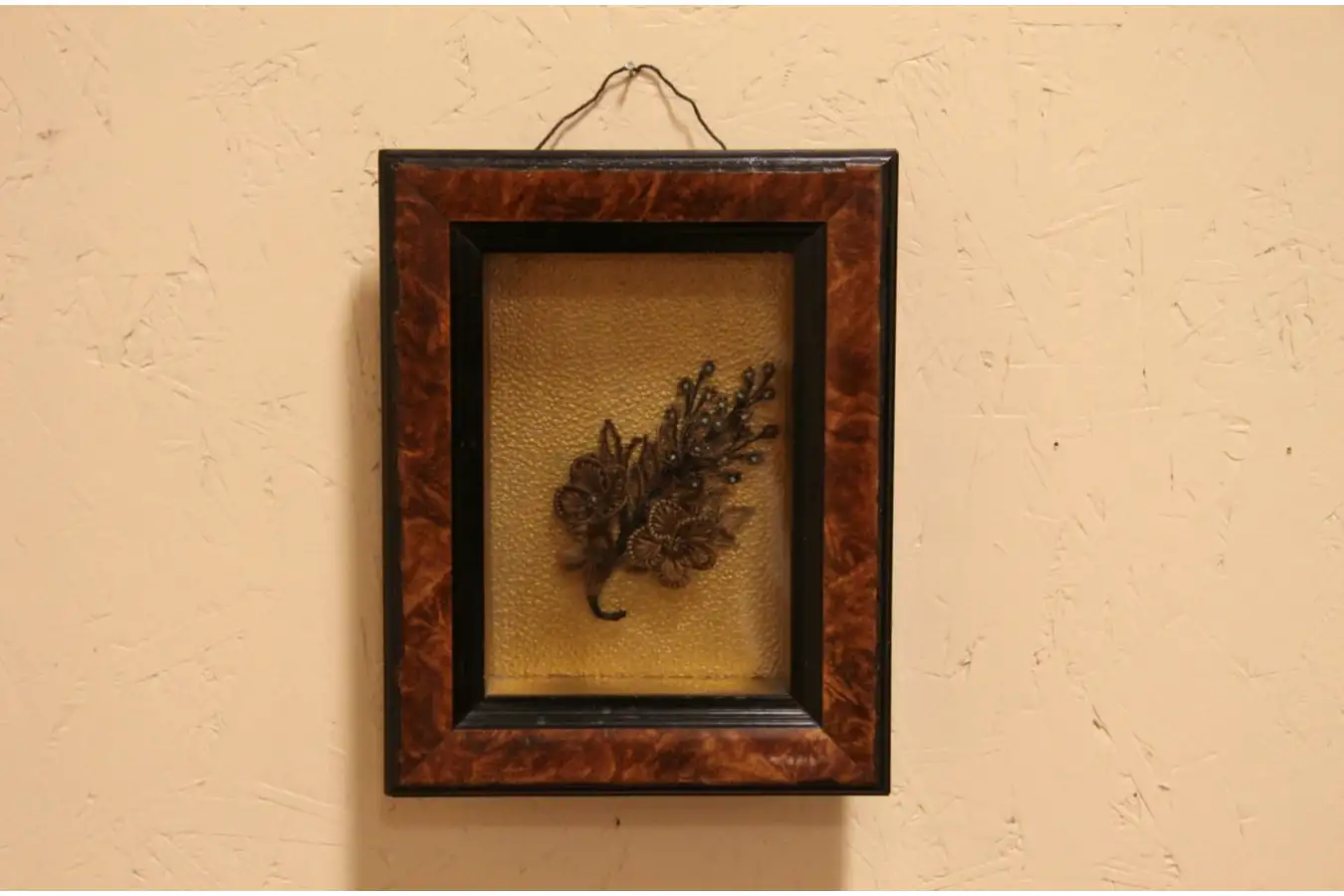 This Victorian era shadowbox houses a traditional hair wreath, a hand crafted memento of locks of hair, delicately worked into an arrangement with glass beads. In the 19th Century, locks of hair from family and loved ones were sentimental keepsakes, kept in lockets and "wreaths" like this.