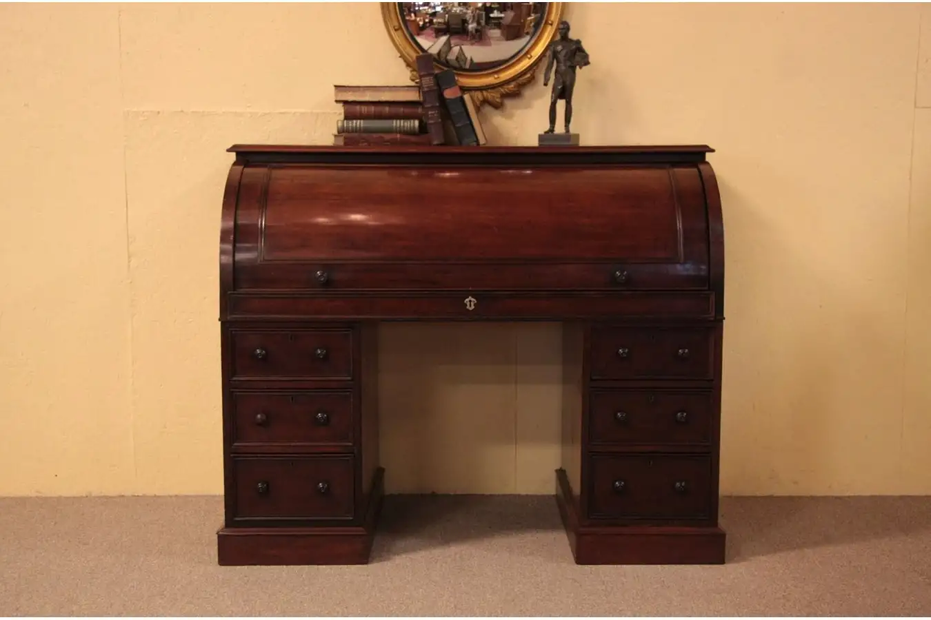 Hand-made about 1880, this Dickensian Victorian cylinder or barrel roll top desk is beautifully worn. The original finish is very good with lots of patina - stains, scratches and mars from well over a century of use.