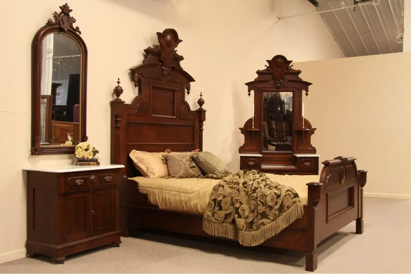 A spectacular Victorian period 3 piece bedroom set includes a dresser with mirror and a small commode or bedside chest, both with marble tops, plus a bed adapted to queen size.