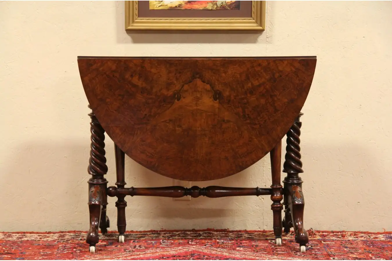 Hand crafted of solid walnut with delicate details on the base, the top is gorgeous matched "oyster" burl. The gleaming top has warm antique patina and has been revarnished for durability, the base and marvelous spiral columns are original and very well preserved. Porcelain wheels are original on this enchanting historic furniture from England.