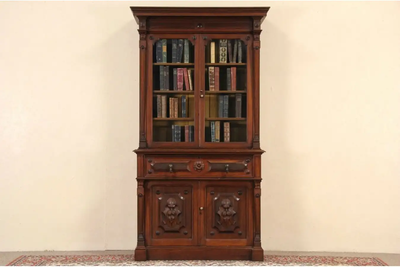 A stately secretary desk with a bookcase top was hand carved about 1860 during the Victorian Renaissance period. Walnuts with leaves and crests plus classical motifs are three dimensional on this American made furniture.