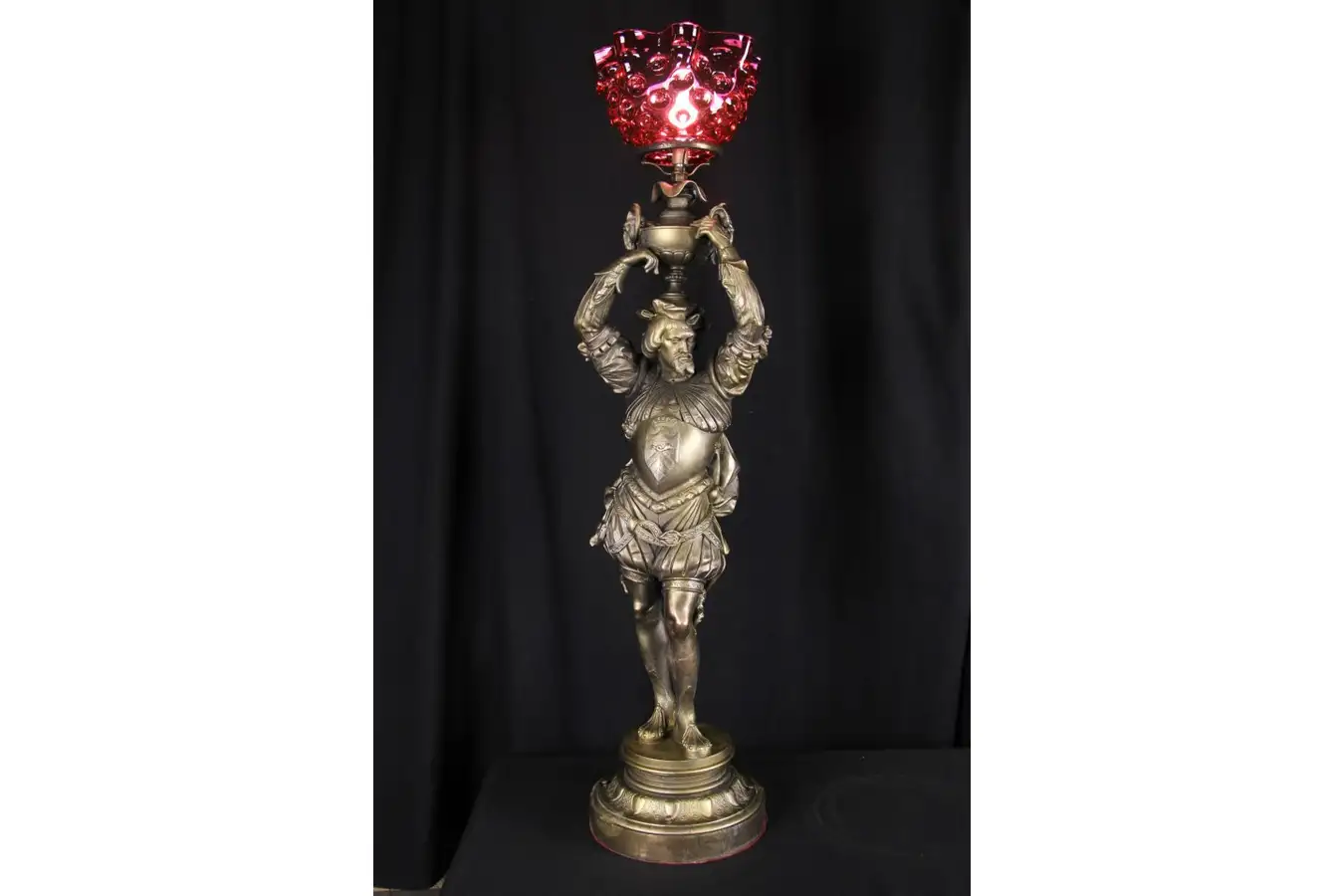 A Victorian Renaissance newel post light from around 1880 has a cranberry hobnail shade. The statue of a cavalier wearing his family crest supports a font with ram heads.