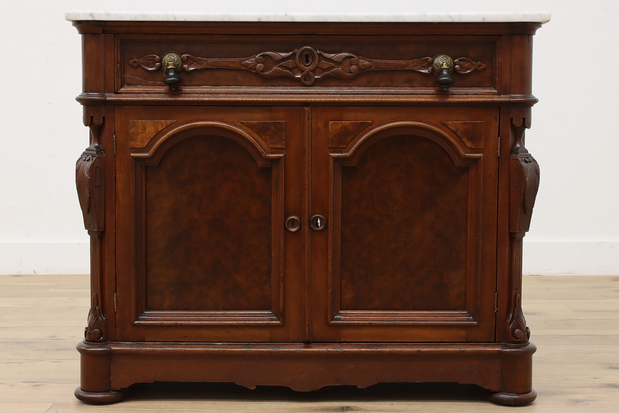 A Victorian Renaissance period nightstand or sink vanity has a beautiful white marble top.