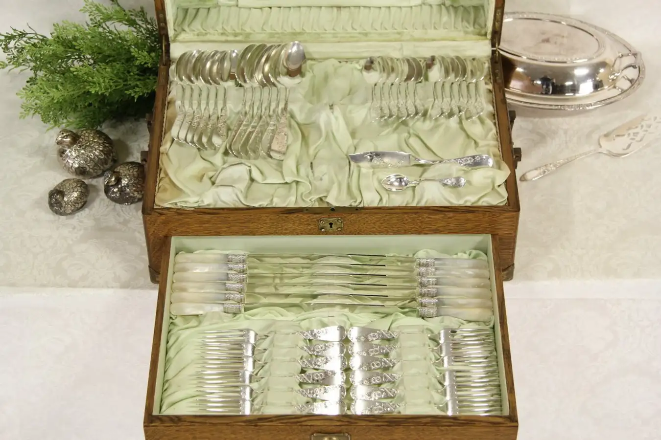 Twelve 9" dinner knives with genuine mother of pearl handles and silverplate blades signed "Towle" silversmiths. There is some darkening of the pearl next to the shanks as is typical, see photos. The upholstered chest is signed by a Baraboo, Wisconsin jeweler, and has some wear an stains as shown. Solid quarter sawn oak with brass mounts, there is a brass presentation plaque that was not engraved. There is no key to the chest, size is 19" wide, 13" deep and 9" tall.