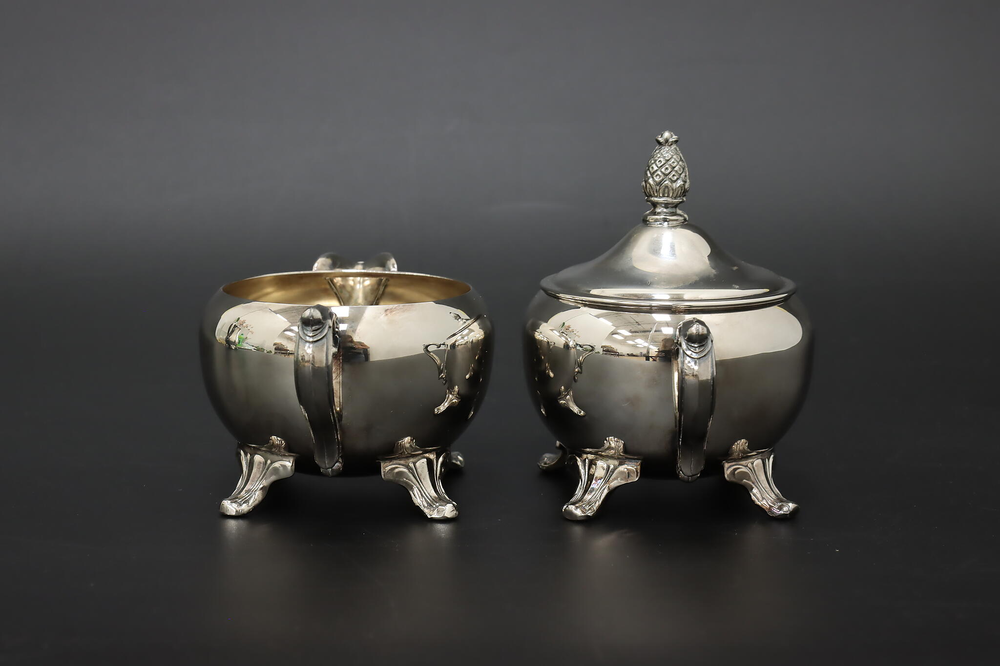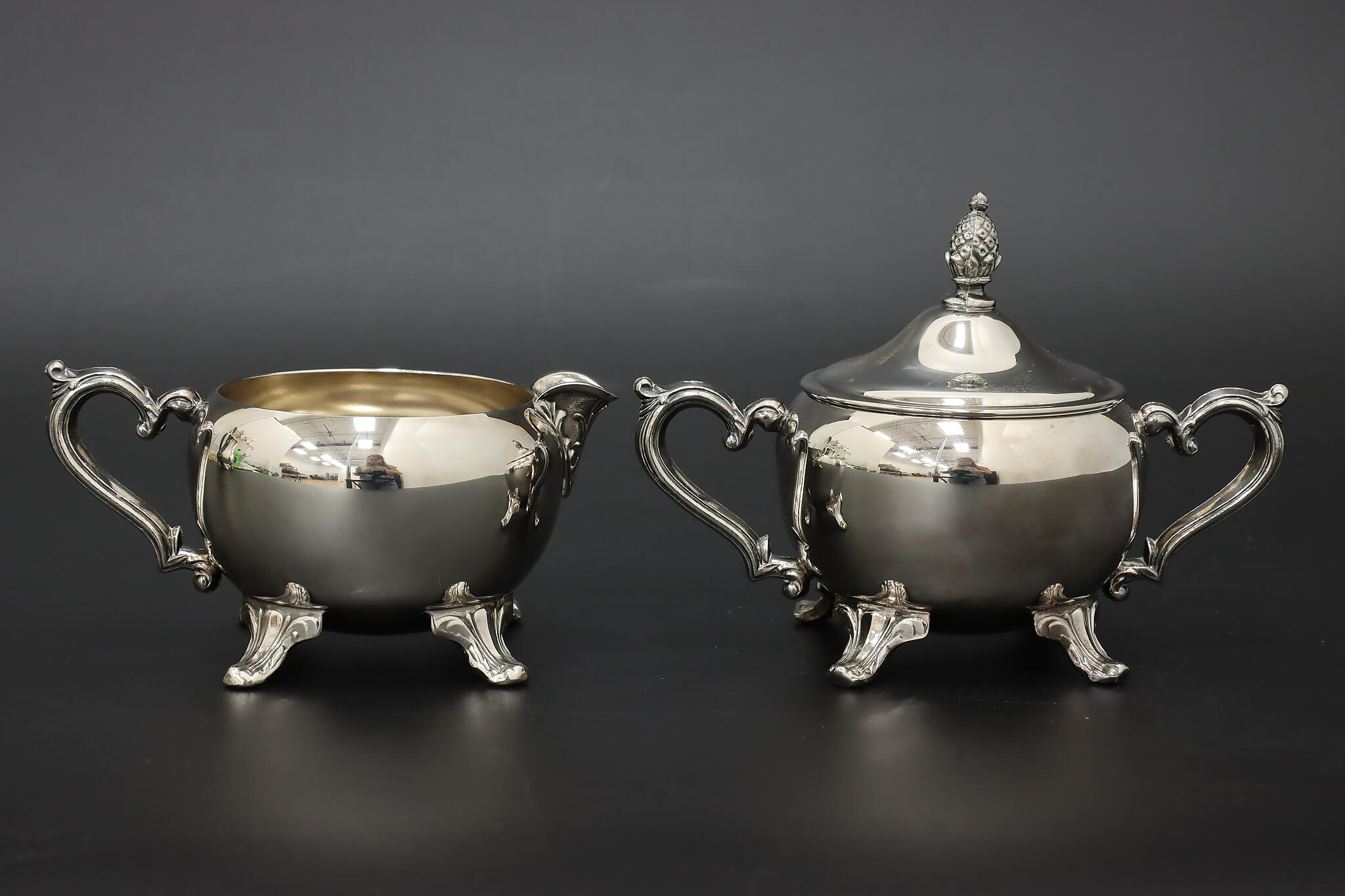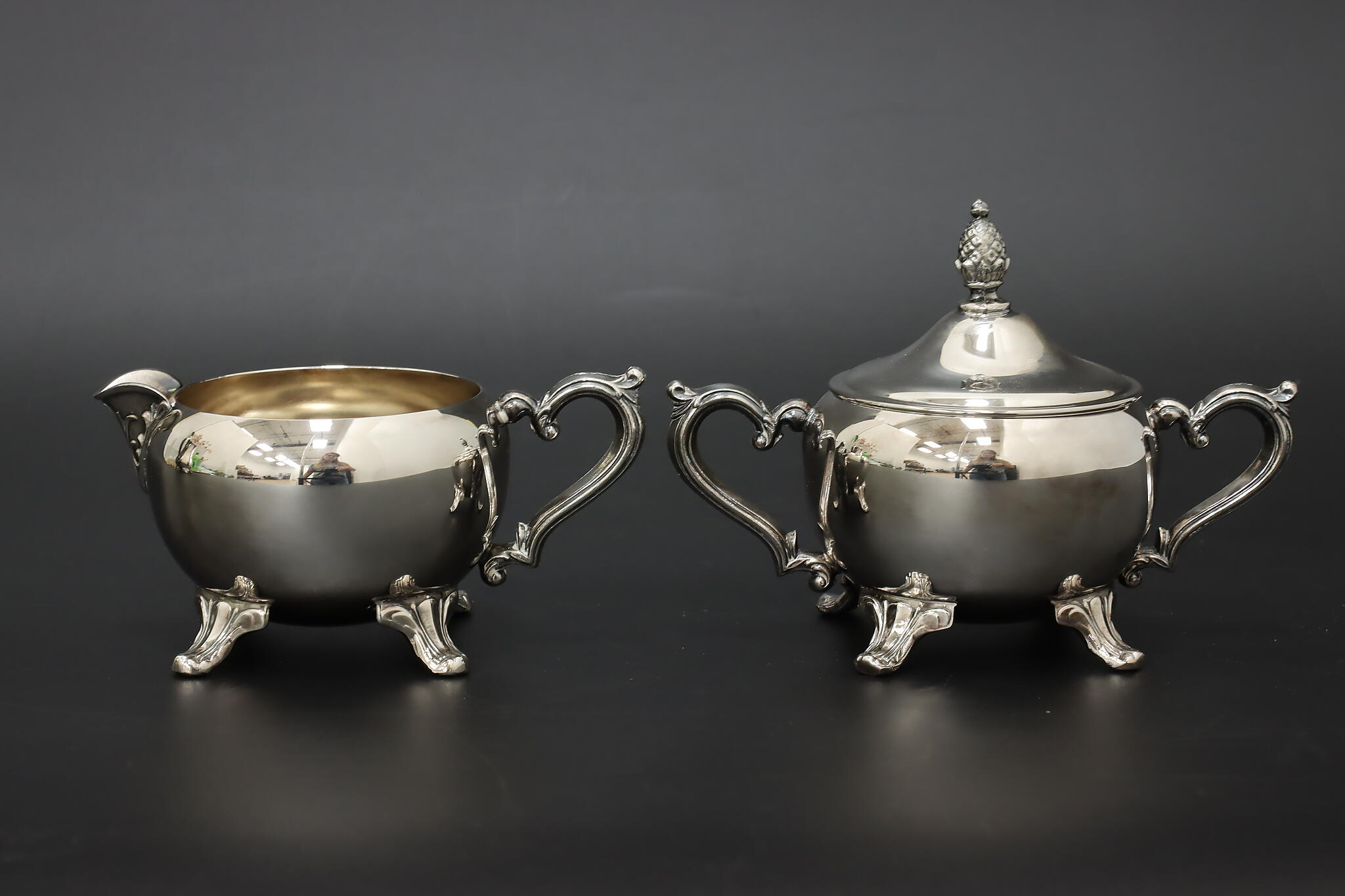 Tea pot size is 9.5" wide, 5" deep and 10' tall. Sugar bowl size is 6.5" wide, 3.5" deep and 5" tall. Creamer size is 5.5" wide, 4" deep and 3" tall.