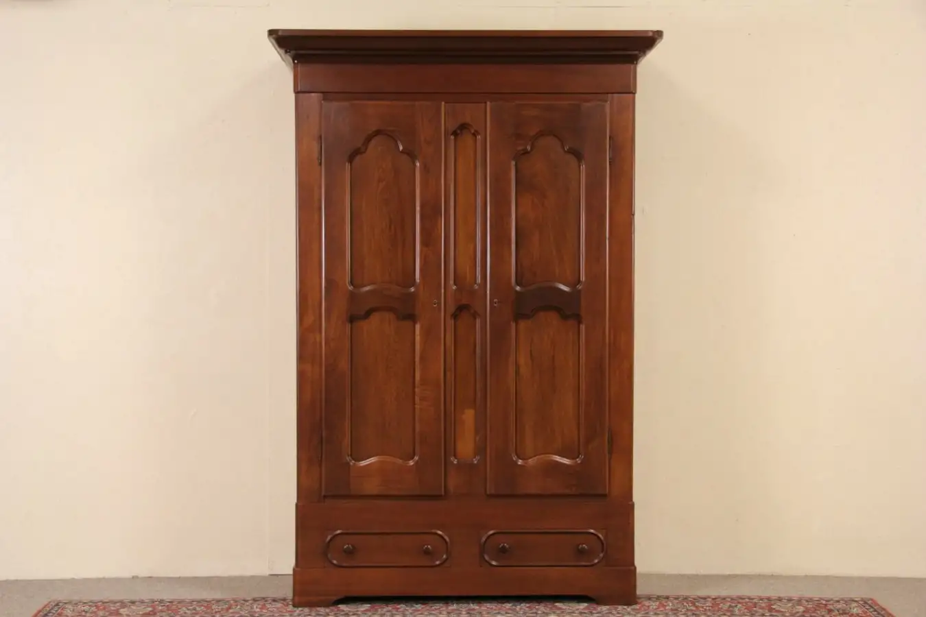 There is a stenciled signature on the back, "Louis Ottenad, St. Louis." American made antique furniture, drawers have hand cut dovetail joints. This historic armoire disassembles for moving. There is a removable center divider and shelf. Later modern standards for adjustable shelves could have shelves made to fit or a closet pole could be installed if desired. Doors have original lift off hinges and later working locks and keys.
