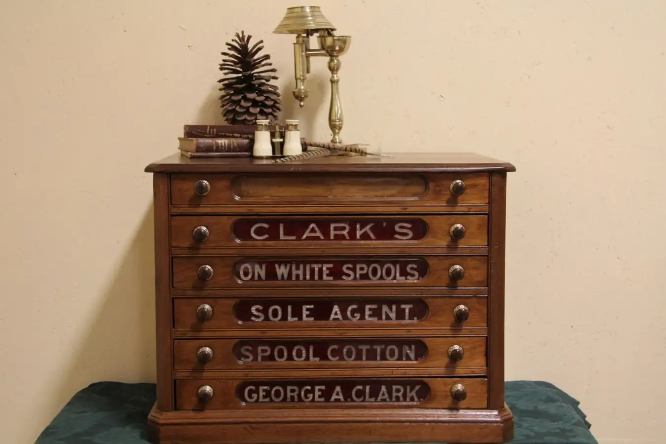 An authentic 1885 era general store spool cabinet held thread for sale, and would now make a nice jewelry cabinet. The drawer fronts have original red stained glass inserts that are carved with "Clark" insignias, one is missing and one has a crack, see photos.