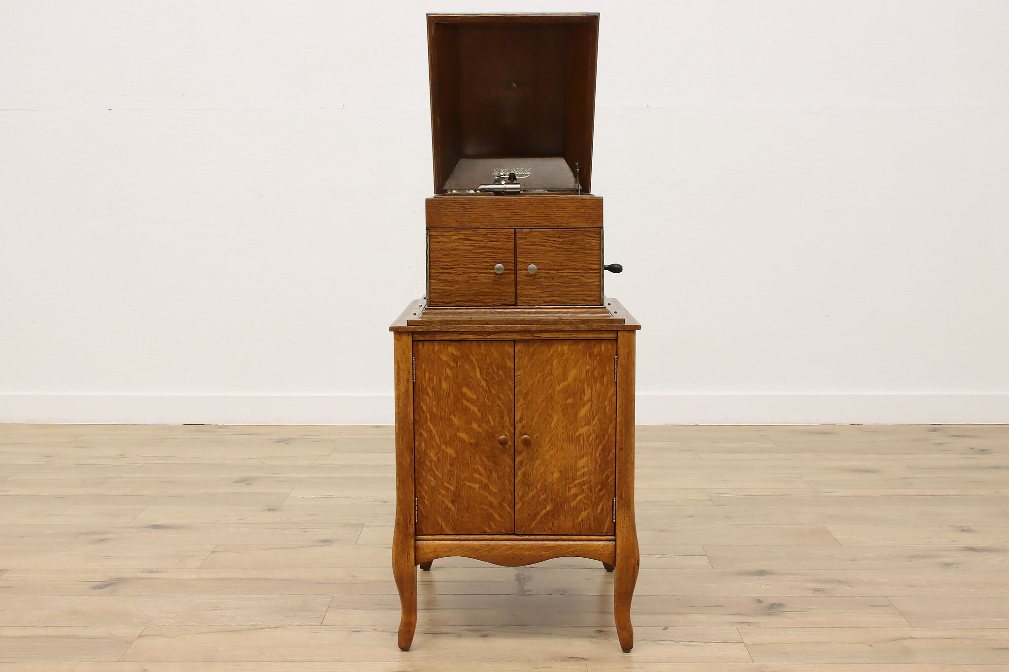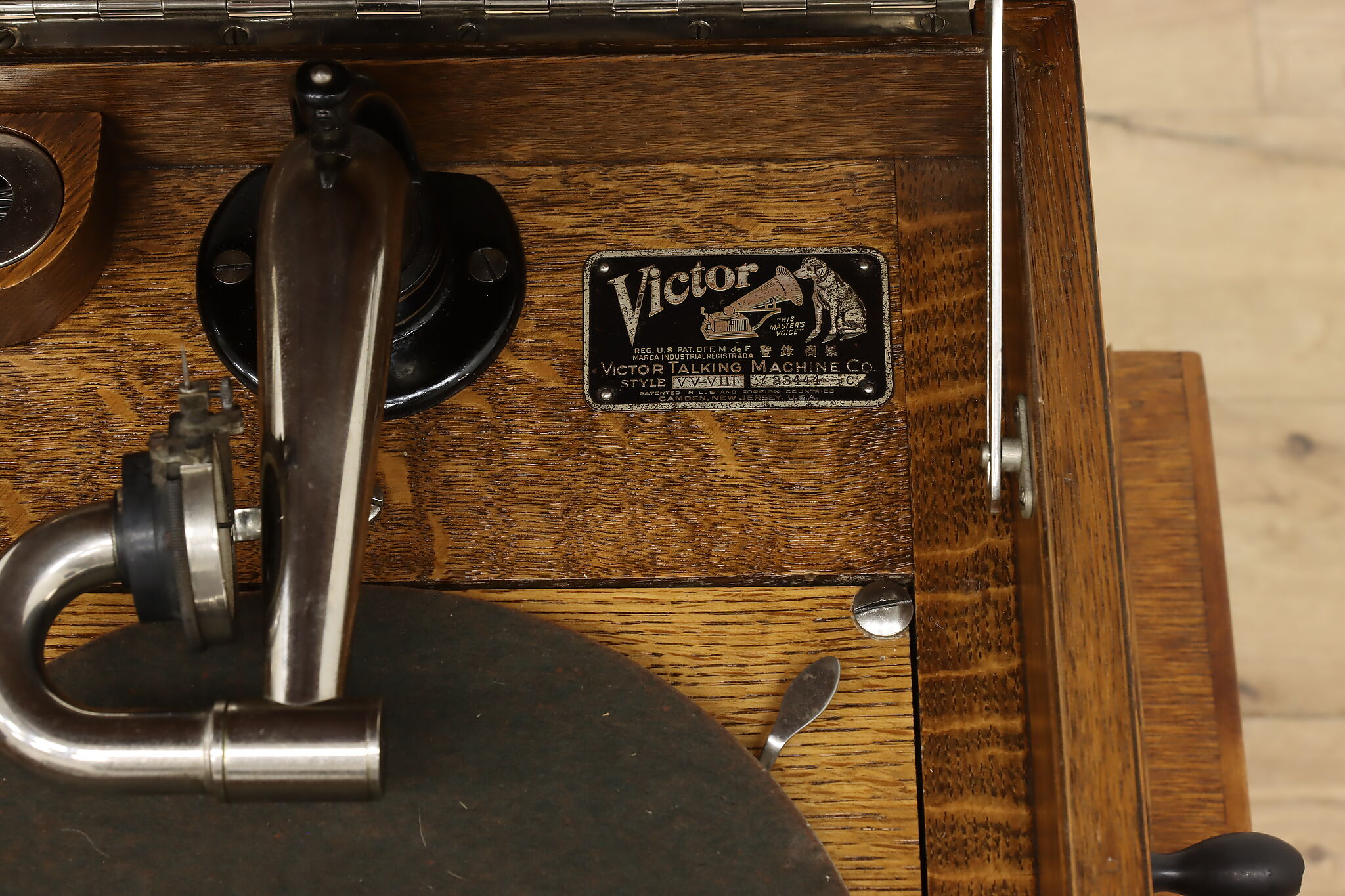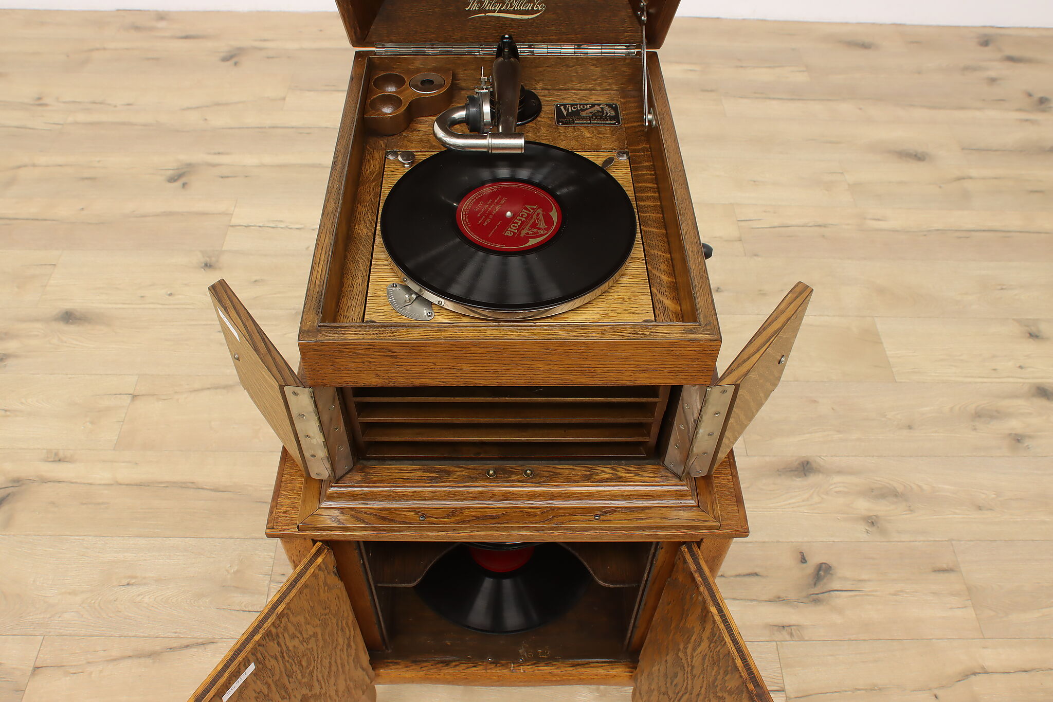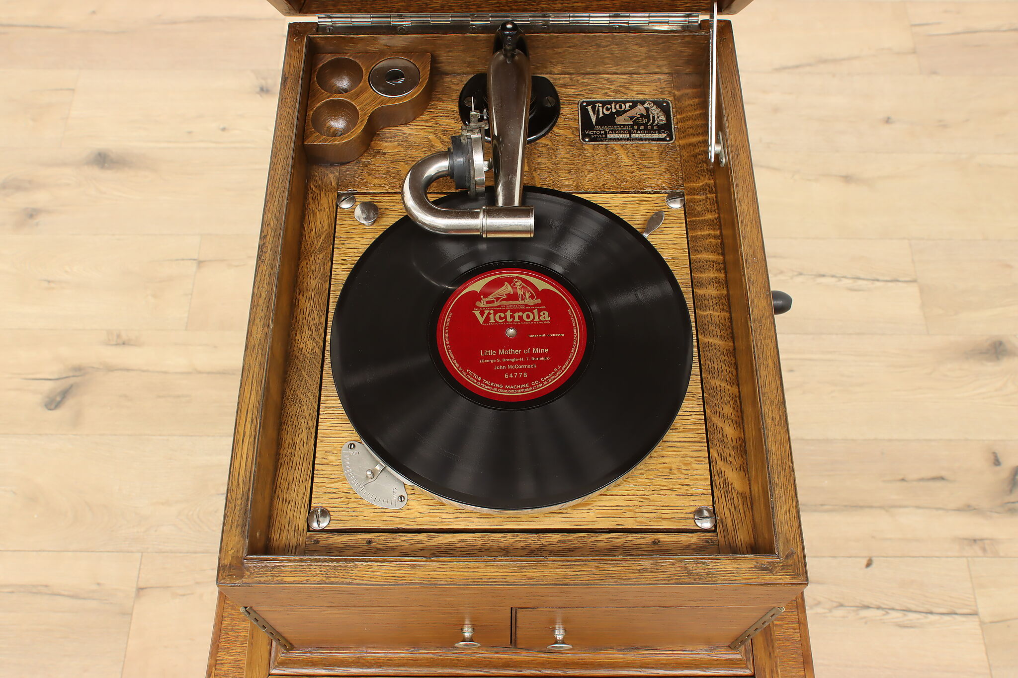 This tabletop phonograph still works great after 100 years, keep it on top of its cabinet base and enjoy classic tunes with this "Victor Talking Machine."