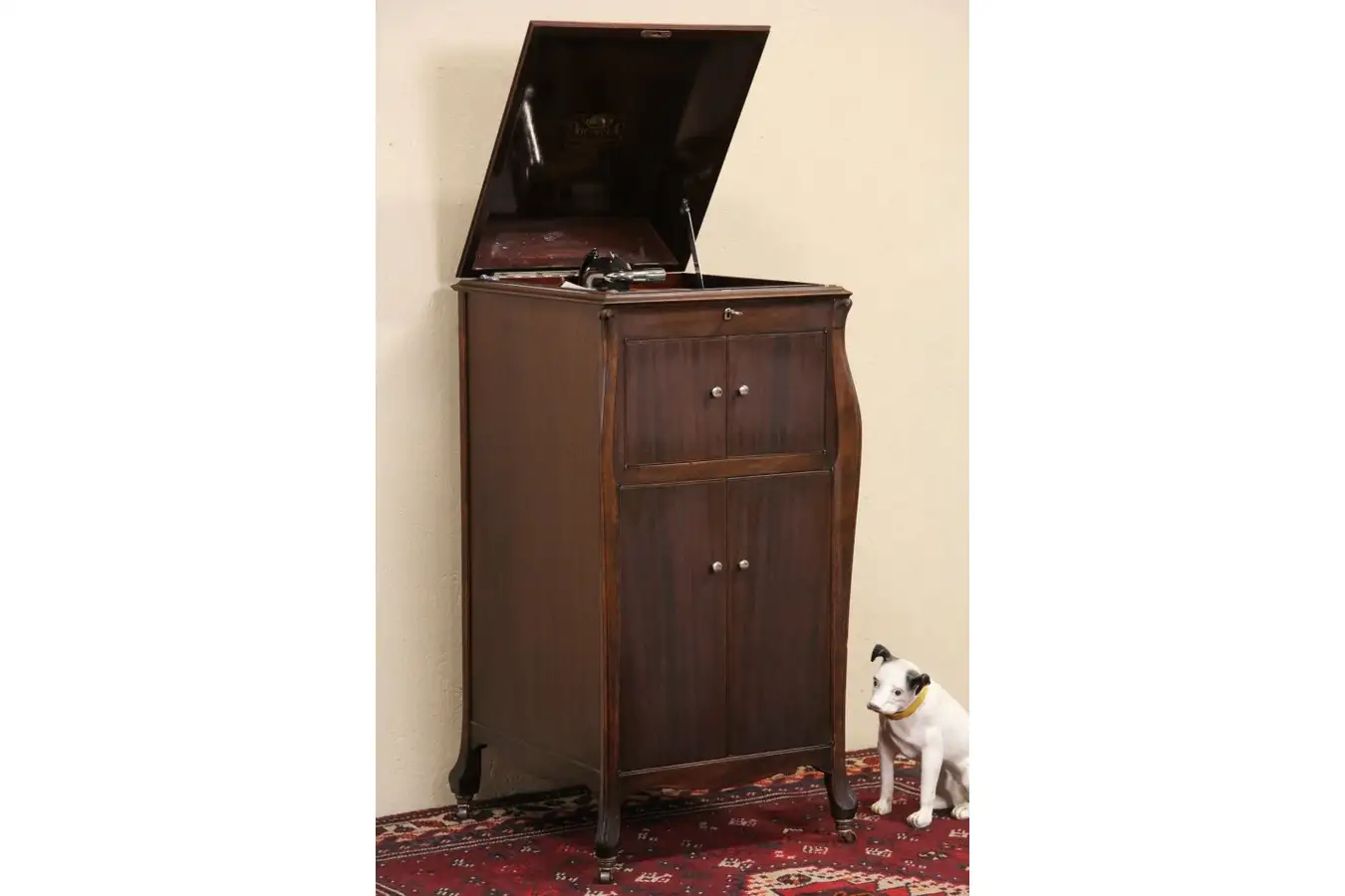 A "Victrola" is all original in beautiful working condition, the original owner's manual is dated "2/14/21." The mahogany floor model "VI-100" case has an original finish with some fading and crackling or crazing from age, see photos.