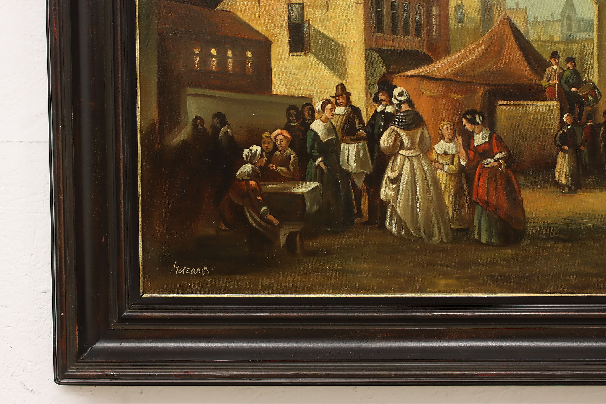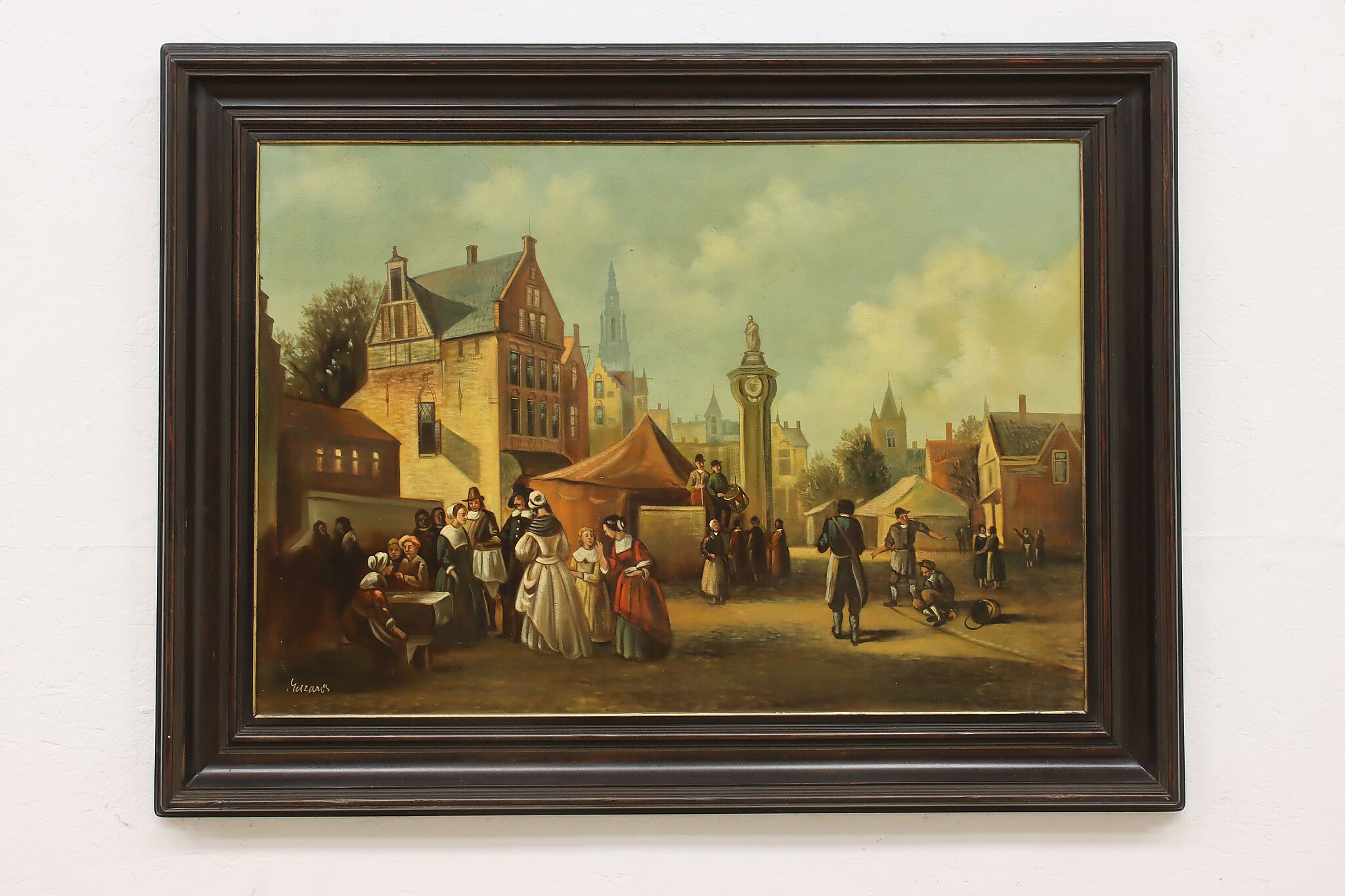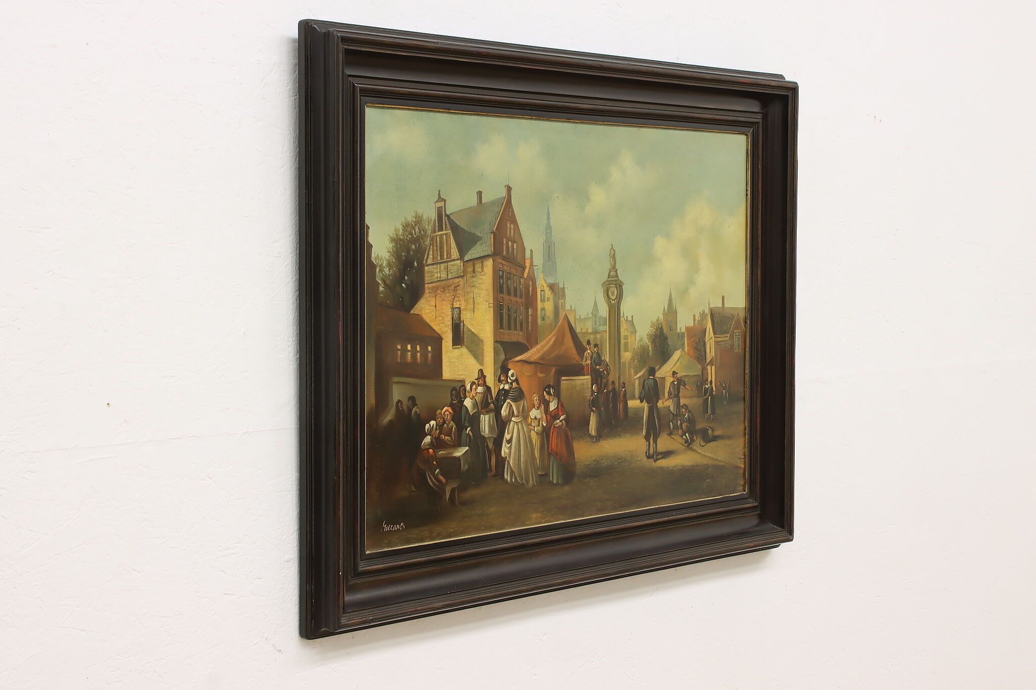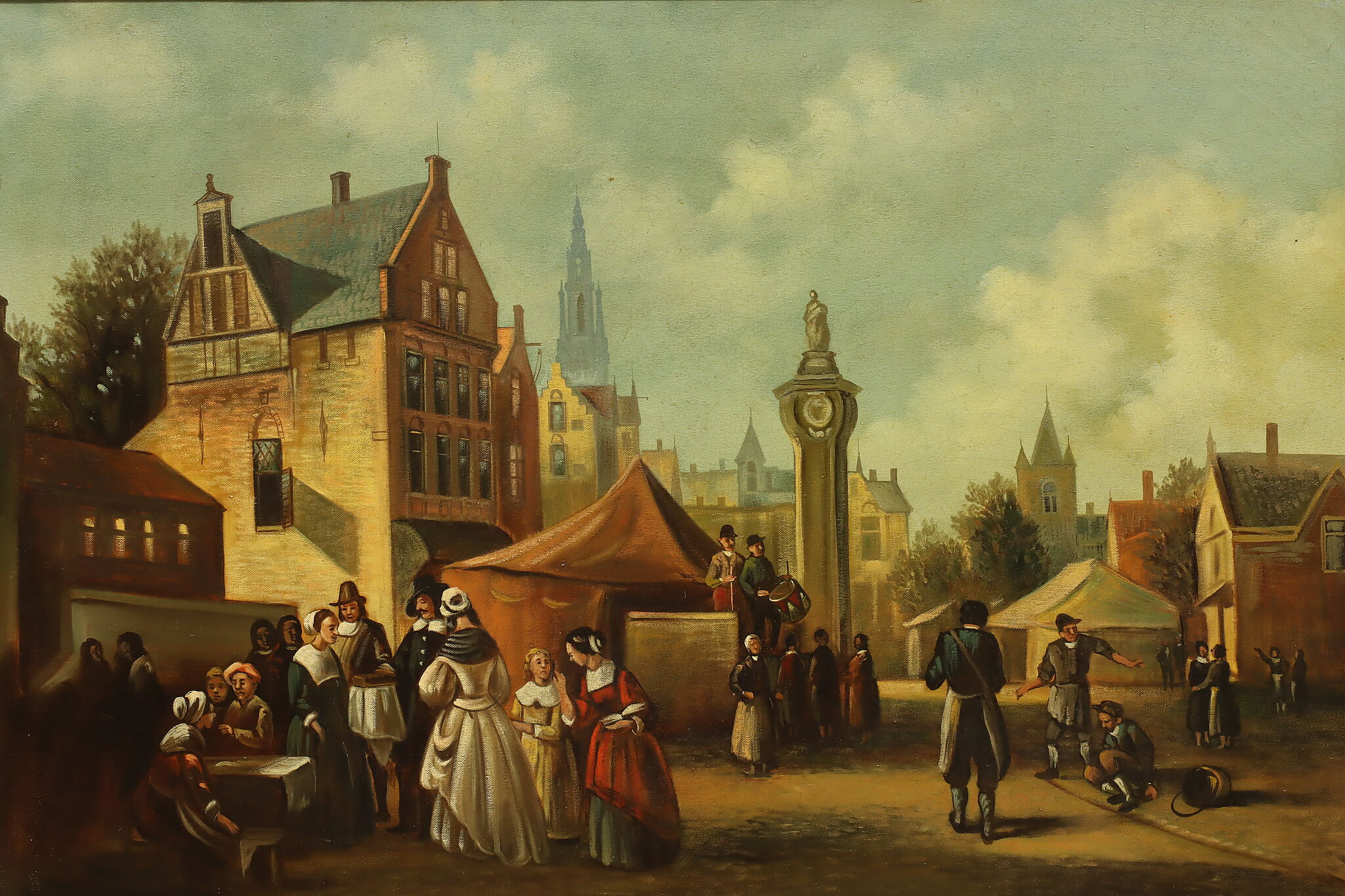 The villagers gather around musicians in their village center for a lovely day of music in this Flemish Old Masters style painting.