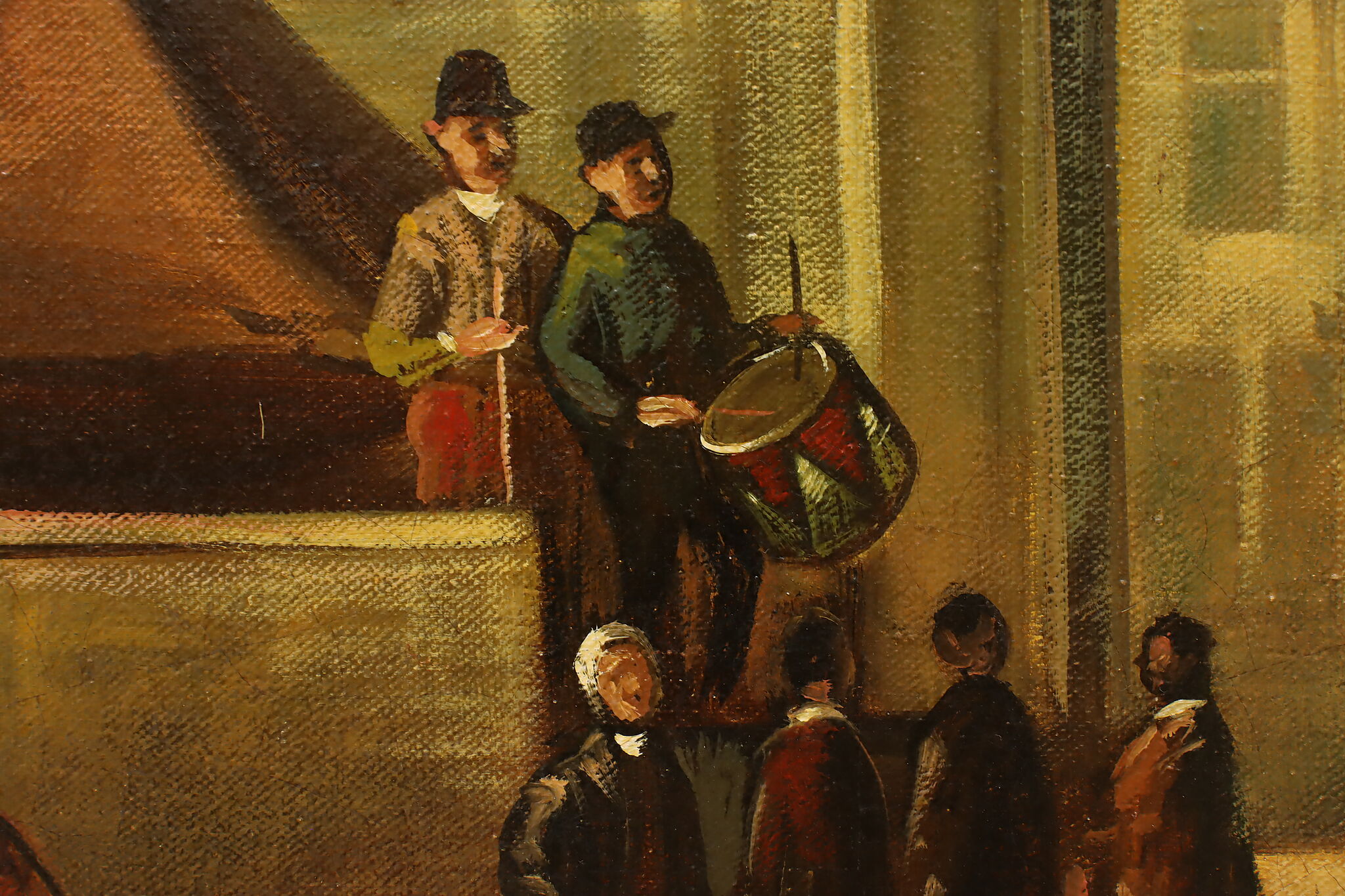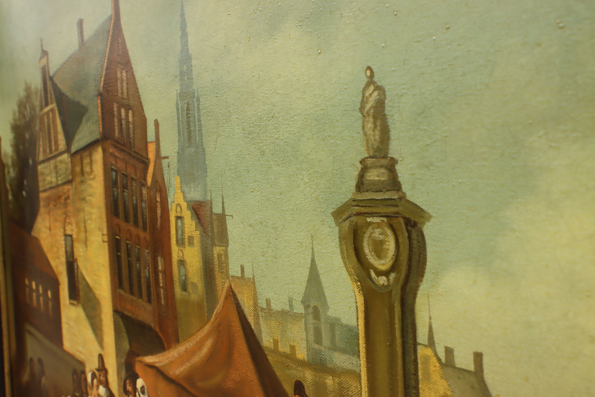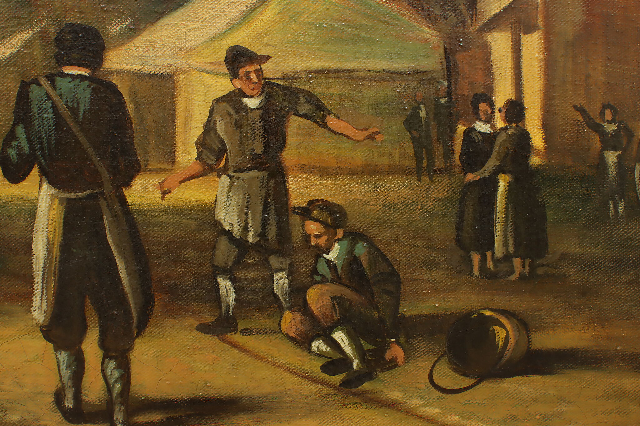 The villagers gather around musicians in their village center for a lovely day of music in this Flemish Old Masters style painting.