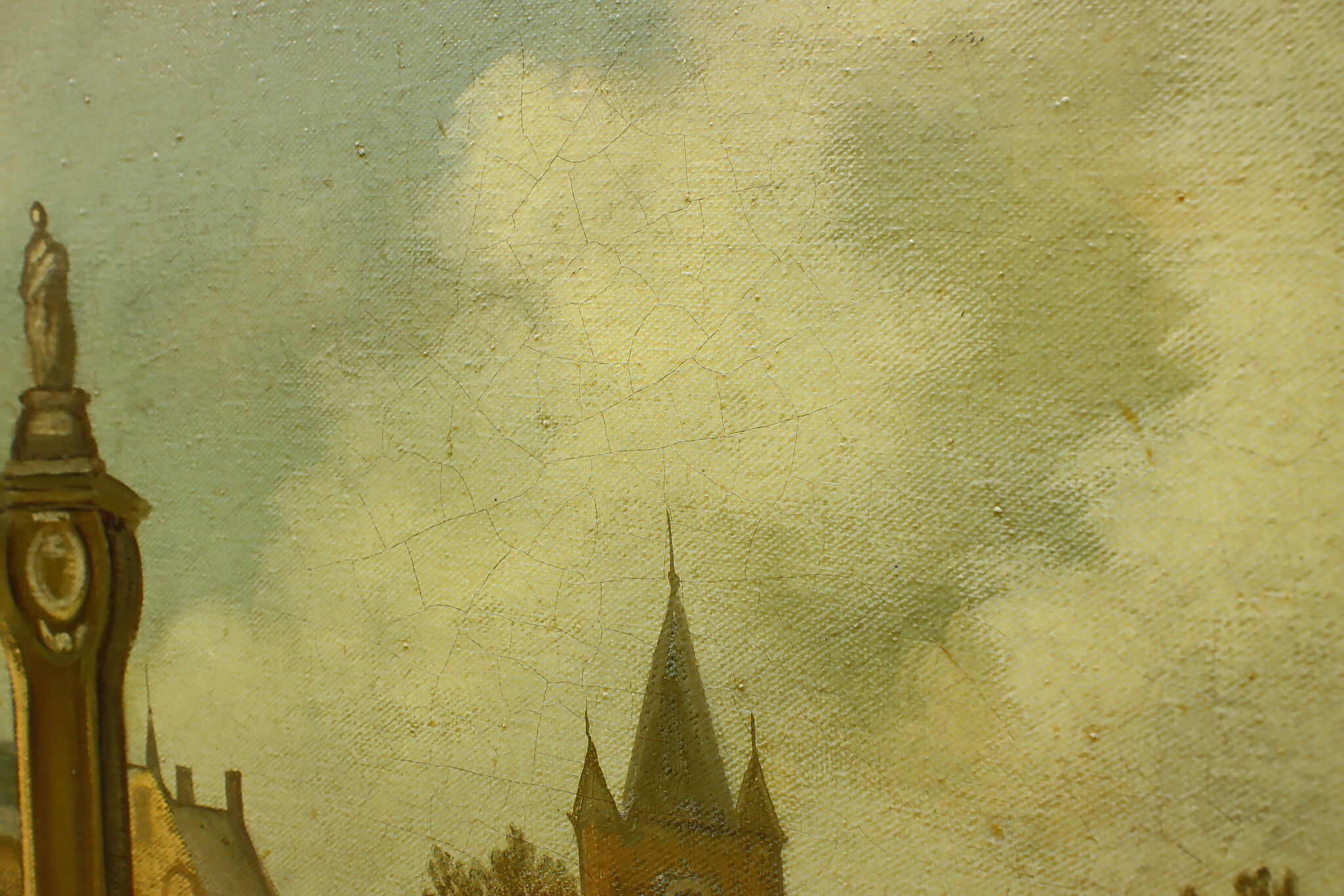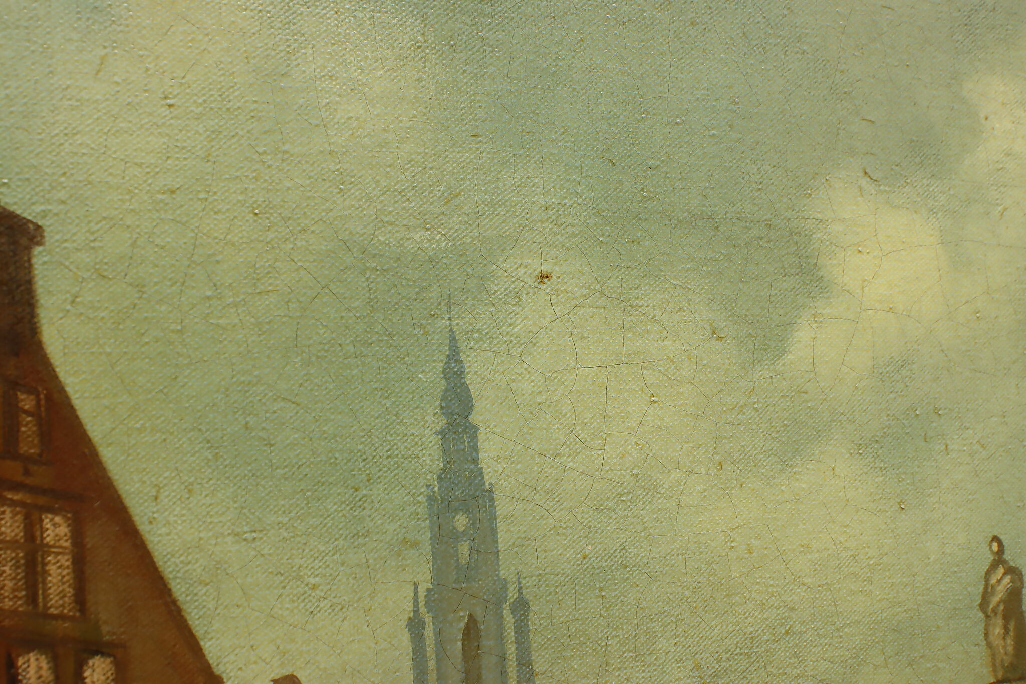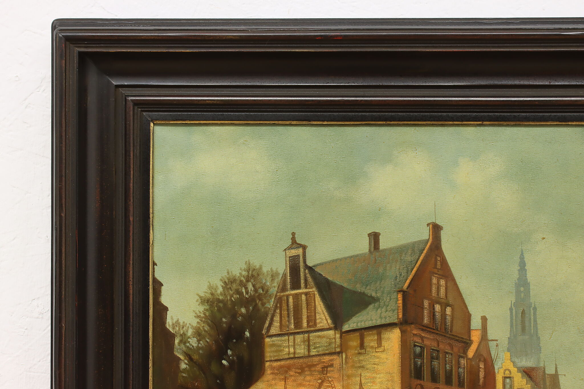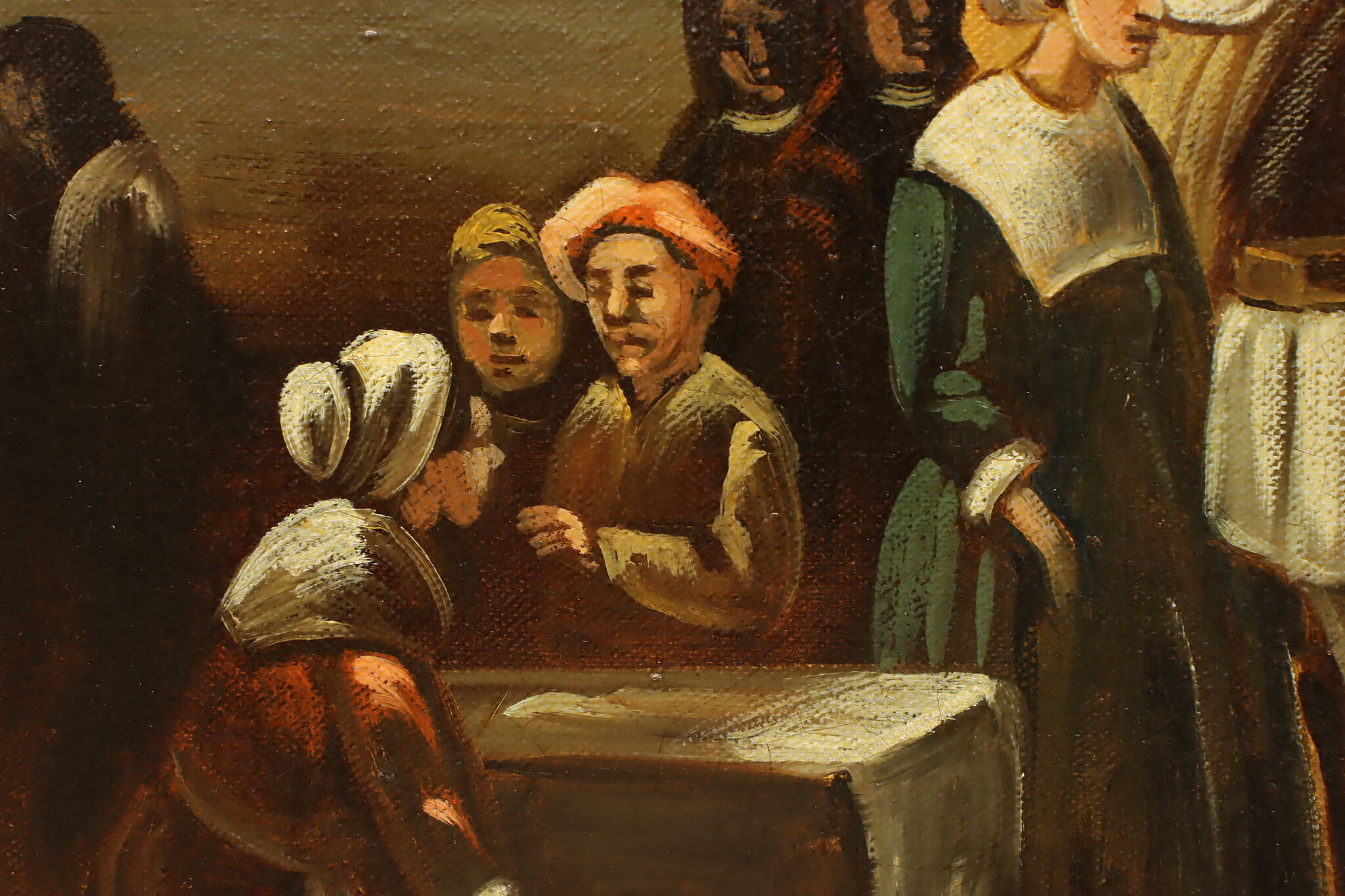 The villagers gather around musicians in their village center for a lovely day of music in this Flemish Old Masters style painting.