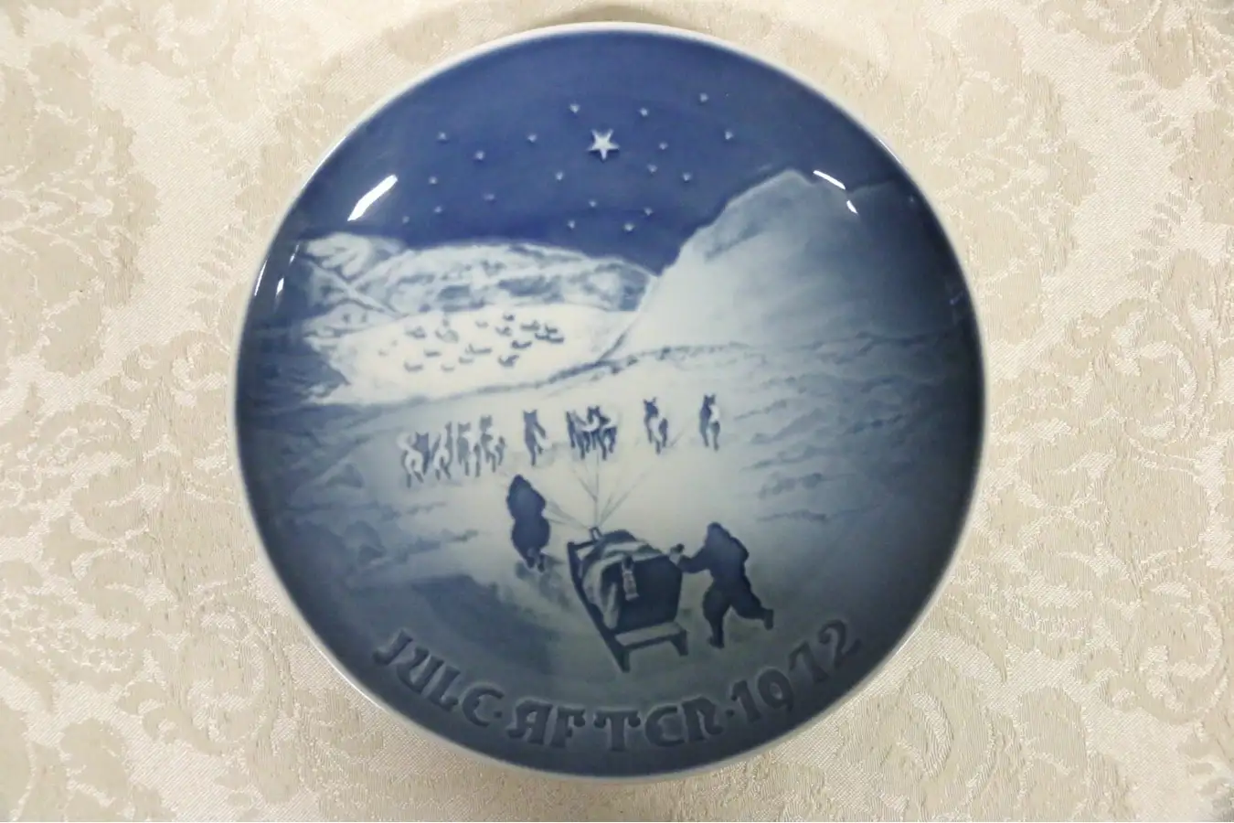 VINTAGE 1972 BING & GRONDAHL BLUE CHRISTMAS PLATE B&G DOG SLED SCENE MEASURES 7" AND IS UNDAMAGED.
